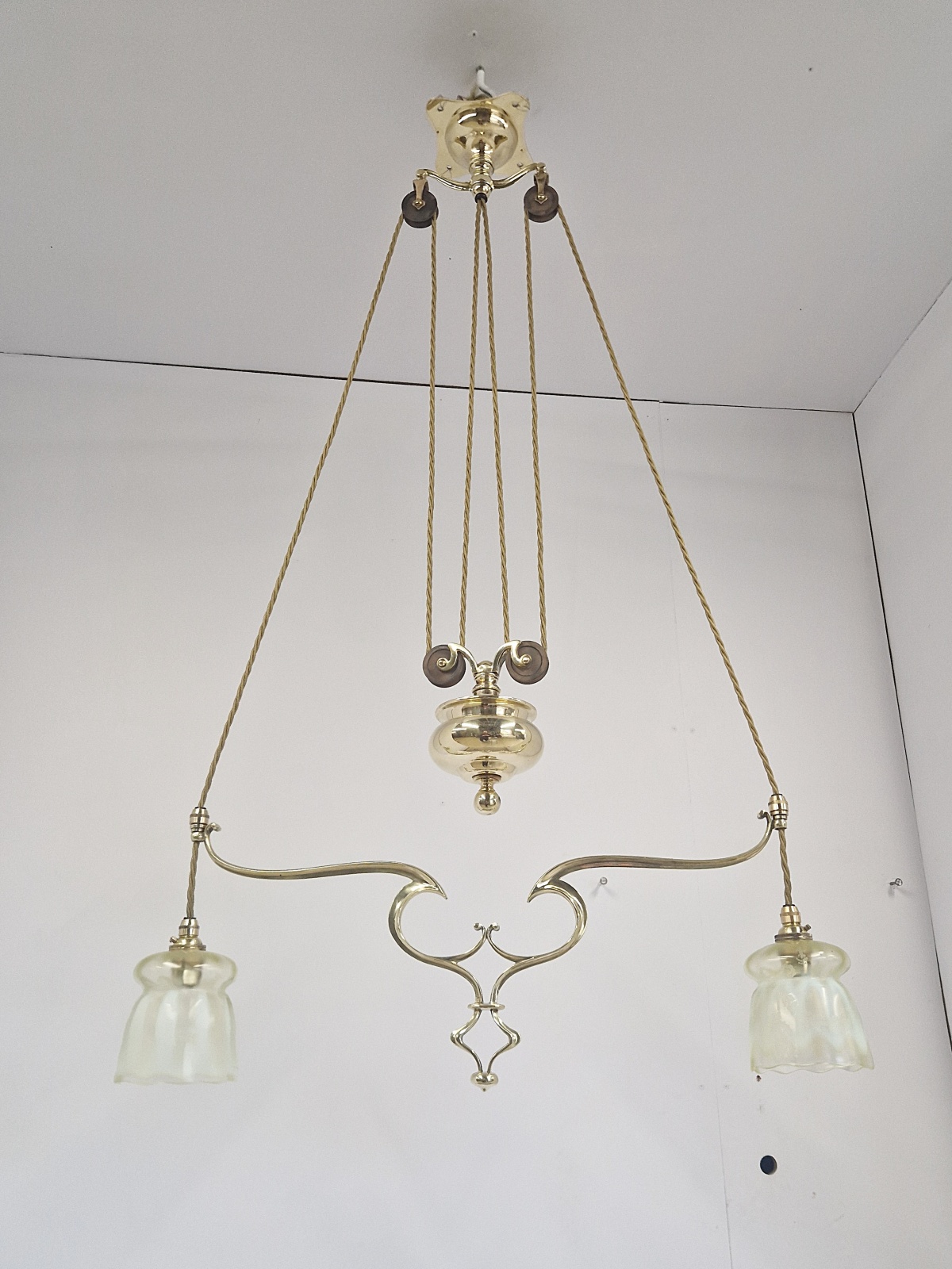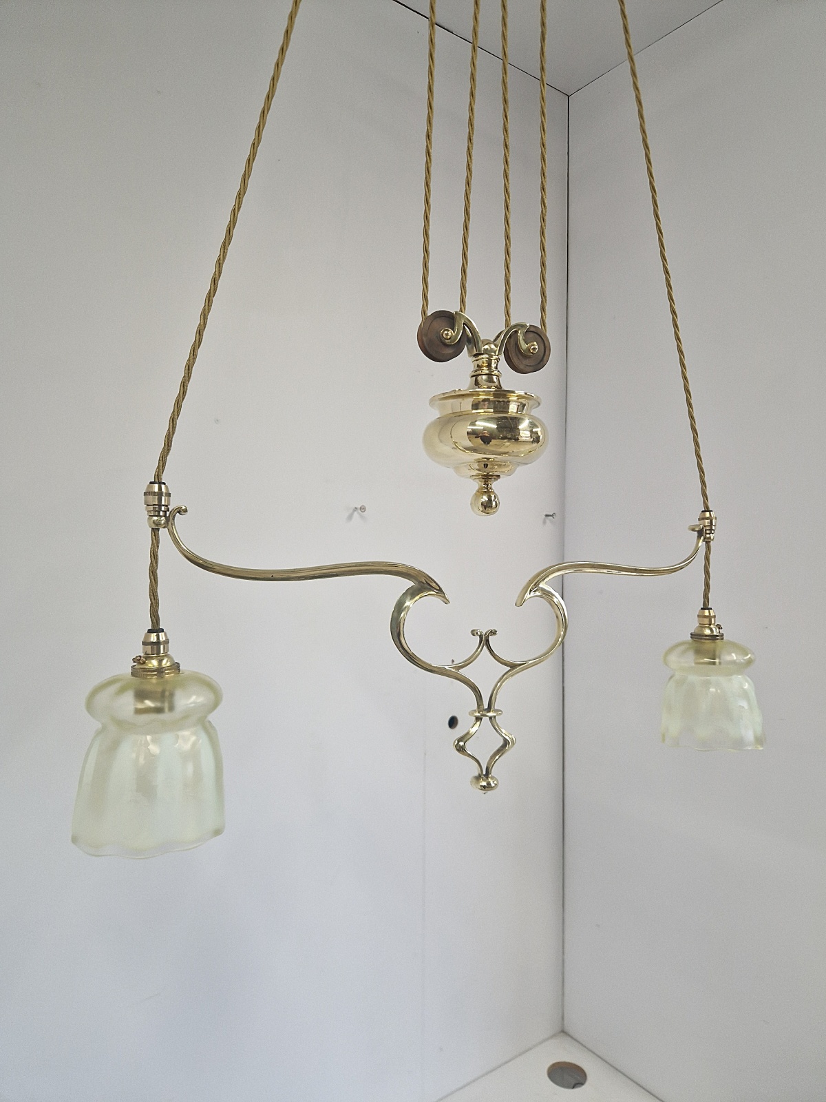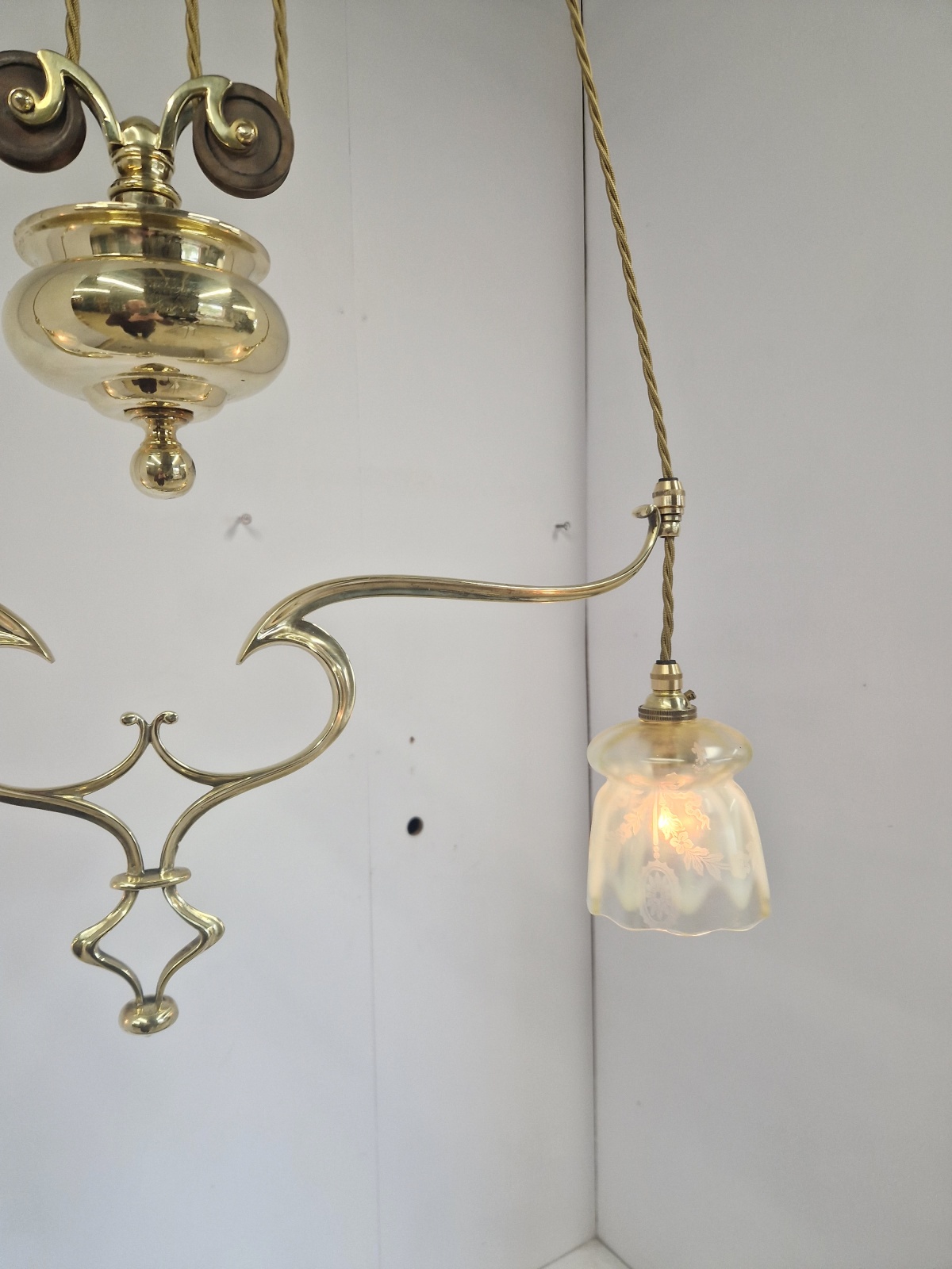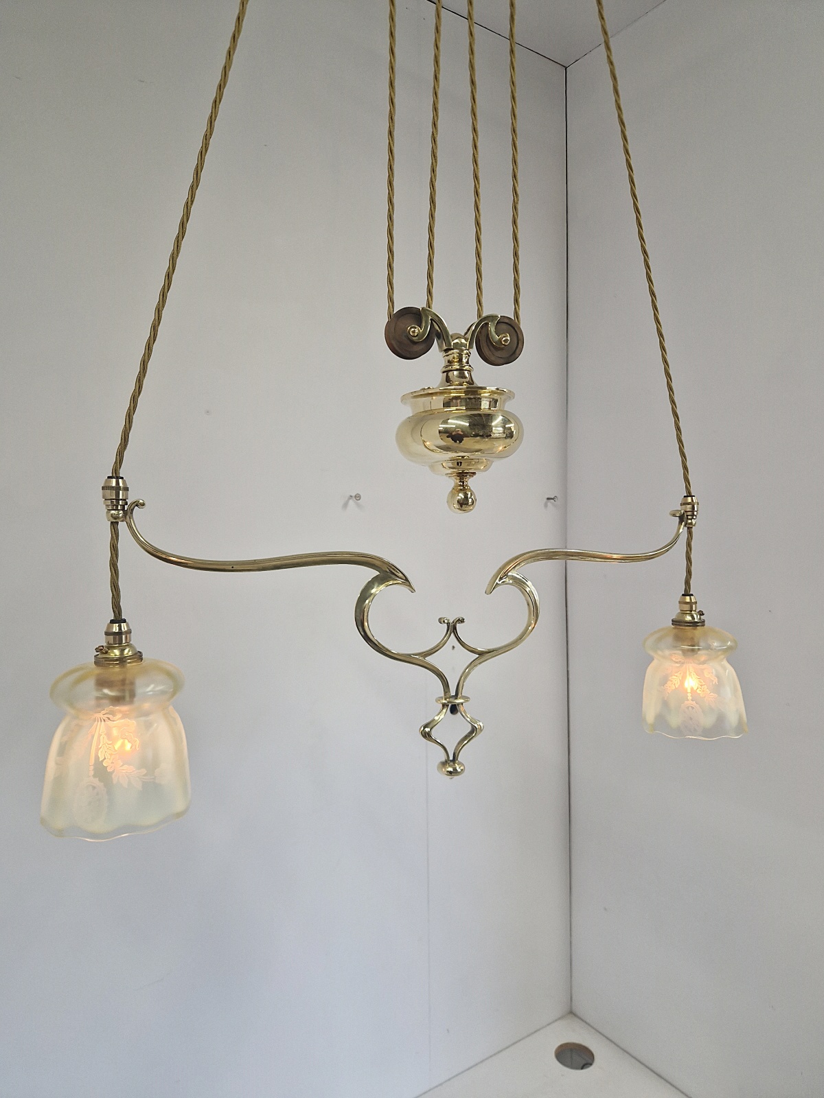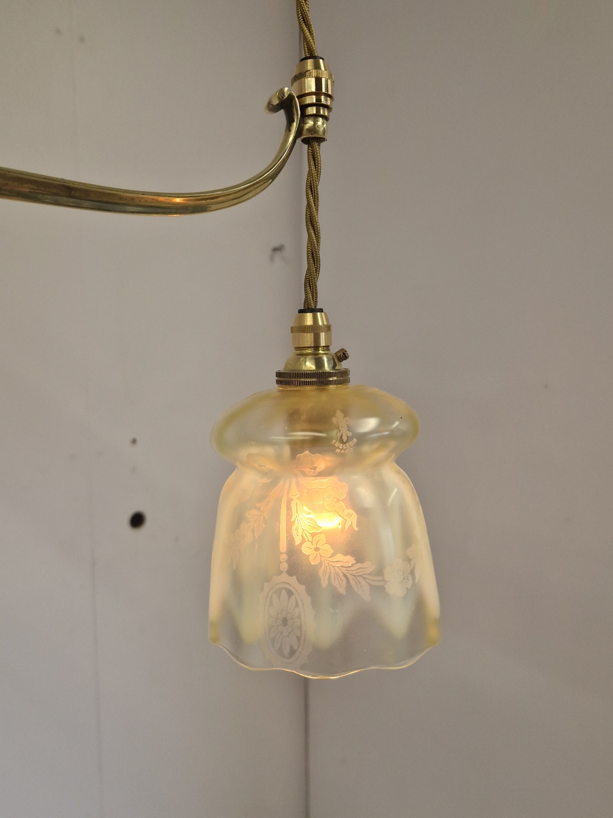 Product Code: LG698.705A good quality brass two arm “rise and fall” dining table hanging light by The General Electric Company in a traditional soft art nouveau style, complimented with a pair of original vaseline-glass lampshades engraved in the registered design of swags and bows produced by John Walsh Walsh. England, c.1905.