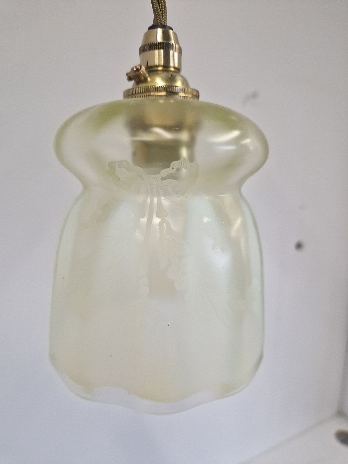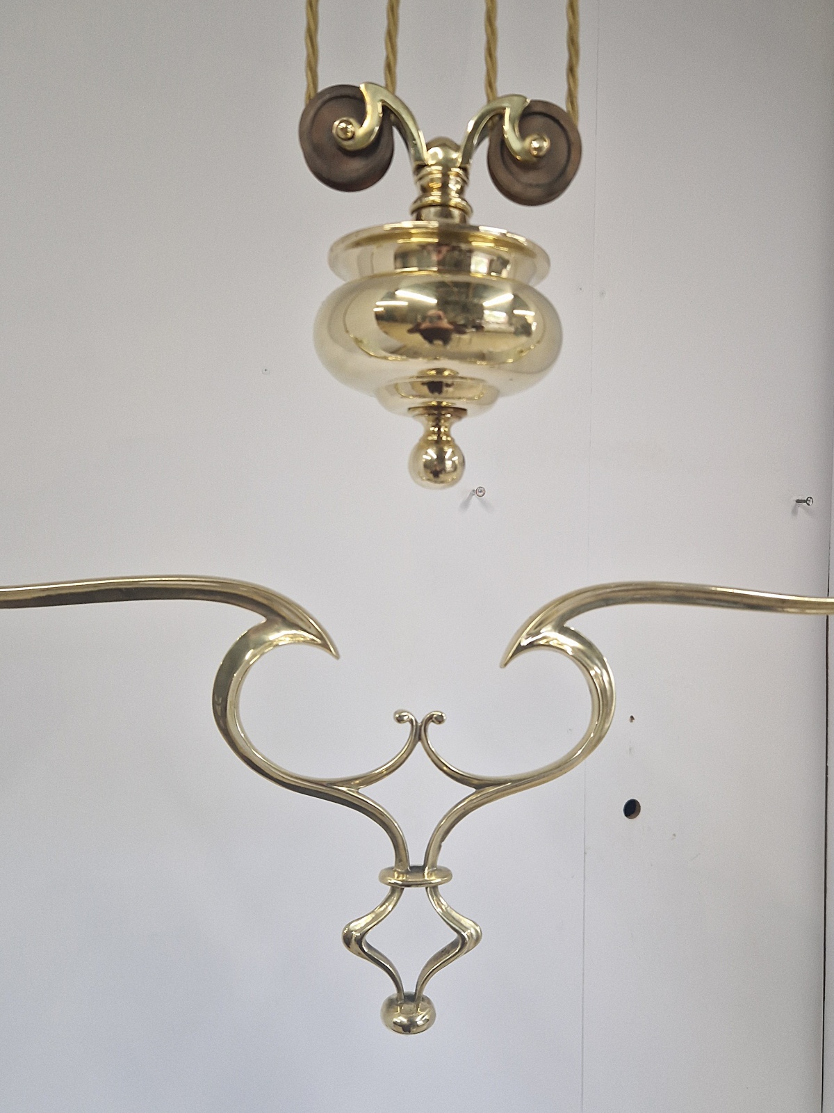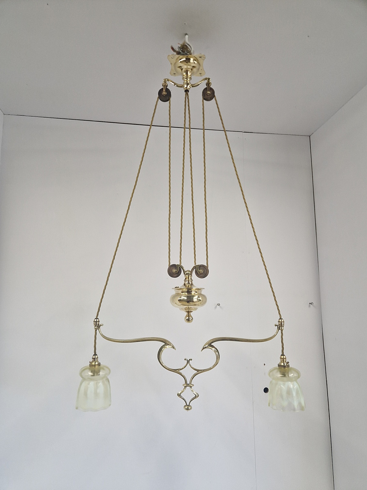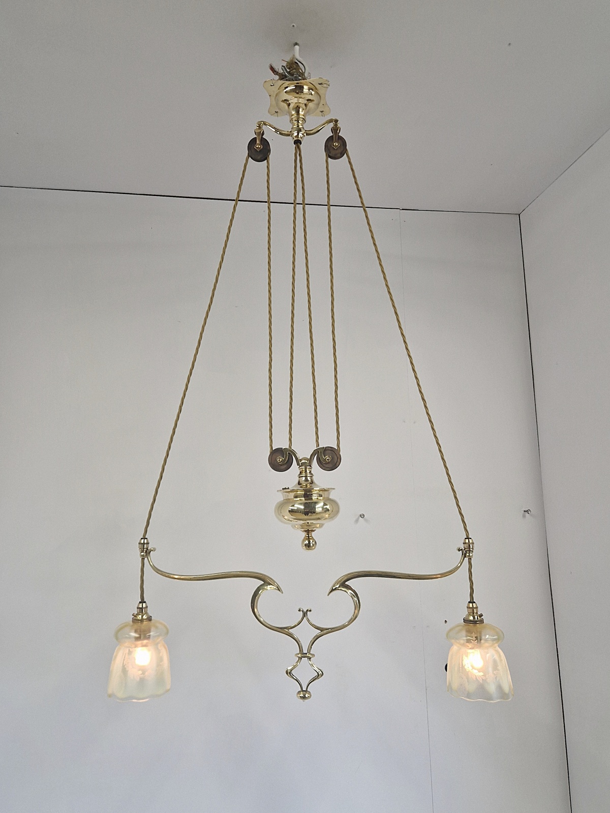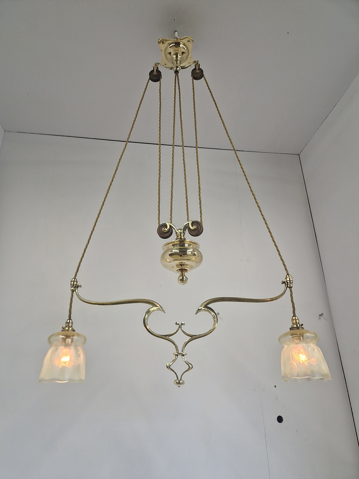 Product Code: LG698.705A good quality brass two arm “rise and fall” dining table hanging light by The General Electric Company in a traditional soft art nouveau style, complimented with a pair of original vaseline-glass lampshades engraved in the registered design of swags and bows produced by John Walsh Walsh. England, c.1905.