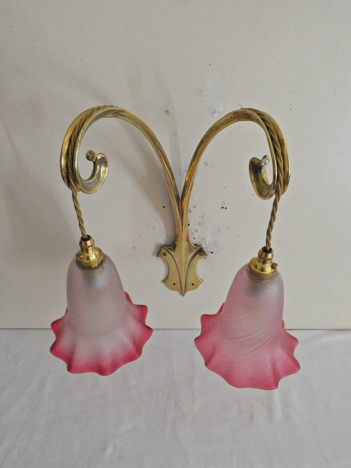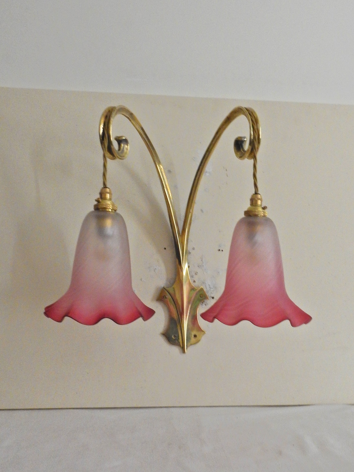 Product Code: TJP002A twin-arm brass art nouveau wall light signed G.E.C, each arm supporting pendant a cranberry glass lampshade. England early c.20th
