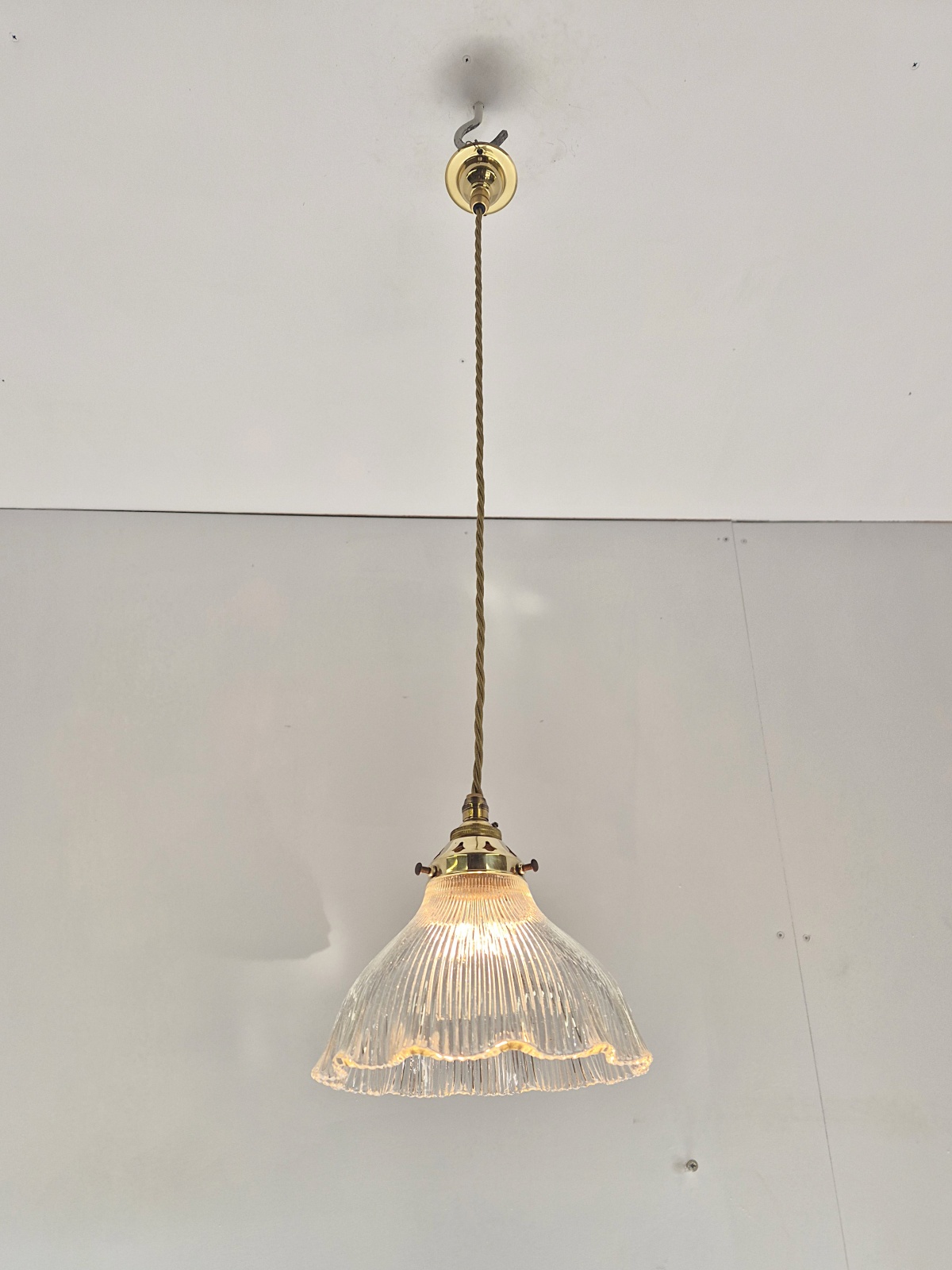 Product Code: JAL1280A set of 3 Medium sized pendant Holophane reflectors in “Stiletto” prism apparently unsigned displayed with replacement brass fitments for suspension. Also available to purchase in Bronze or Nickel fitments. England c.1900
