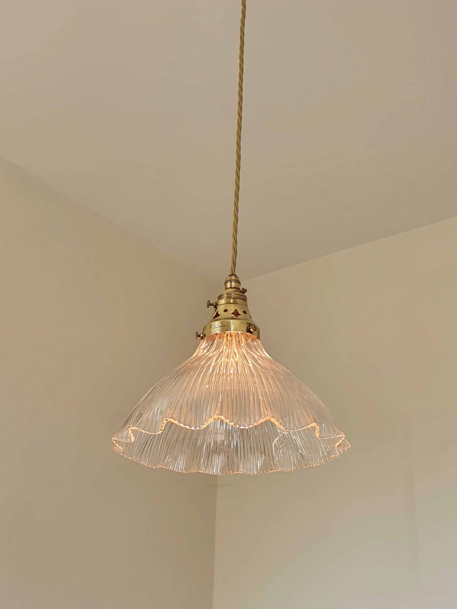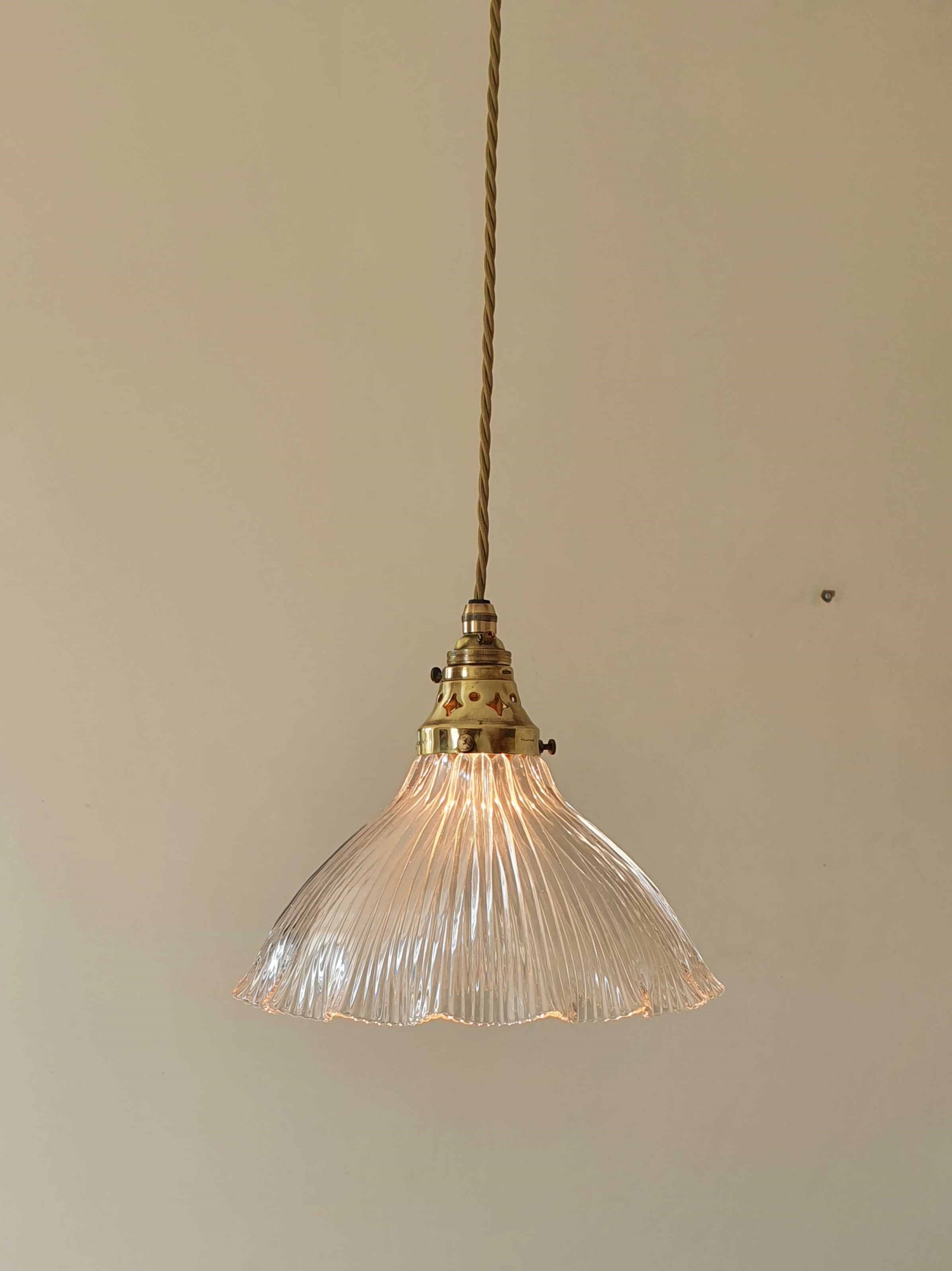 Product Code: JAL1041A Holophane Company reflector in “stiletto” prism with original brass gallery. Both shade and gallery signed Holophane with PAT no. 20222 for 1892 and 28498 for 1896.