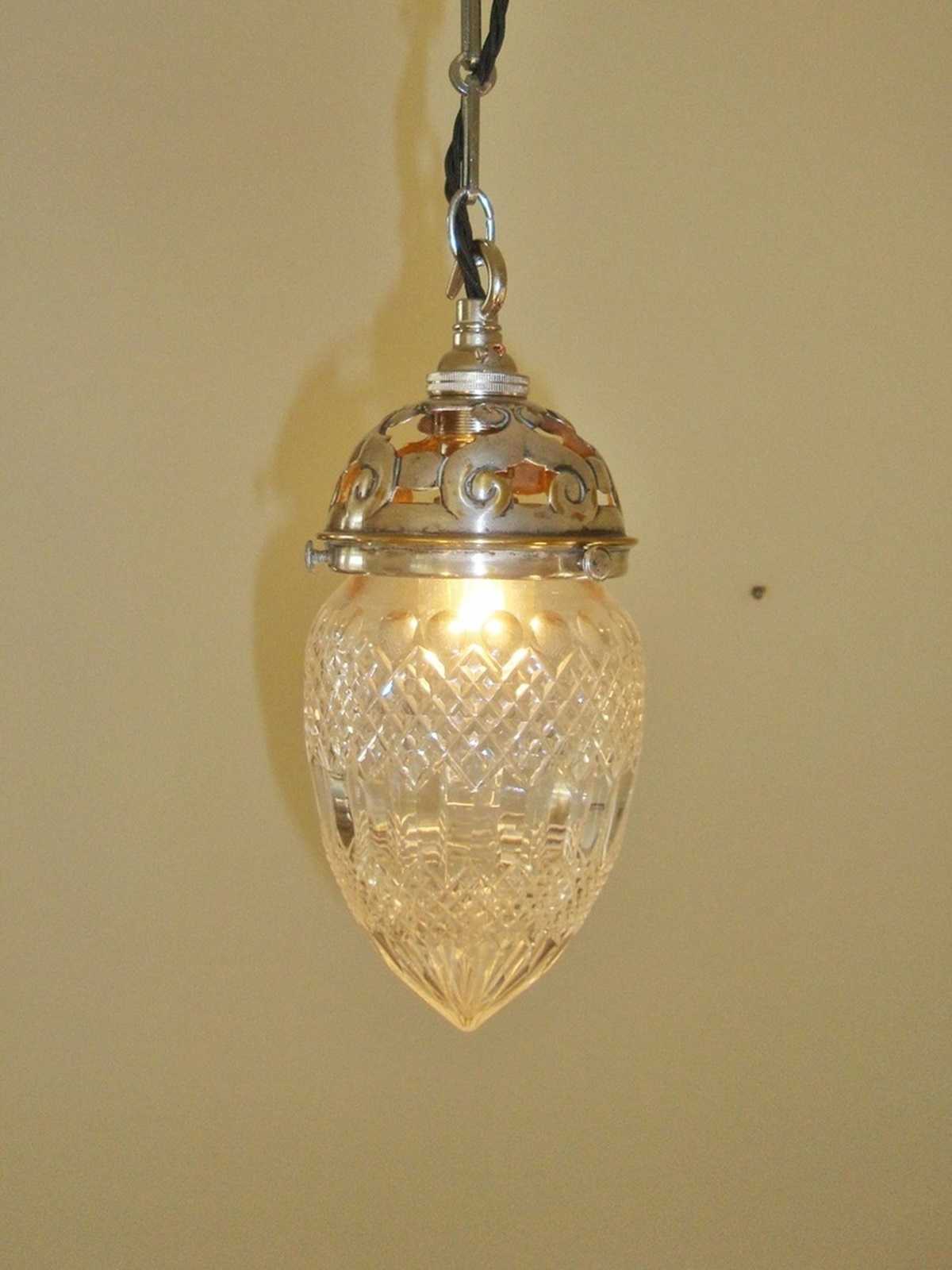 A set of three cut-glass “pineapple” pendants with original pierced silver-plated galleries; fitments for suspension; England, c.1905. (One shade with slight grinding to gallery support end that doesn’t show once in position). Ht. inc. gallery 24cm/9.5ins.