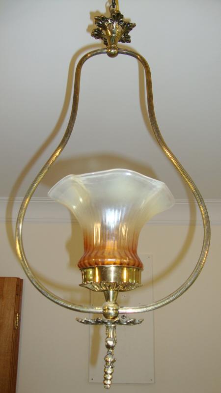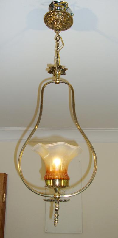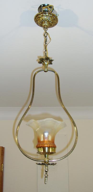 Product Code: JAL0513A pair of brass “lyre” lanterns, each with an attractive and unusual pearlescent and opalescent lampshade. England early c20th