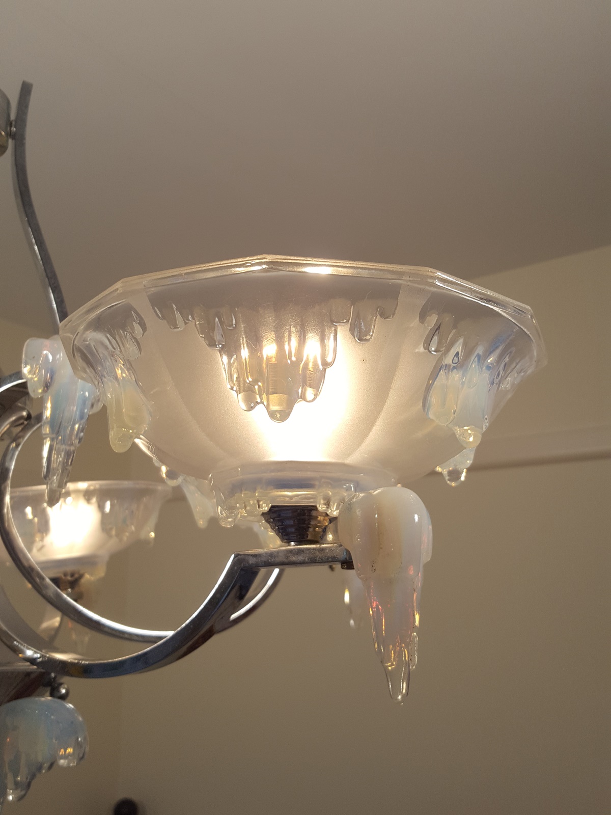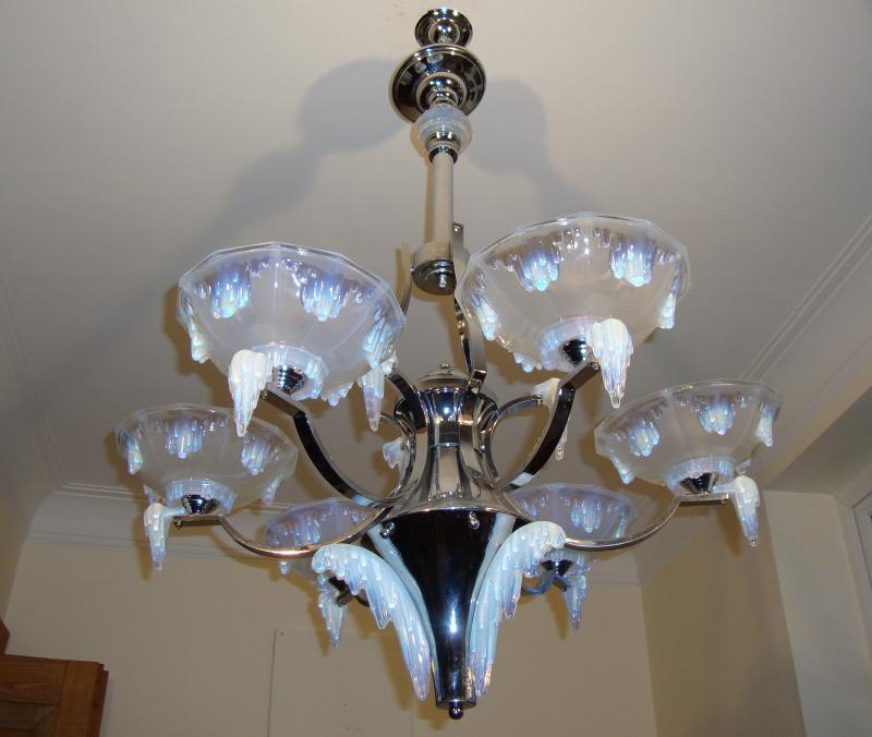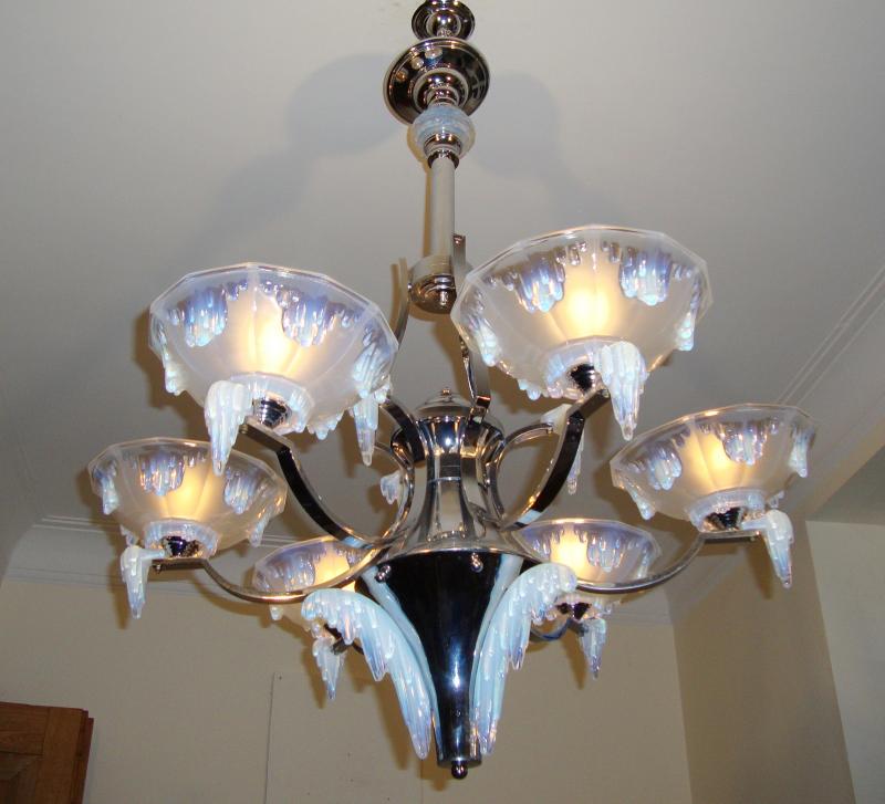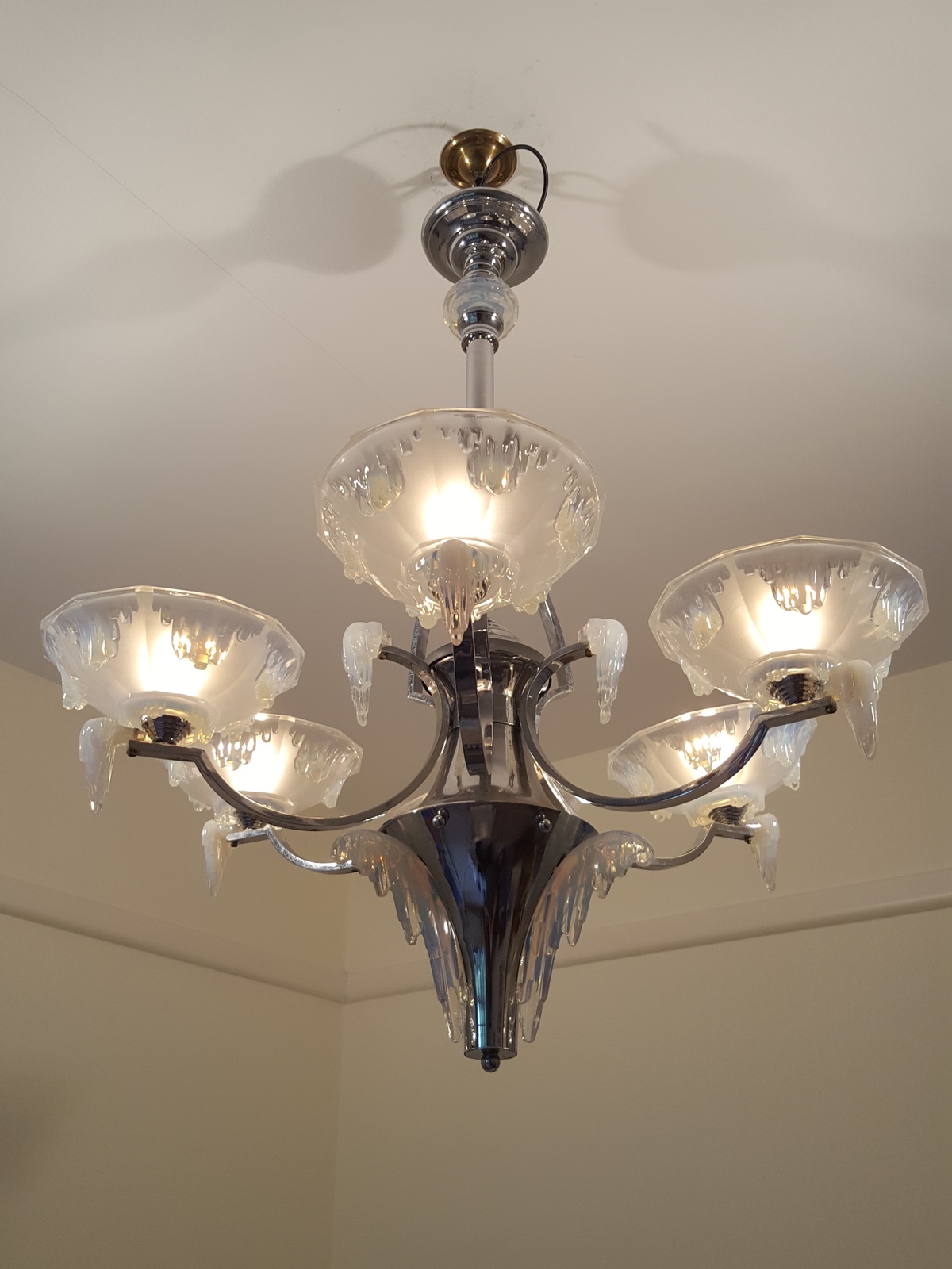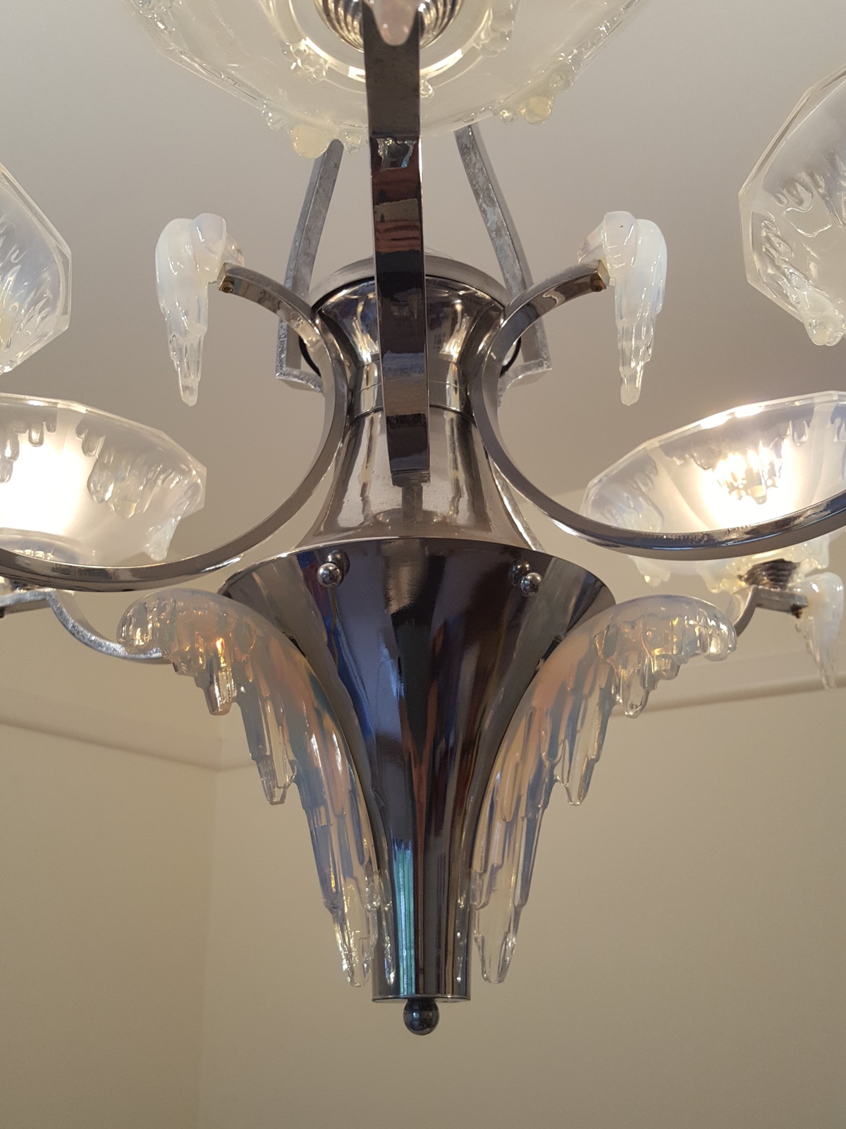 Product Code: JAL0244A large and highly rare pair of good quality chromed-brass six-branch art deco “icicle” chandeliers, each fitting with six strongly-opalescent glass shades signed “Ezan” for établissement Jean Gauthier (E.J.G), Ezanville with further opalescent glass “icicle” embellishments. France, c1930.