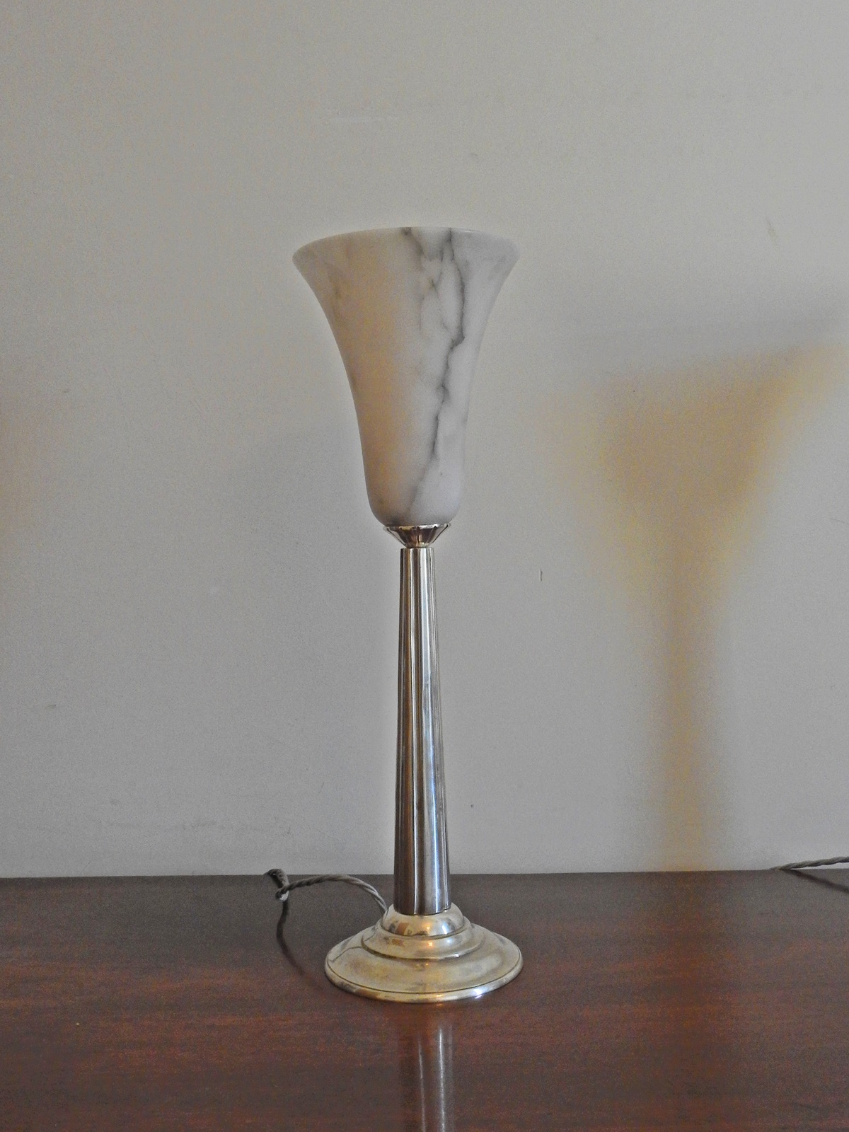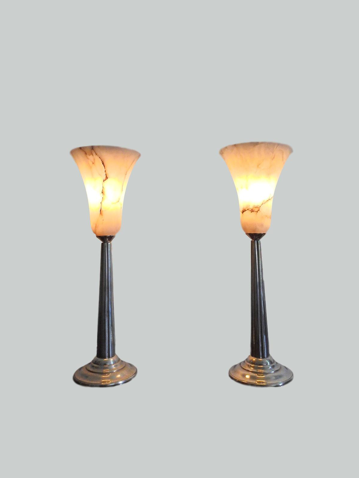 A pair of art deco silver plated table lamps of slender fluted design in the style of Emile-Jaques Ruhlmann with good quality alabaster lampshades. France C1925.