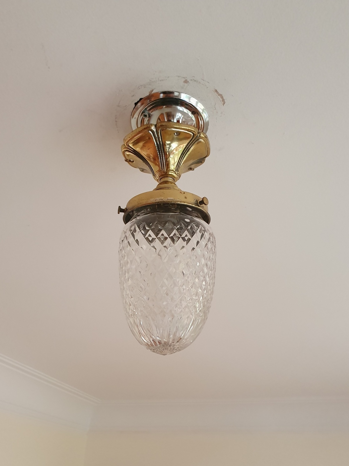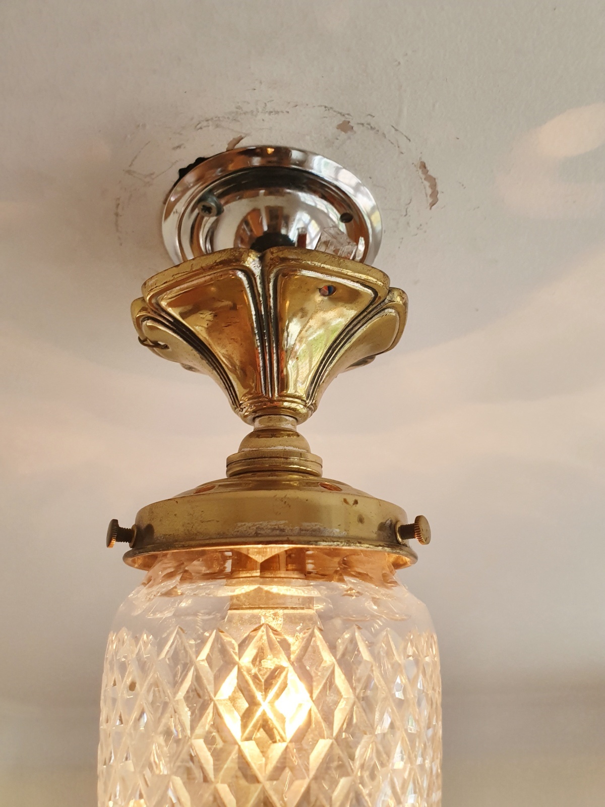 A pair of  good quality cast-brass Edwardian flush fitments with original crystal cut-glass “pienapple” lampshades. England c.1900