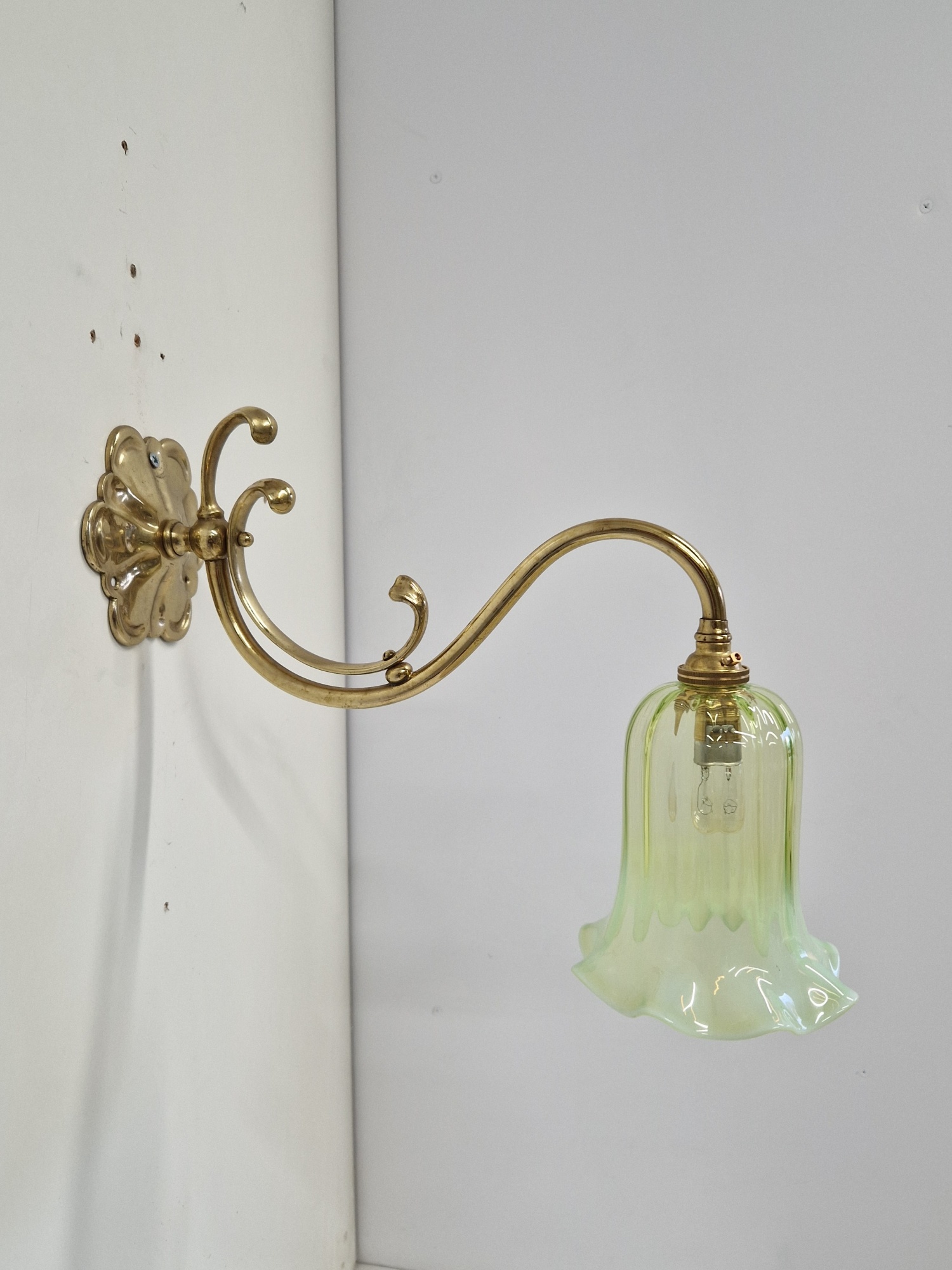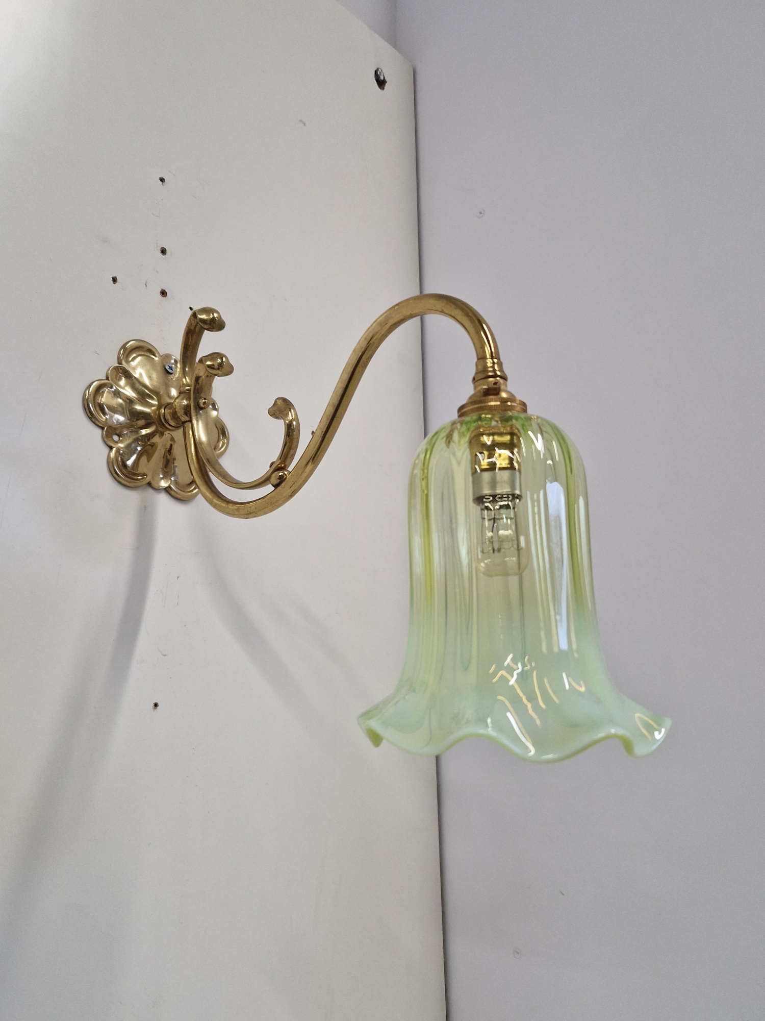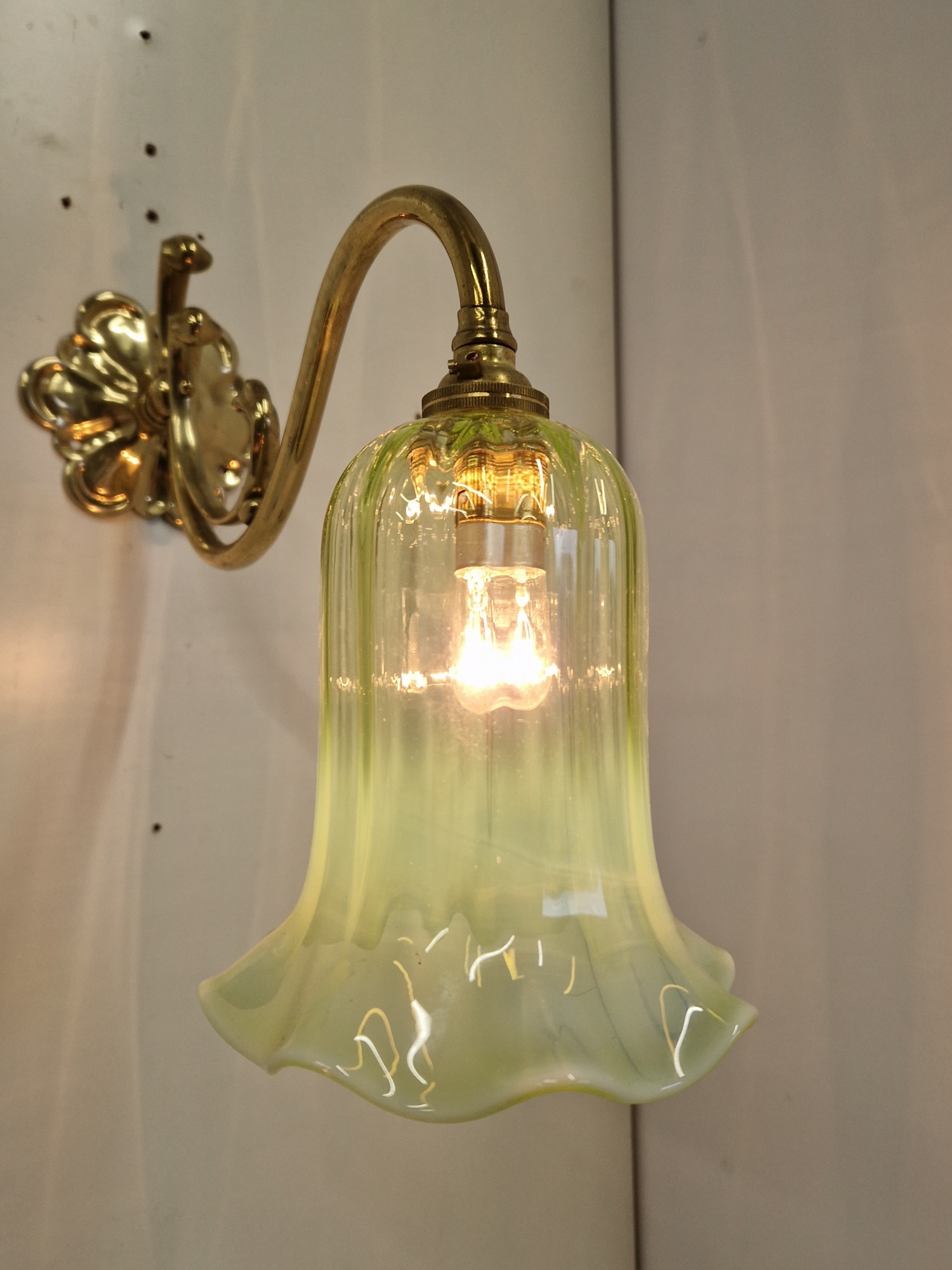 Product Code: JAL1138VAS093A good quality pair of cast brass “swan-neck” wall lights in traditional Edwardian style complimented with 2 reproduction vaseline lampshades. England c.1910-20