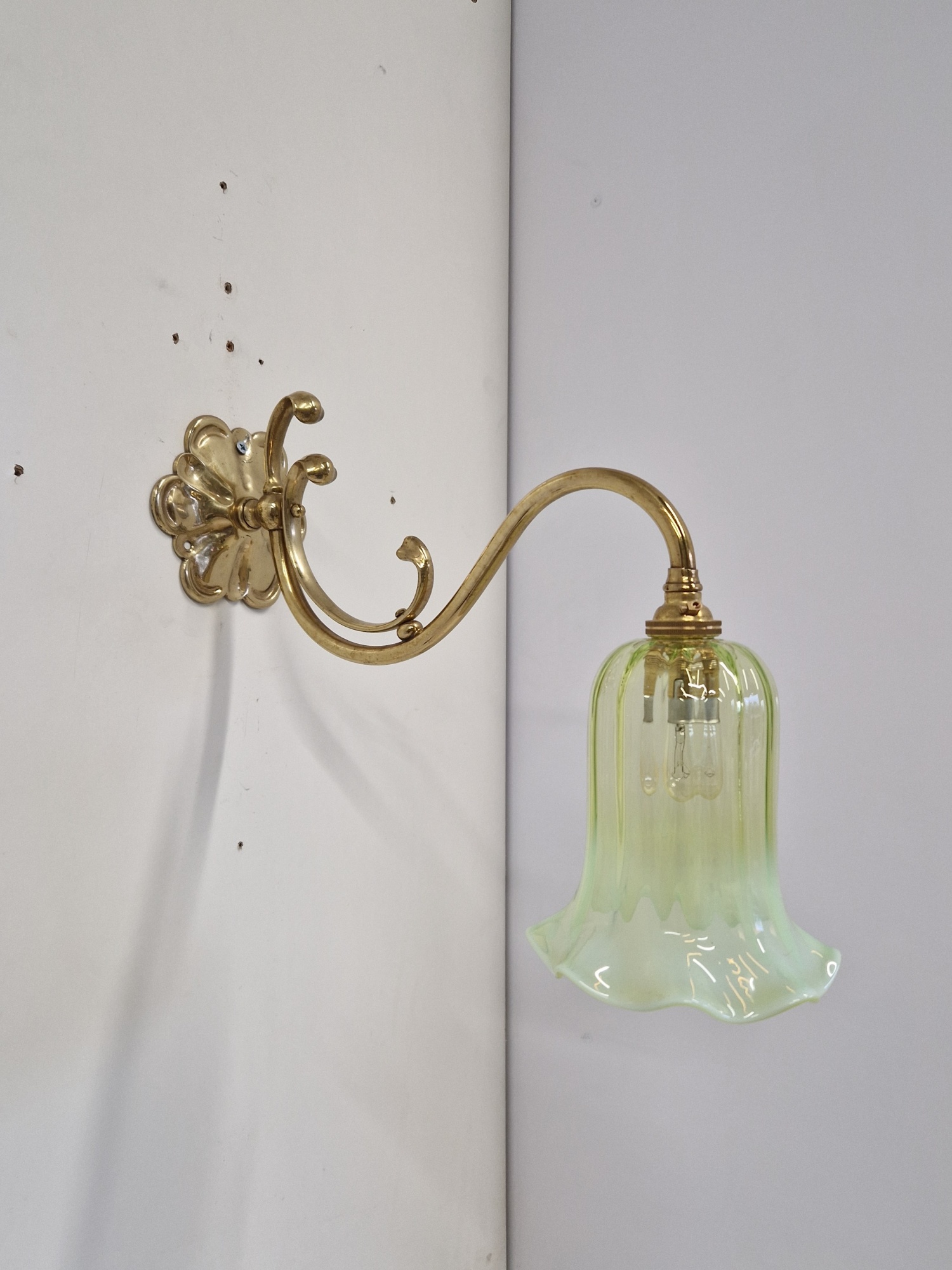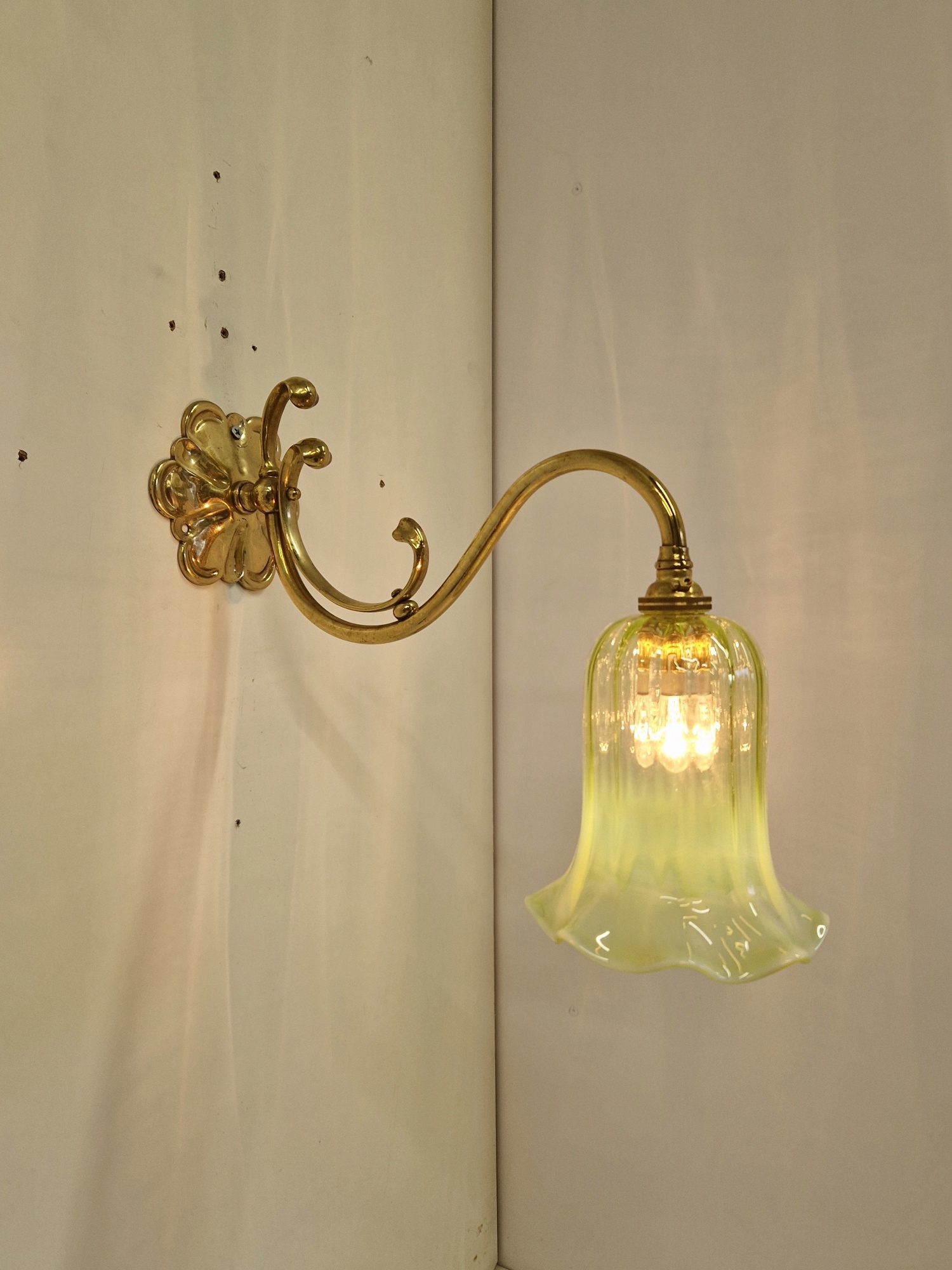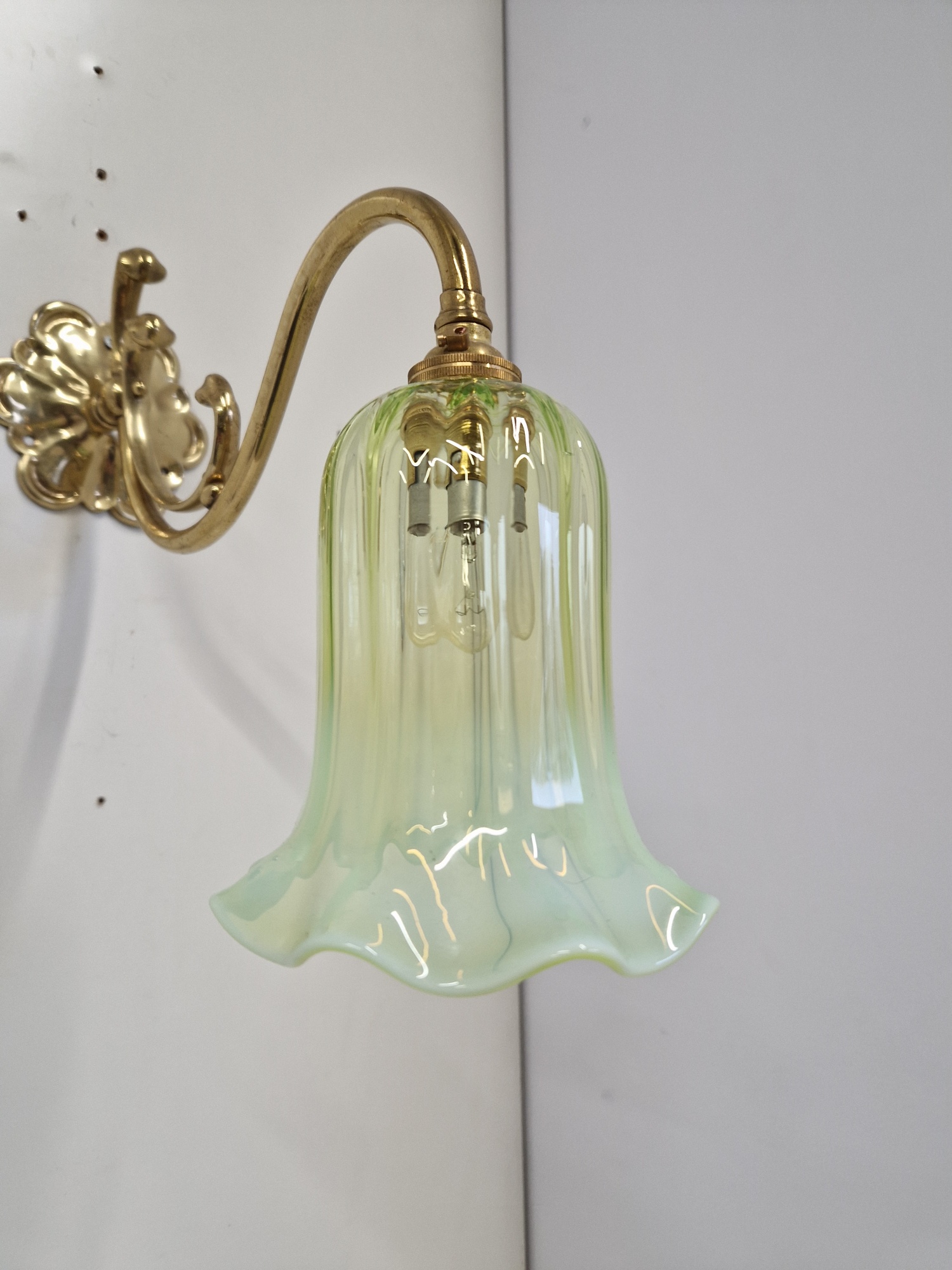 Product Code: JAL1138VAS093A good quality pair of cast brass “swan-neck” wall lights in traditional Edwardian style complimented with 2 reproduction vaseline lampshades. England c.1910-20