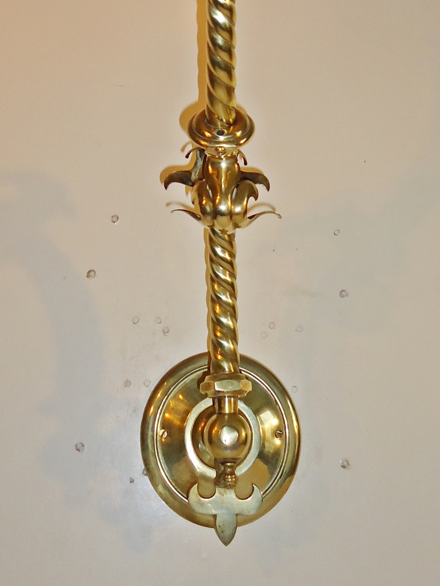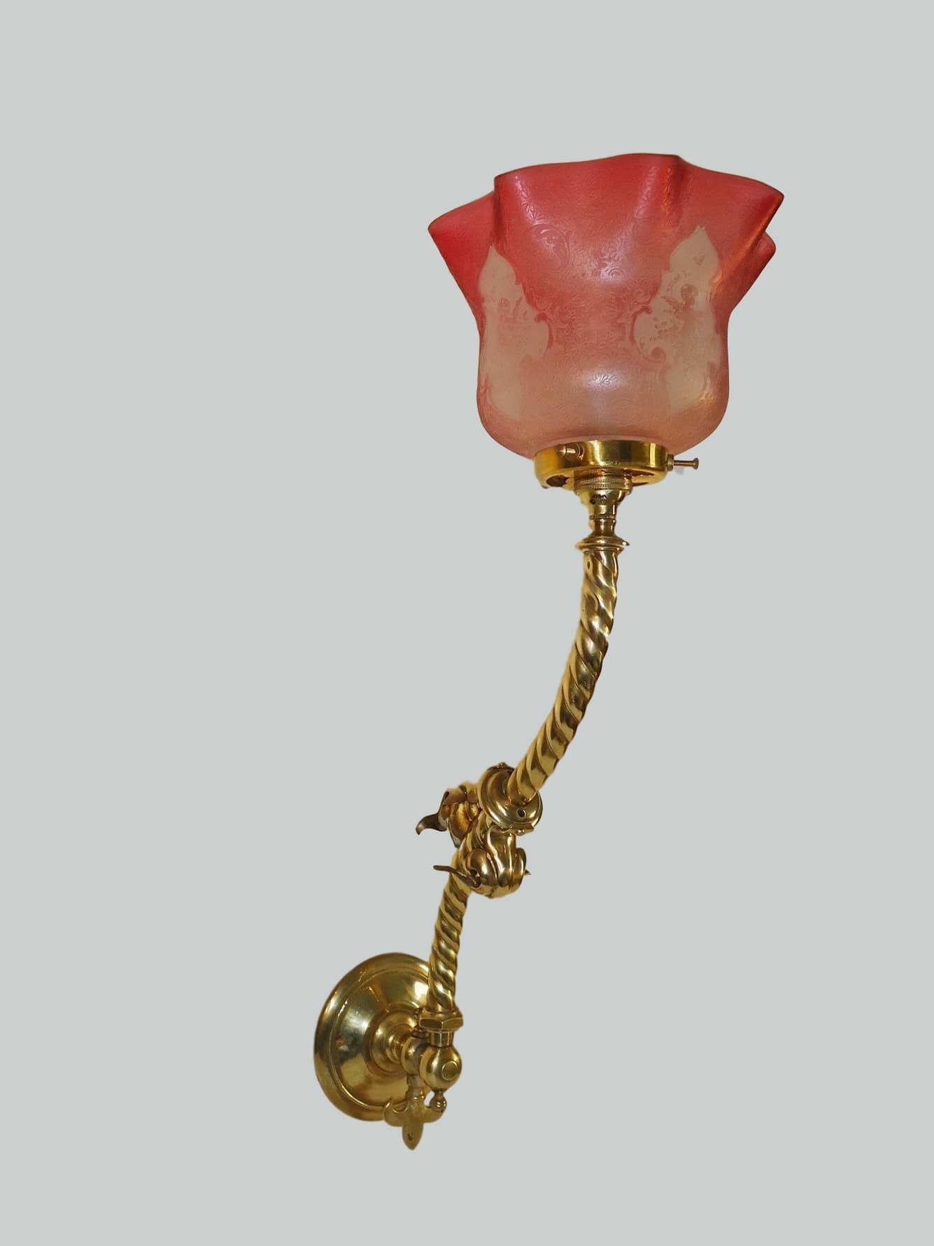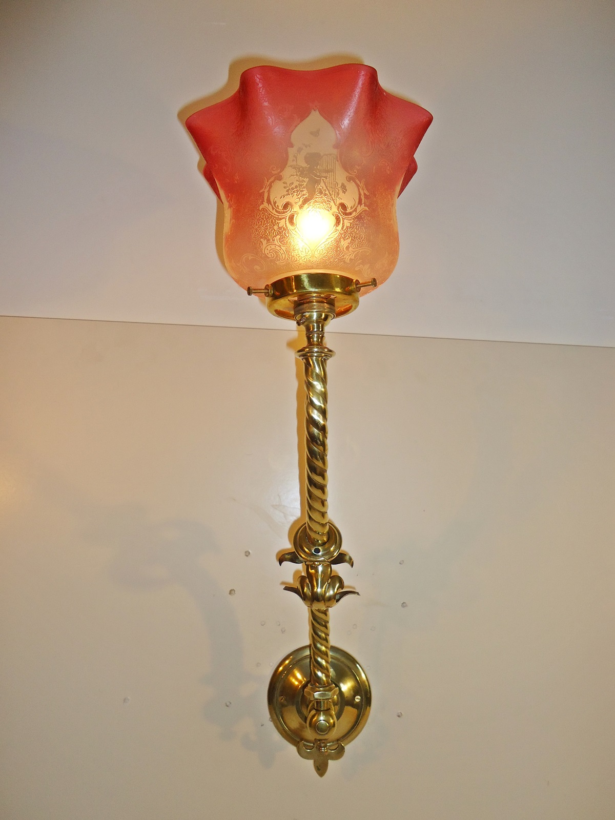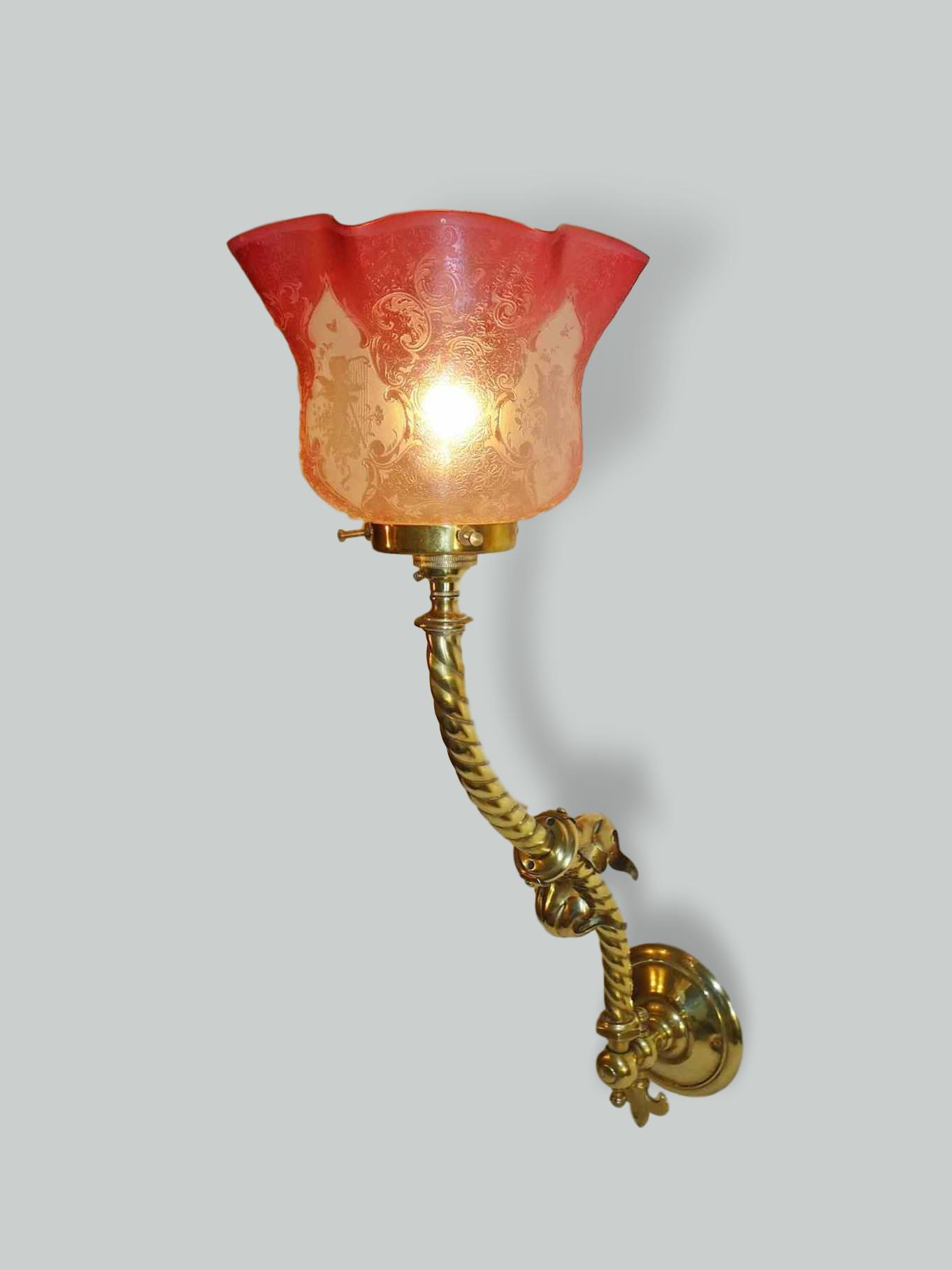 A pair of brass wall lights in a neo-gothic style, originally for gas, now converted to electricity. The rope twist stem supporting the cranberry and frosted glass gas shades which are profusely engraved with a frieze of fiddling cherubs. England c1890