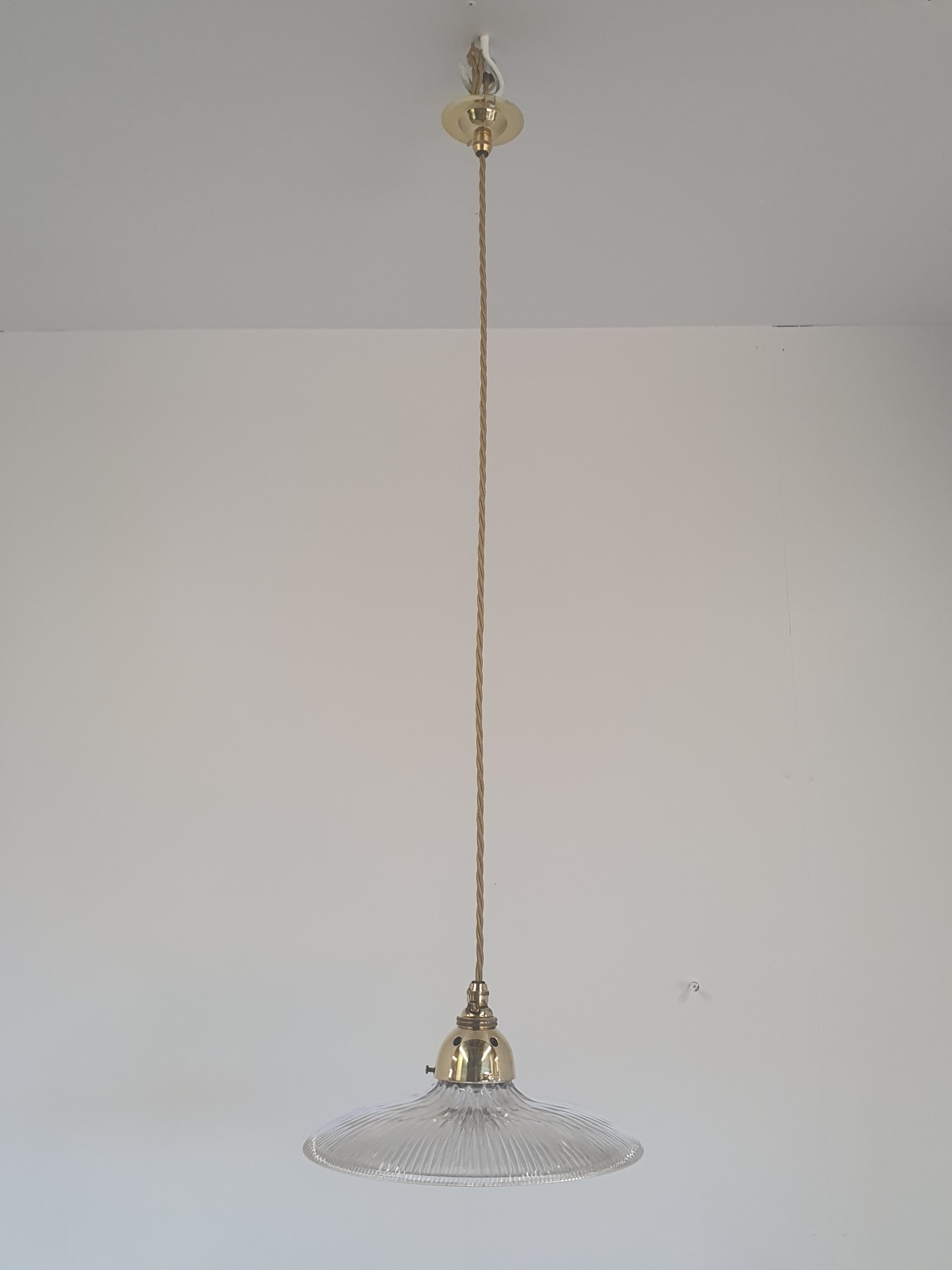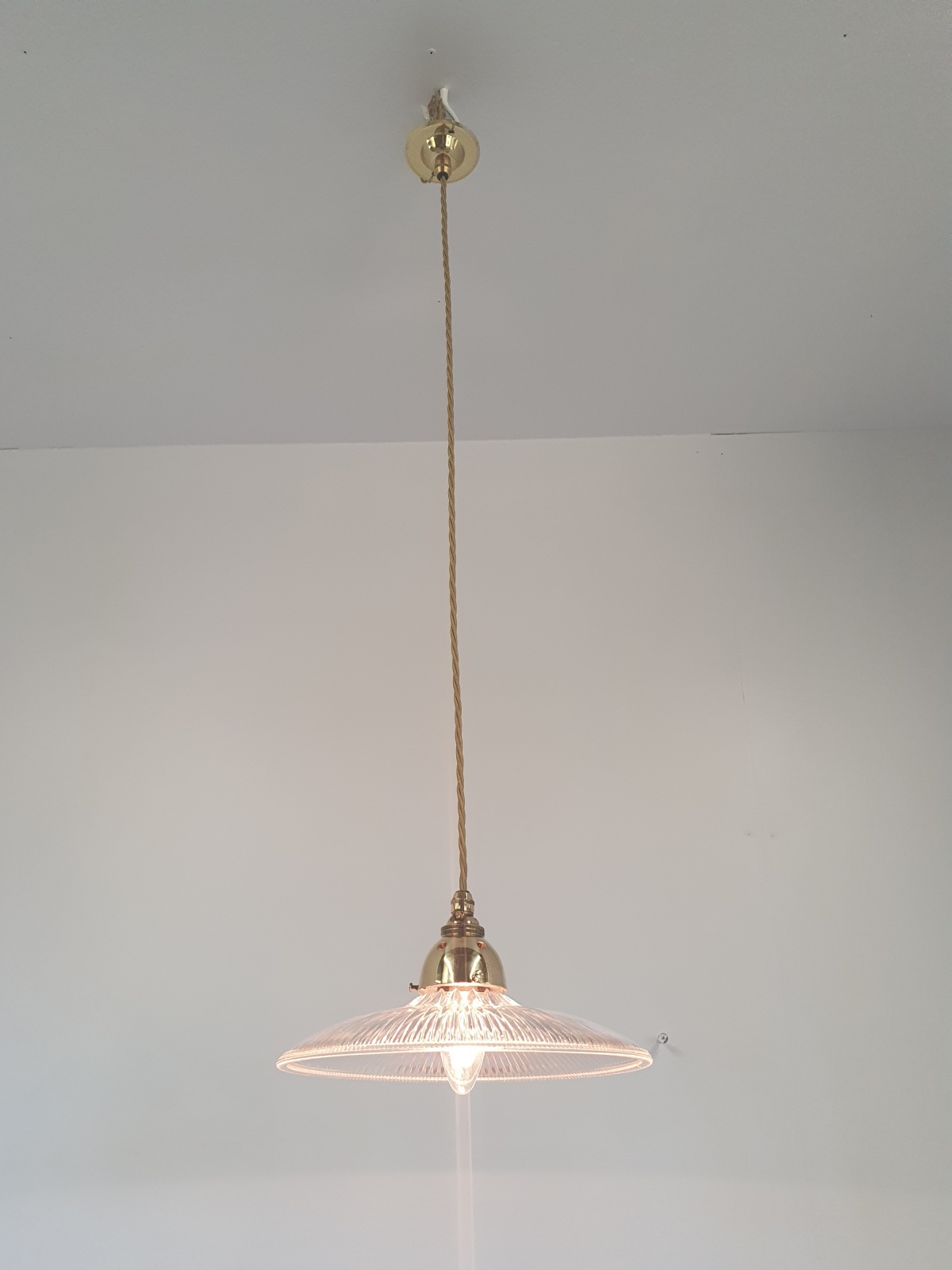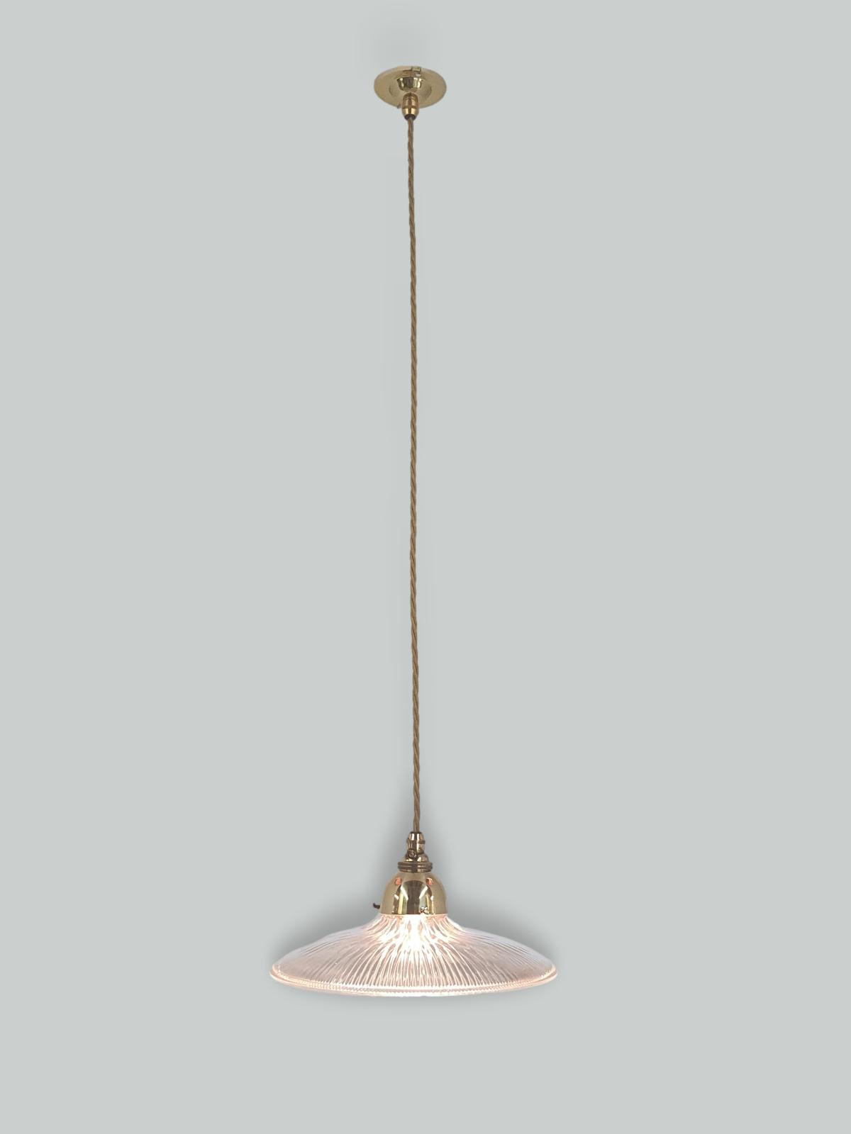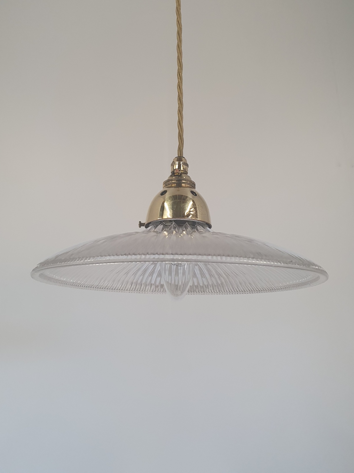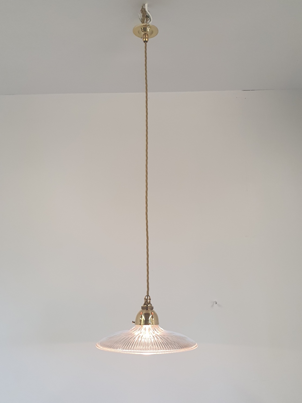 Product Code: JAL1071A pair of dish-shaped Holophane (“stiletto” prism) reflectors apparently unsigned with their original brass galleries hung pendant from a replacement brass ceiling rose. England c.1900