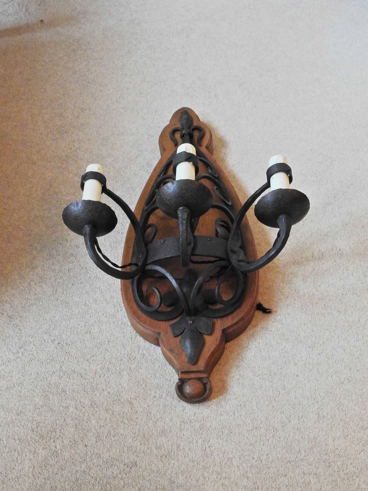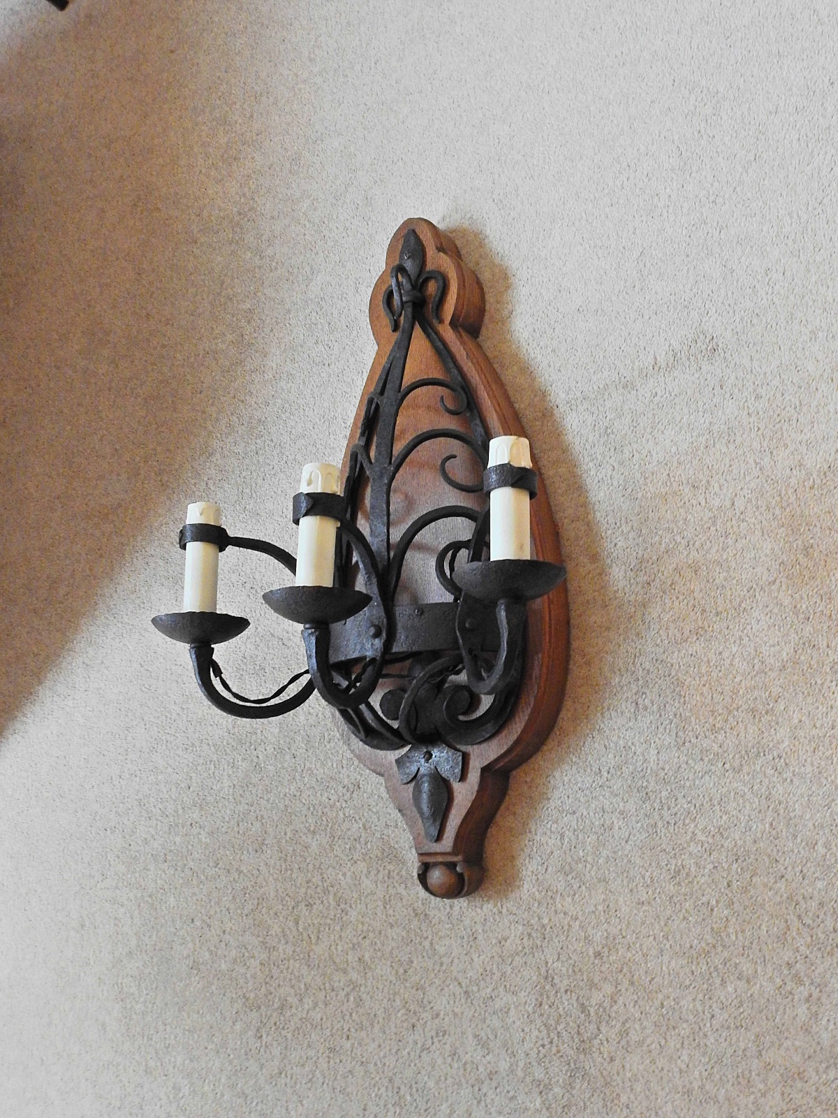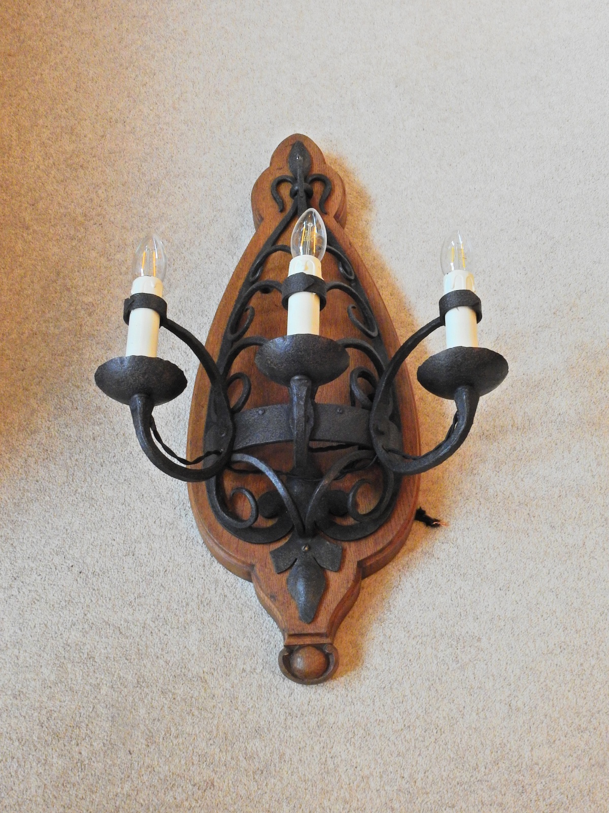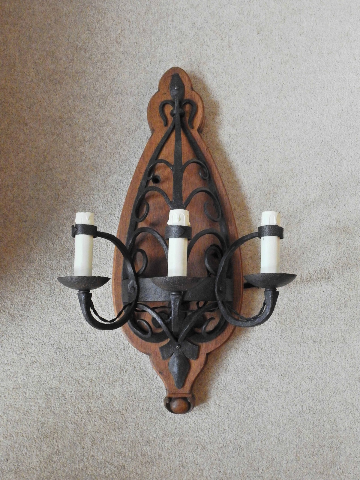Product Code: JAL1010A pair of large gothic-revival wrought-iron triple-arm appliques of pierced and scrolled design, each mounted onto a substantial bespoke antique oak patrese. France c.1910-30