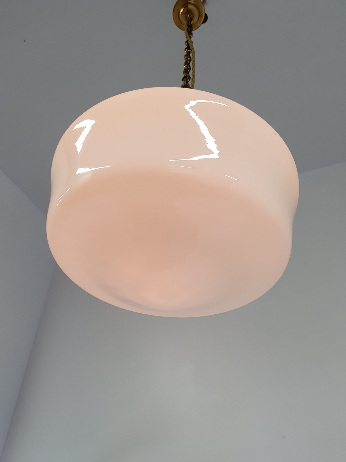 Product Code: JAL1083A pair of good sized opaline glass “Deylite” lanterns with their original brass galleries, chain and replacement ceiling hook for suspension. England c.1925
