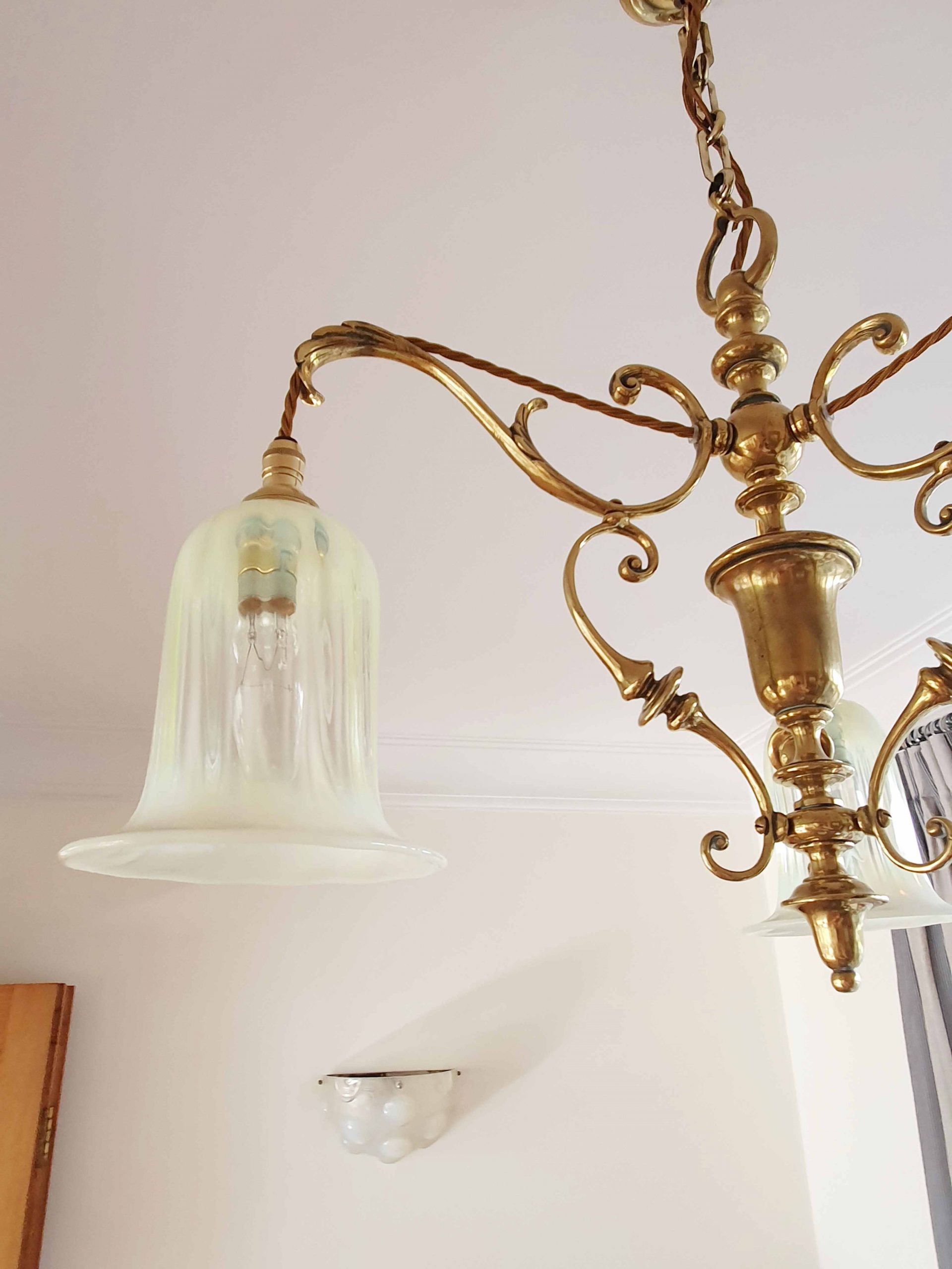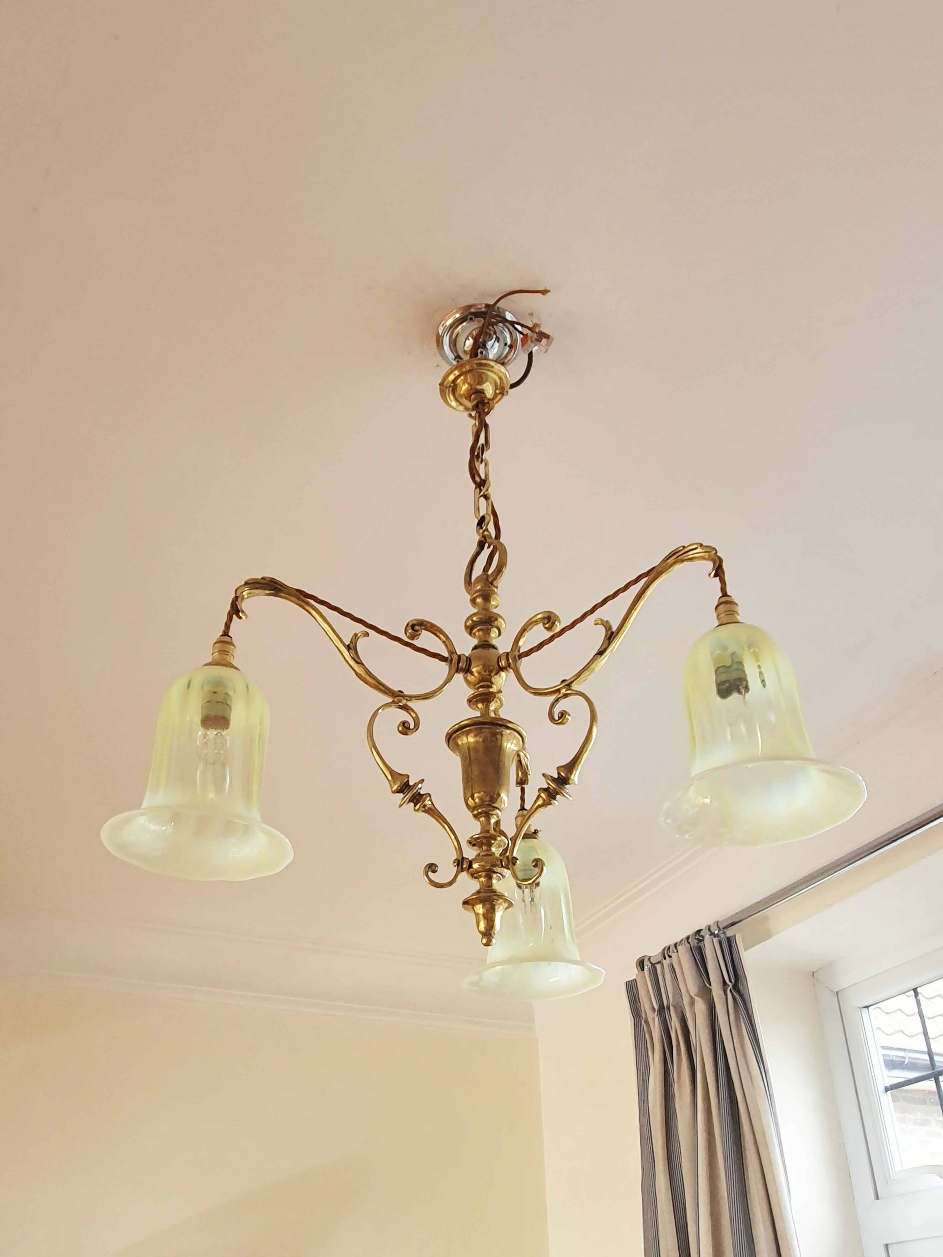 A very good quality cast-brass Edwardian 3 branch ceiling light by an unknown designer. Complimented with reproduction vaseline glass lampshades. England c.1905