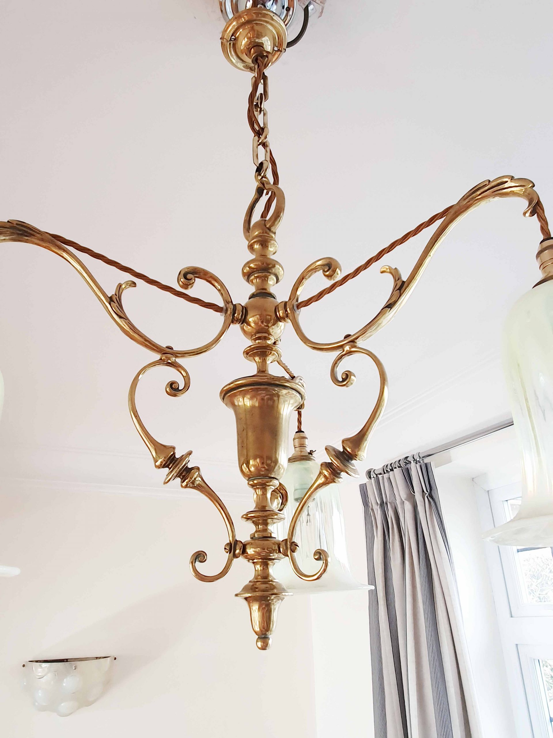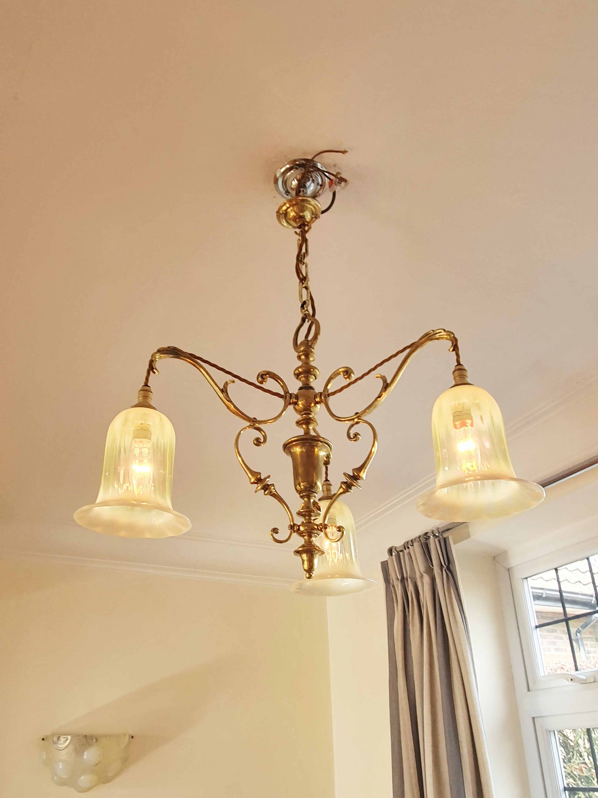 A very good quality cast-brass Edwardian 3 branch ceiling light by an unknown designer. Complimented with reproduction vaseline glass lampshades. England c.1905