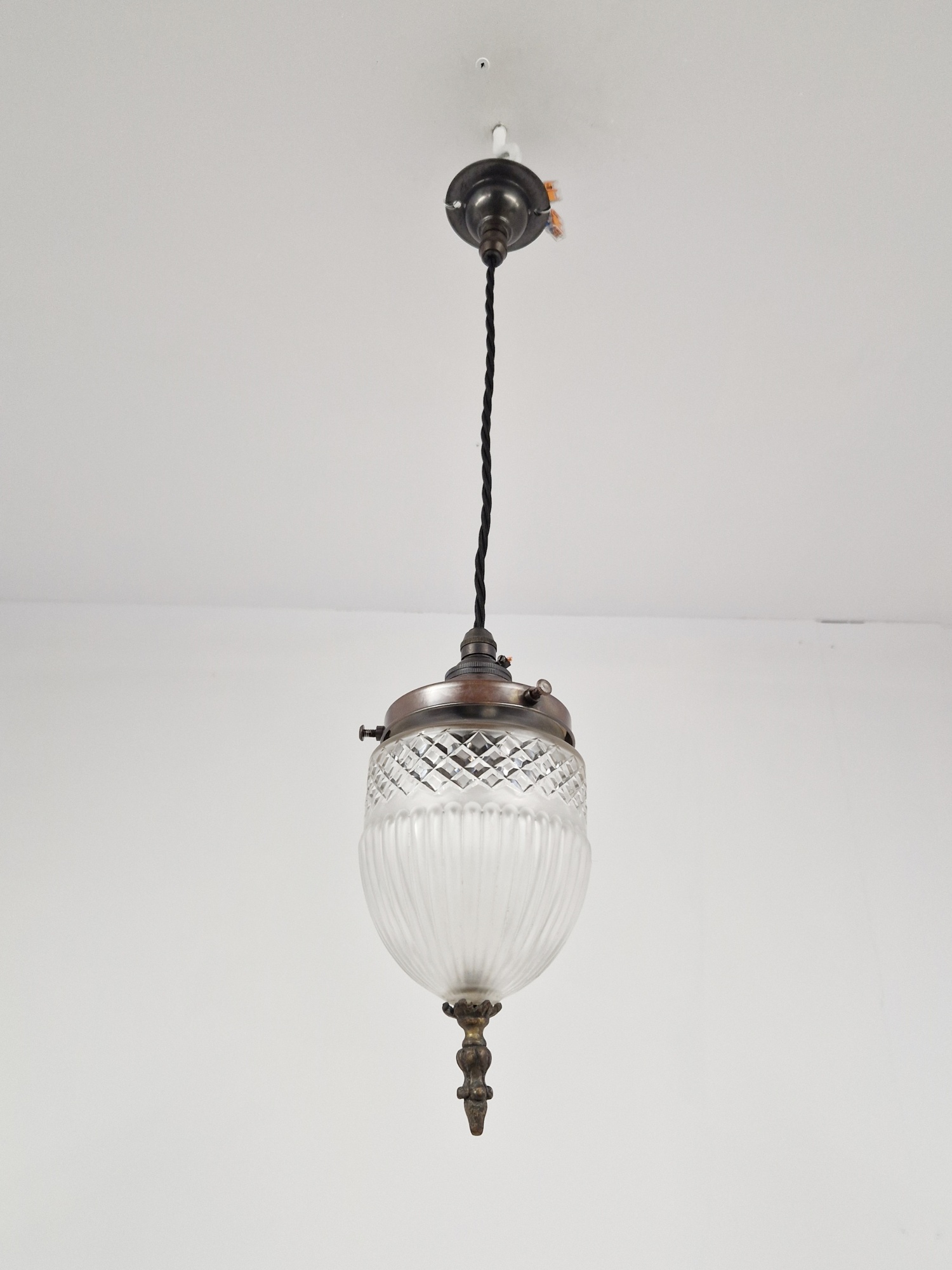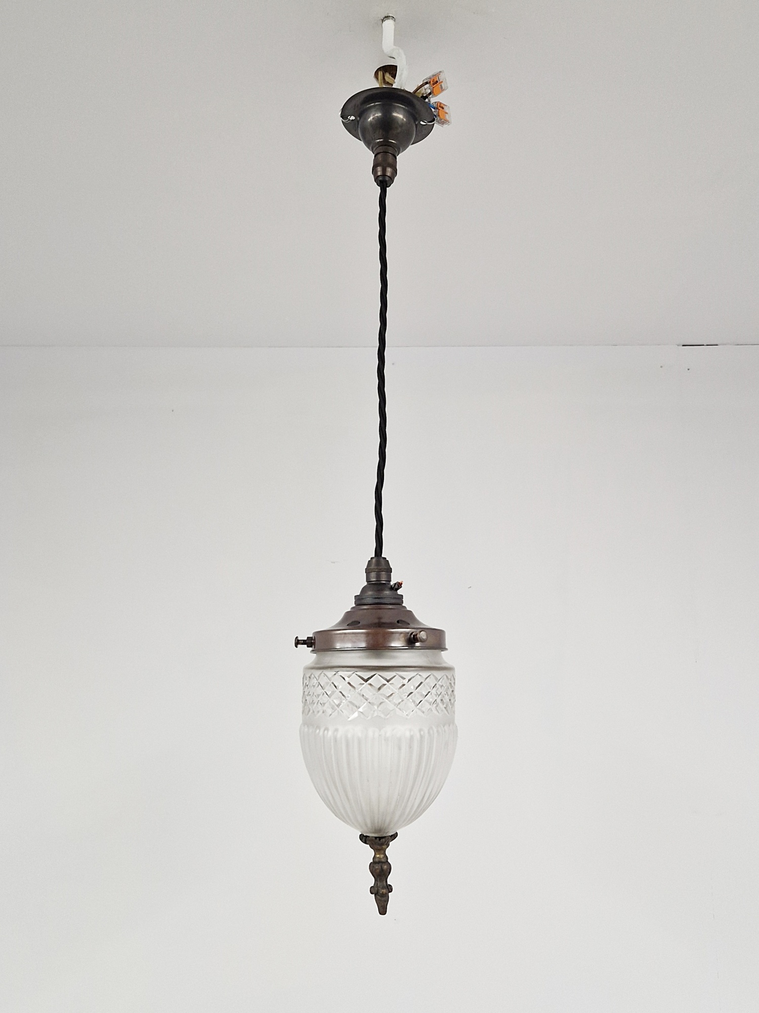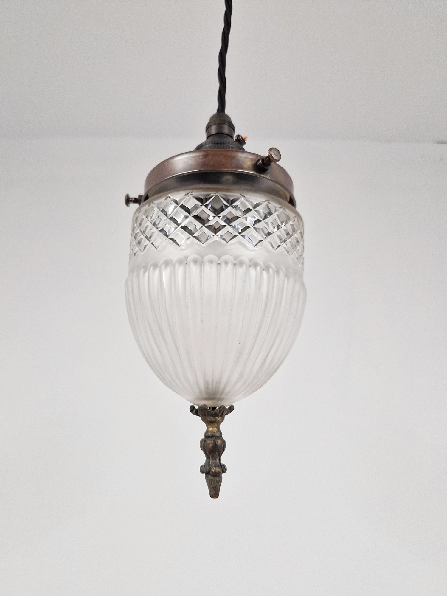Product Code: JAL0773cA set of 3 frosted and cut-glass pendants in neo-classical taste, each globular lampshade set with a bronzed finial. England c1905