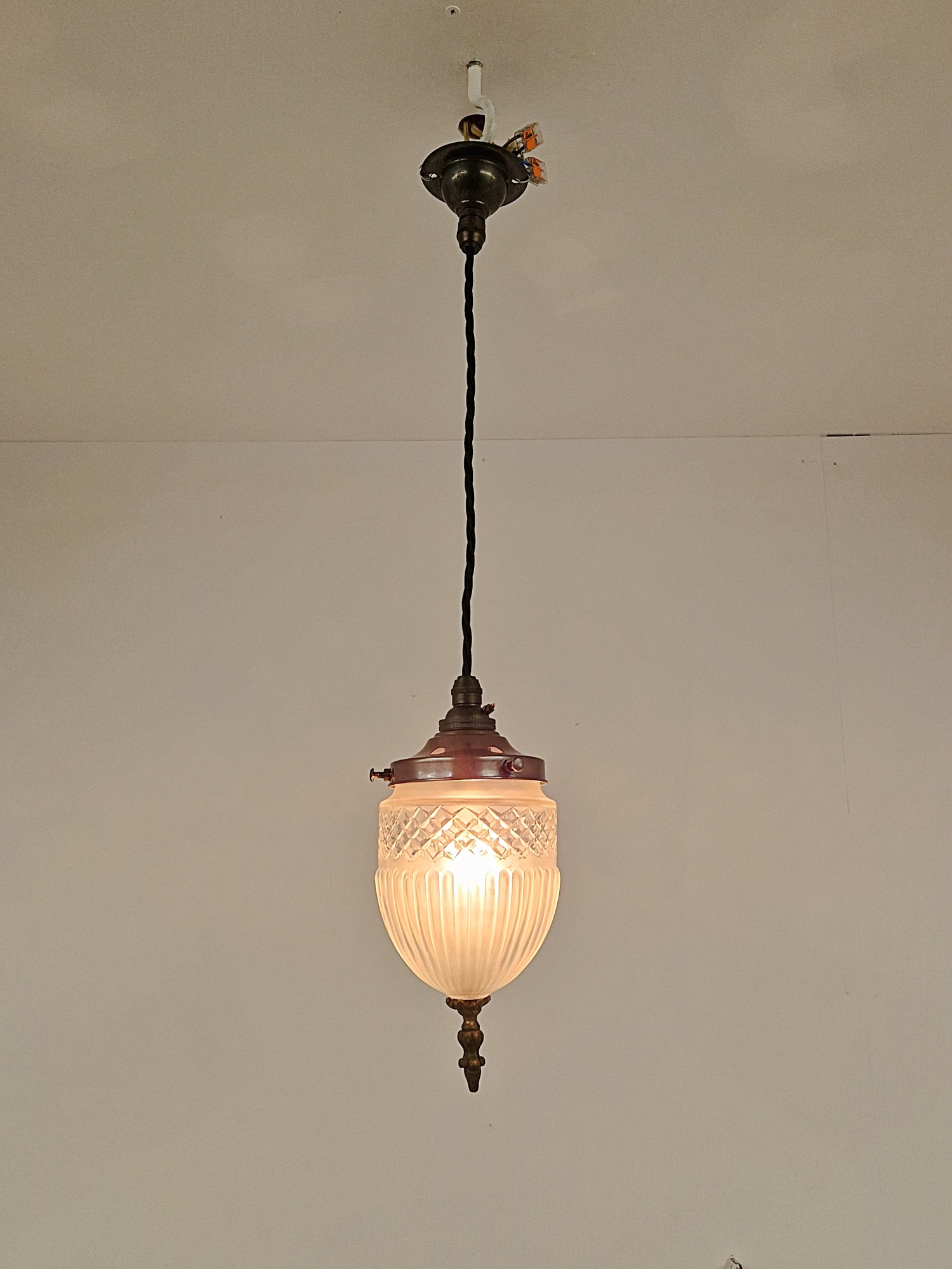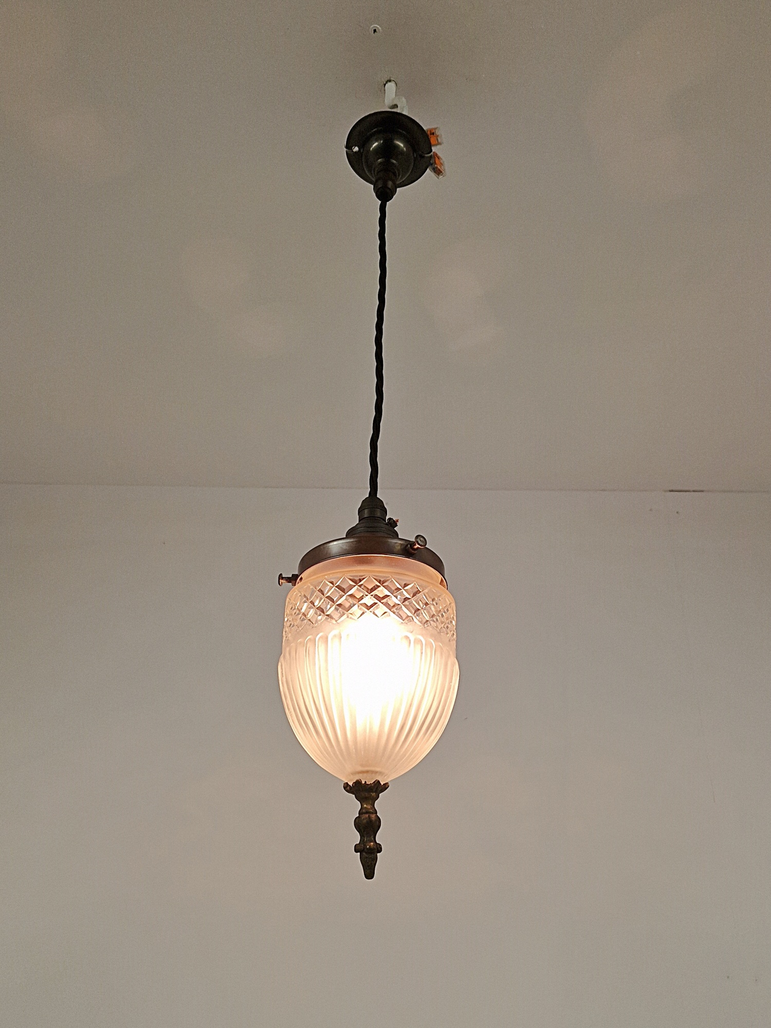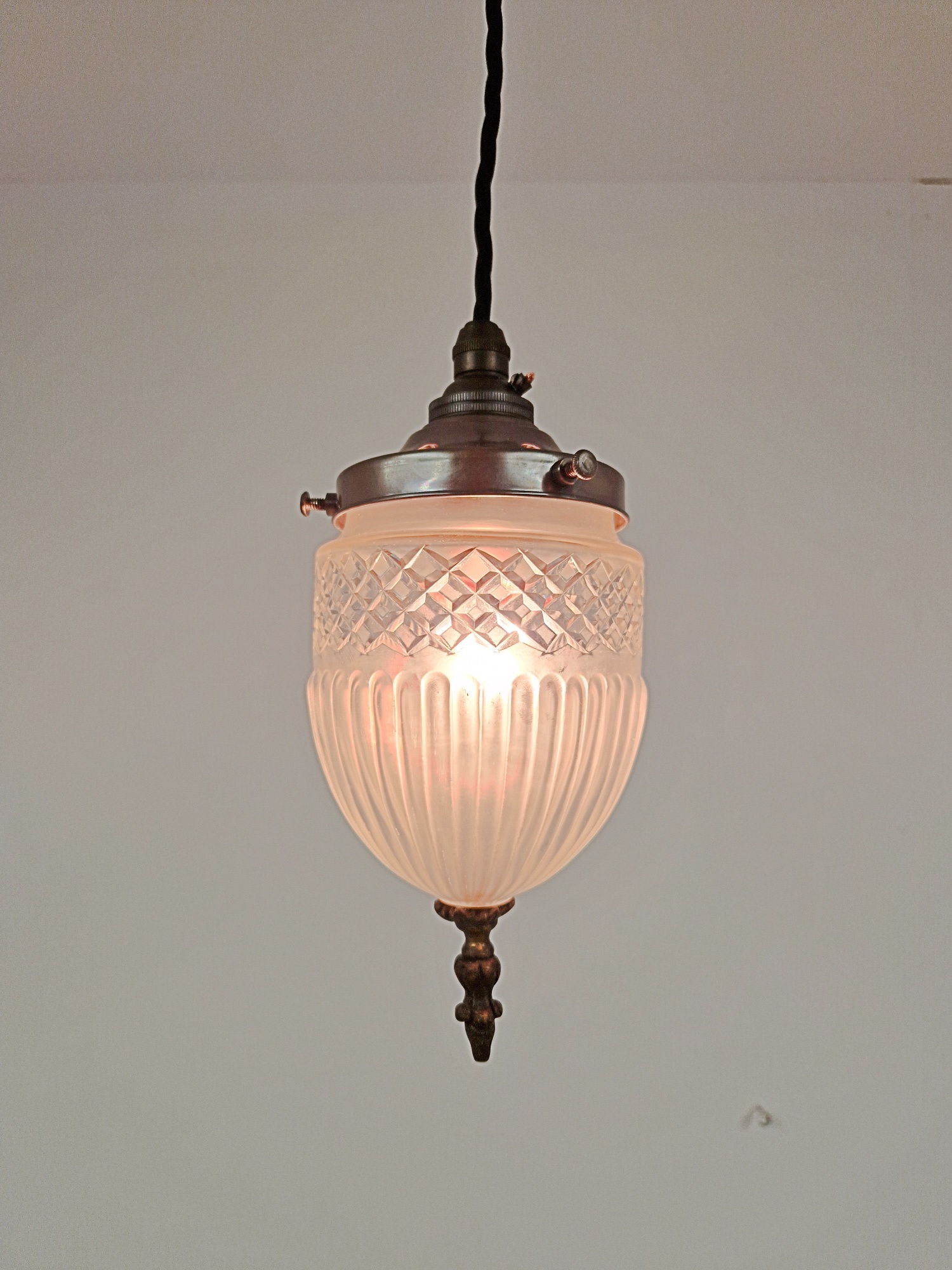 Product Code: JAL0773cA set of 3 frosted and cut-glass pendants in neo-classical taste, each globular lampshade set with a bronzed finial. England c1905