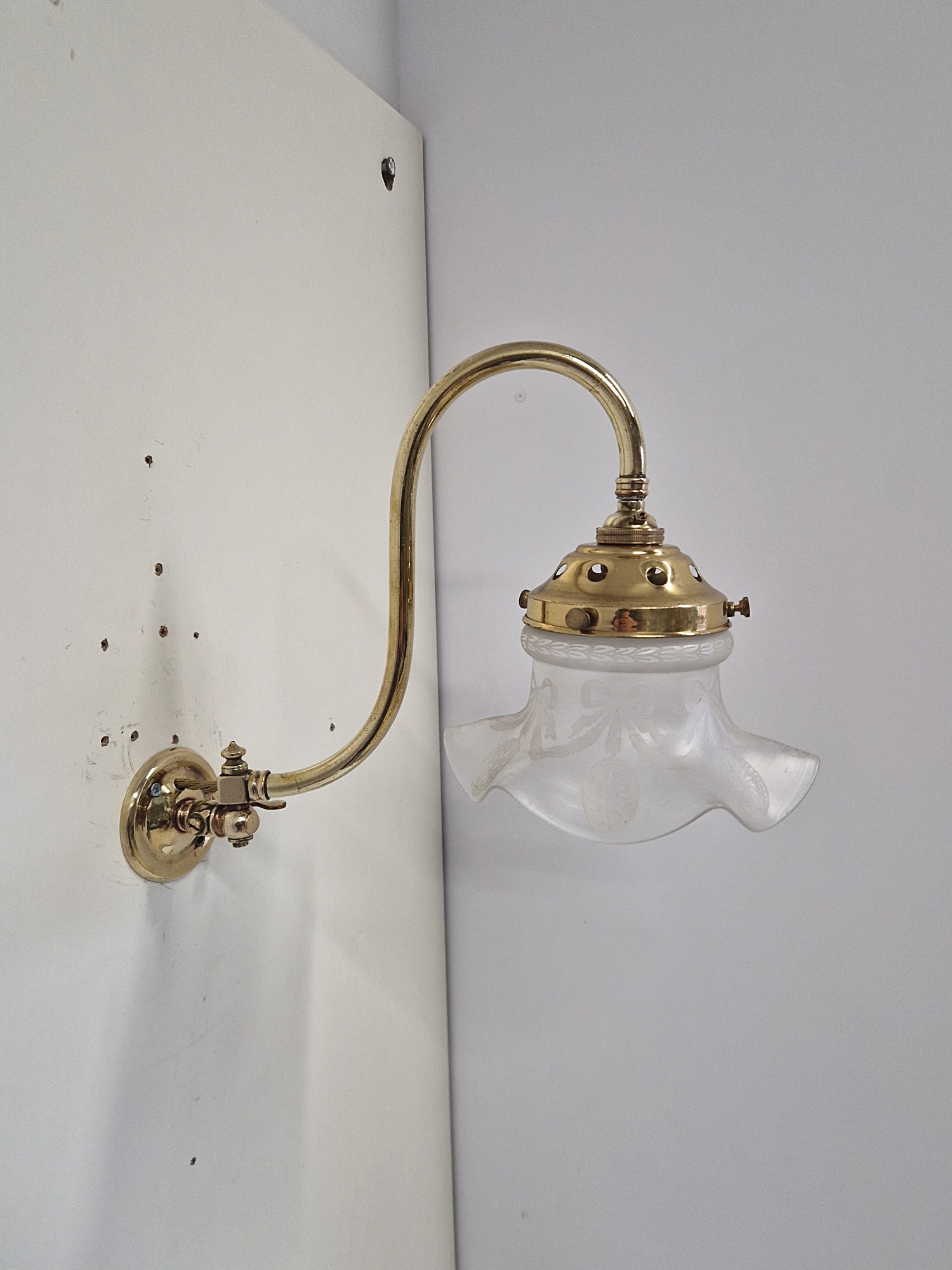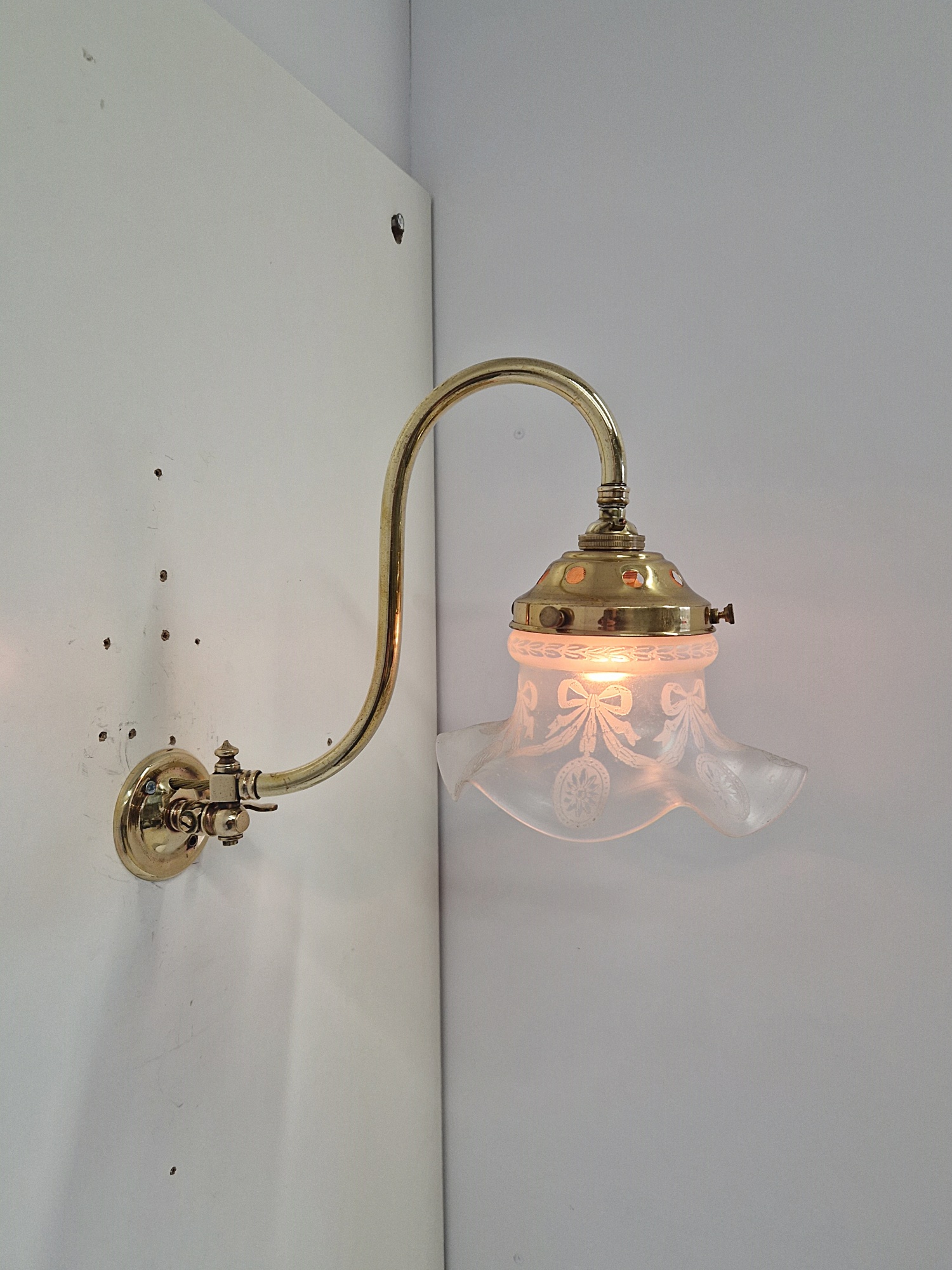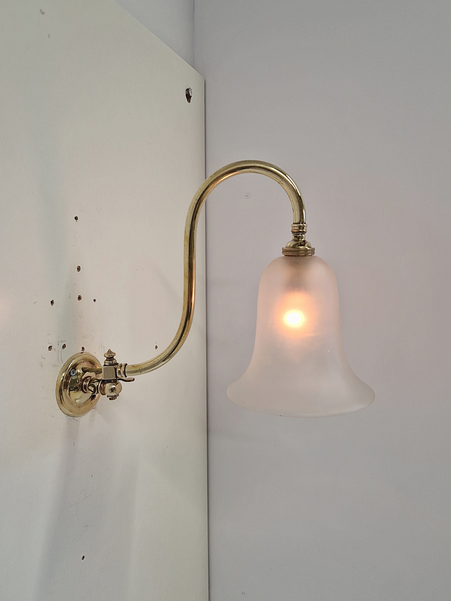Product Code: TJP068.G010.SA018A collection of 5 similar but not identical swivel swan-neck gas wall lights, converted for electricity available with either a satin and acid-etched gas shades or an electric plain satin-glass bell lampshades. English C1910.