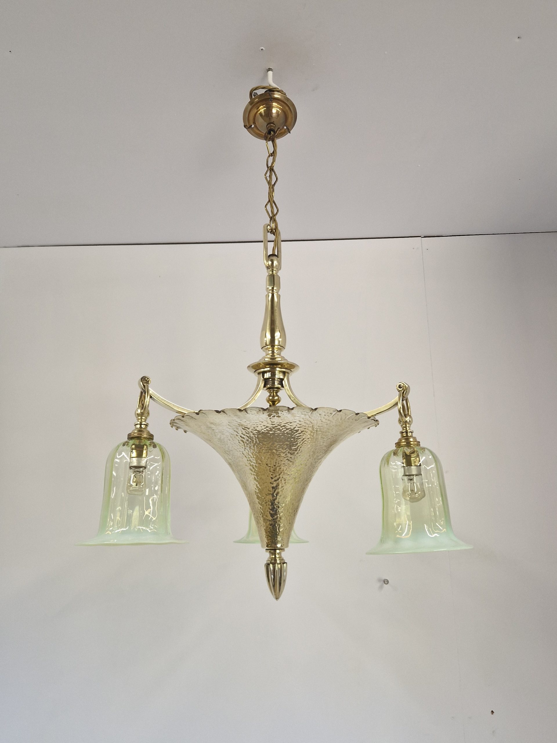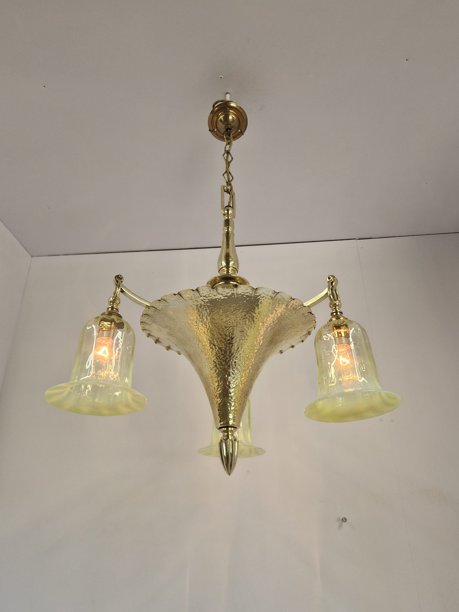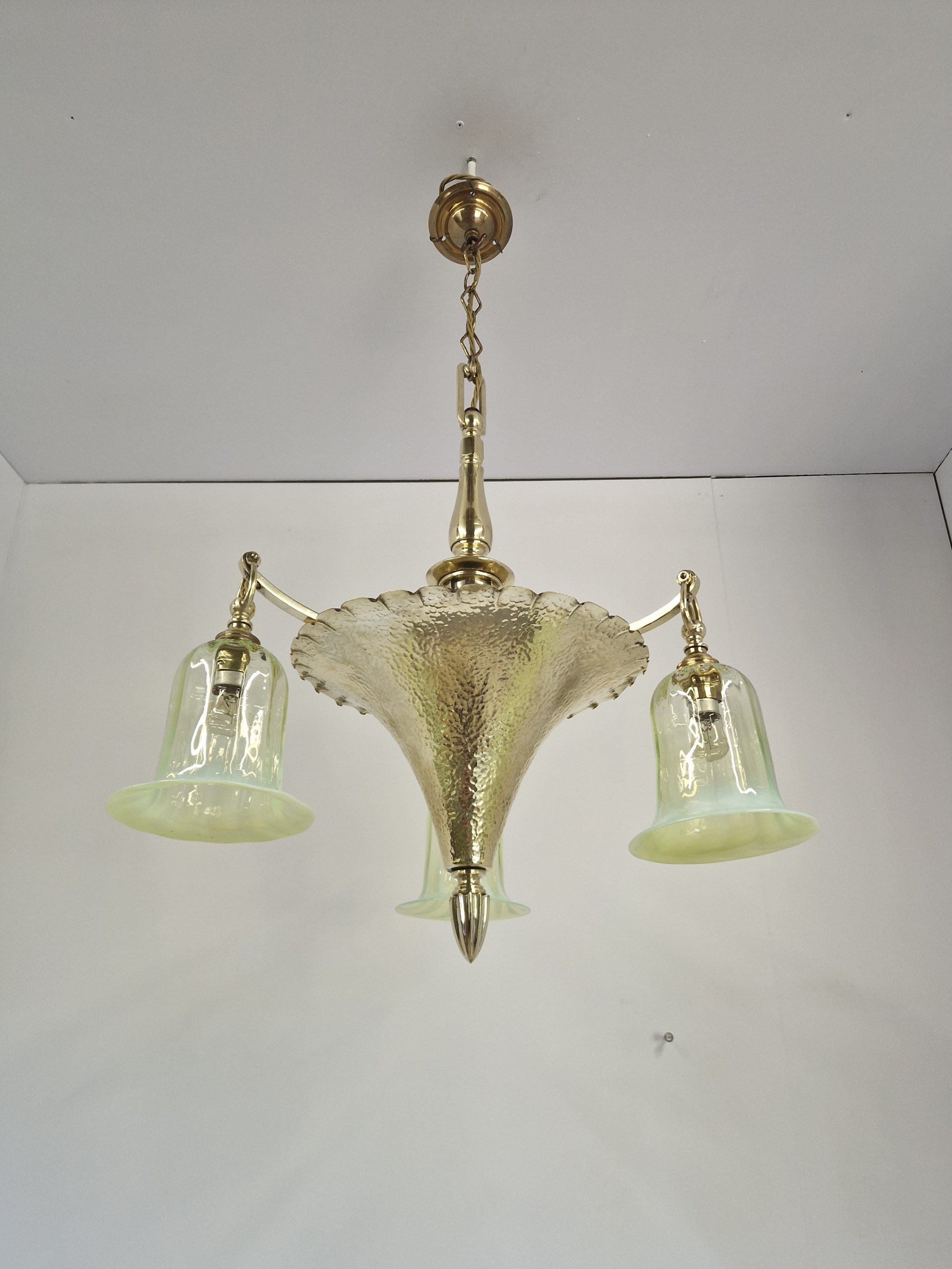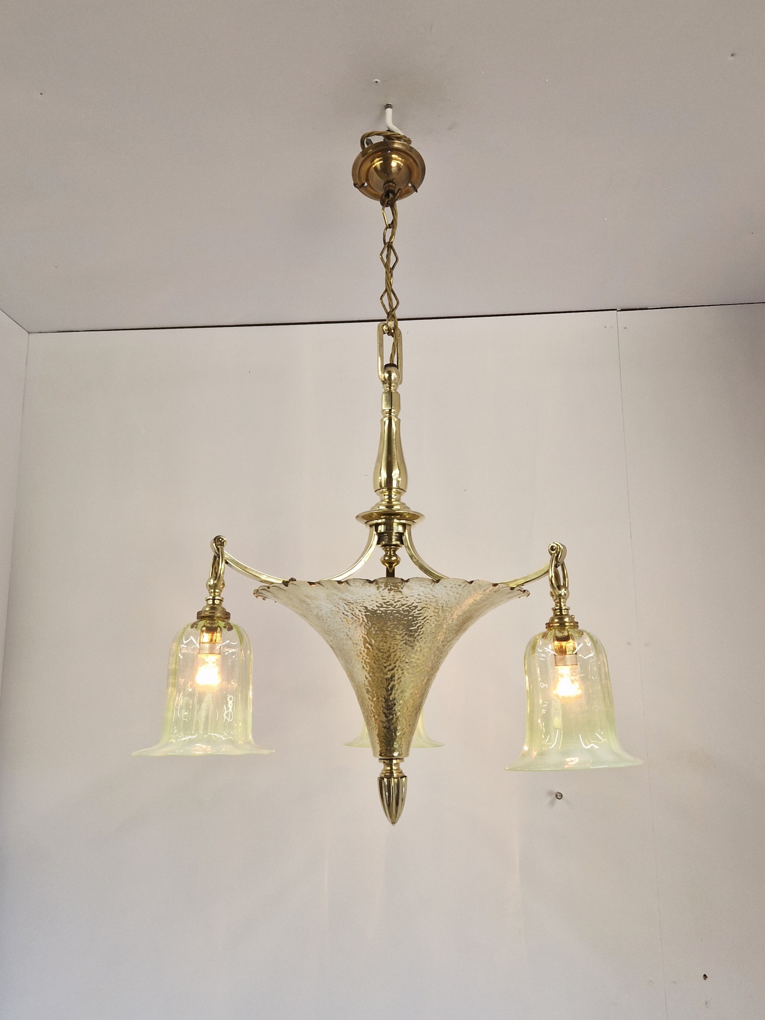 Product Code: JAL1178NS001An attractive arts & crafts three-branch ceiling lights by an unknown designer. The brass light complimented by 3 reproduction vaseline-glass lampshades. England c.1905
