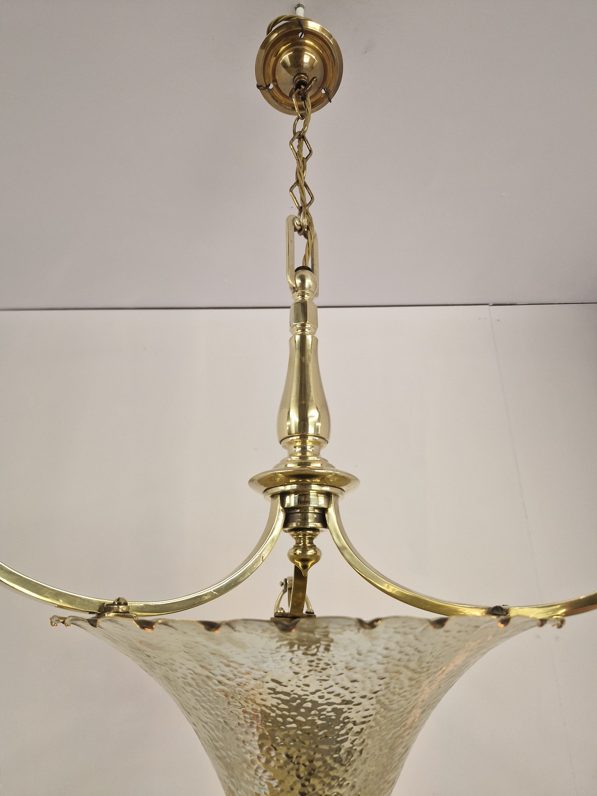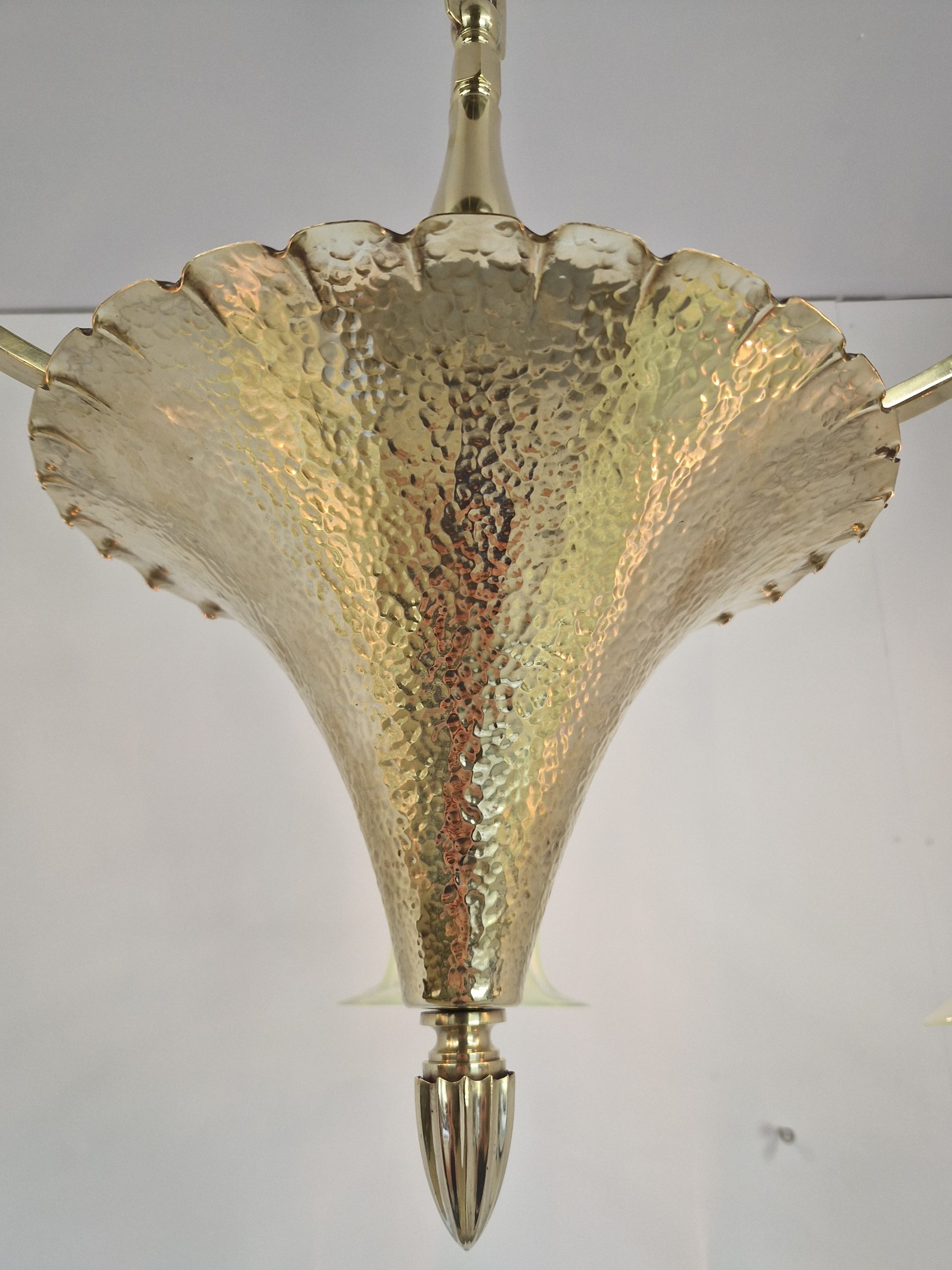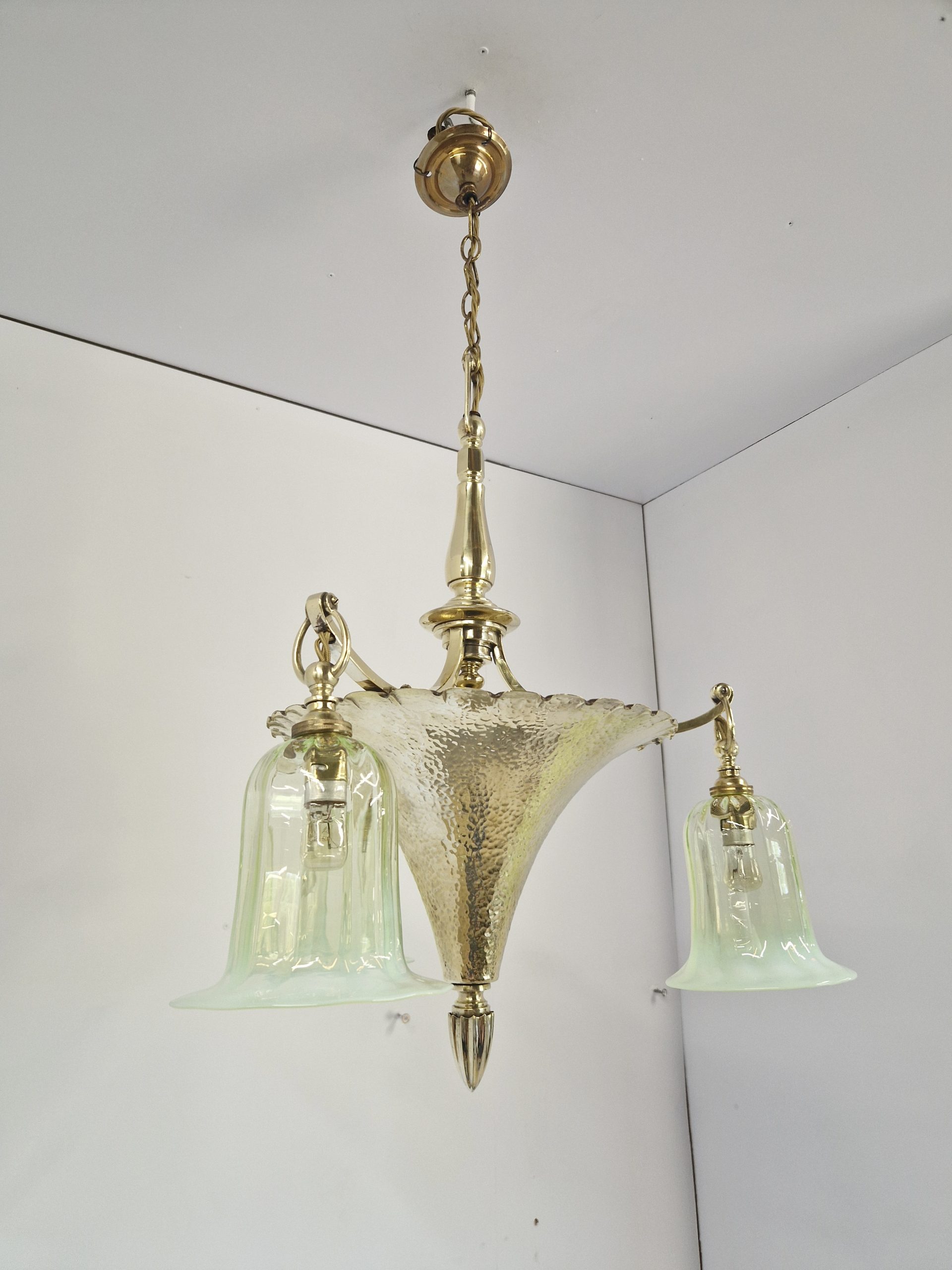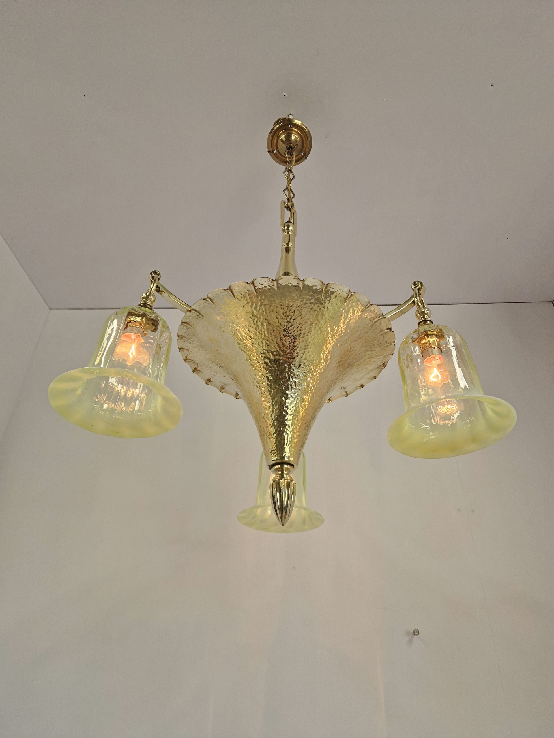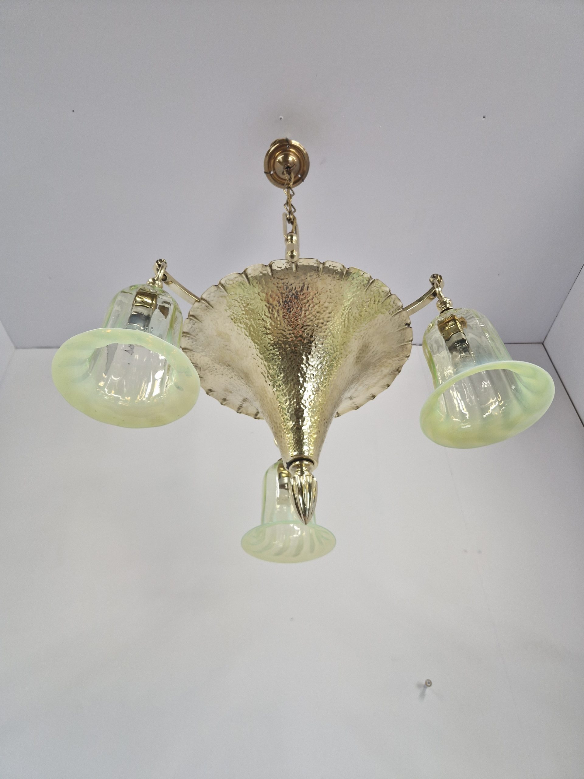 Product Code: JAL1178NS001An attractive arts & crafts three-branch ceiling lights by an unknown designer. The brass light complimented by 3 reproduction vaseline-glass lampshades. England c.1905