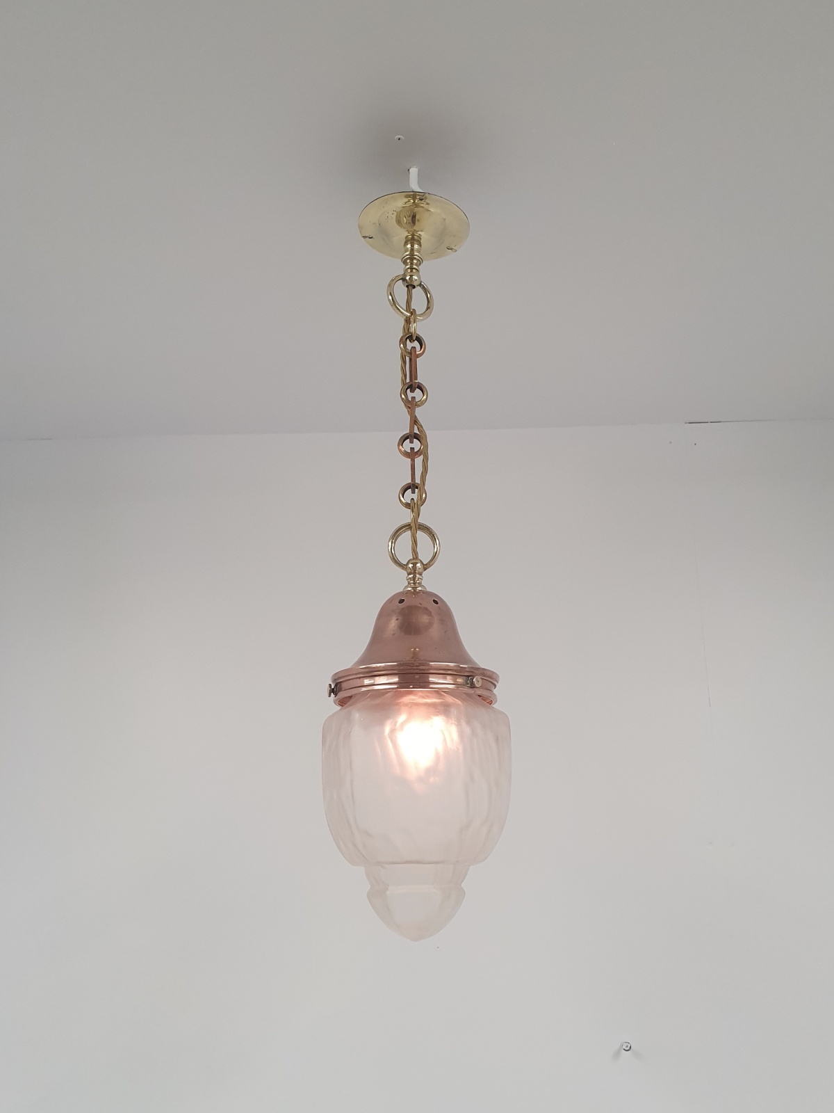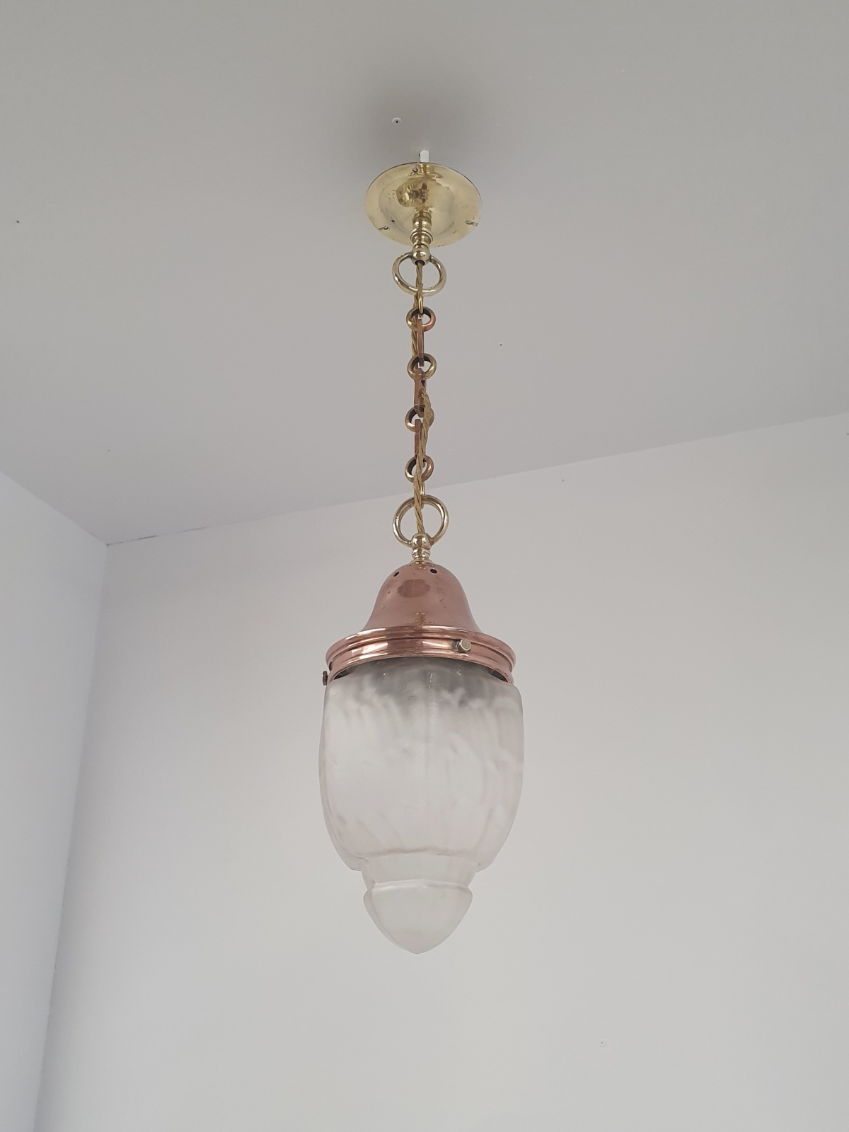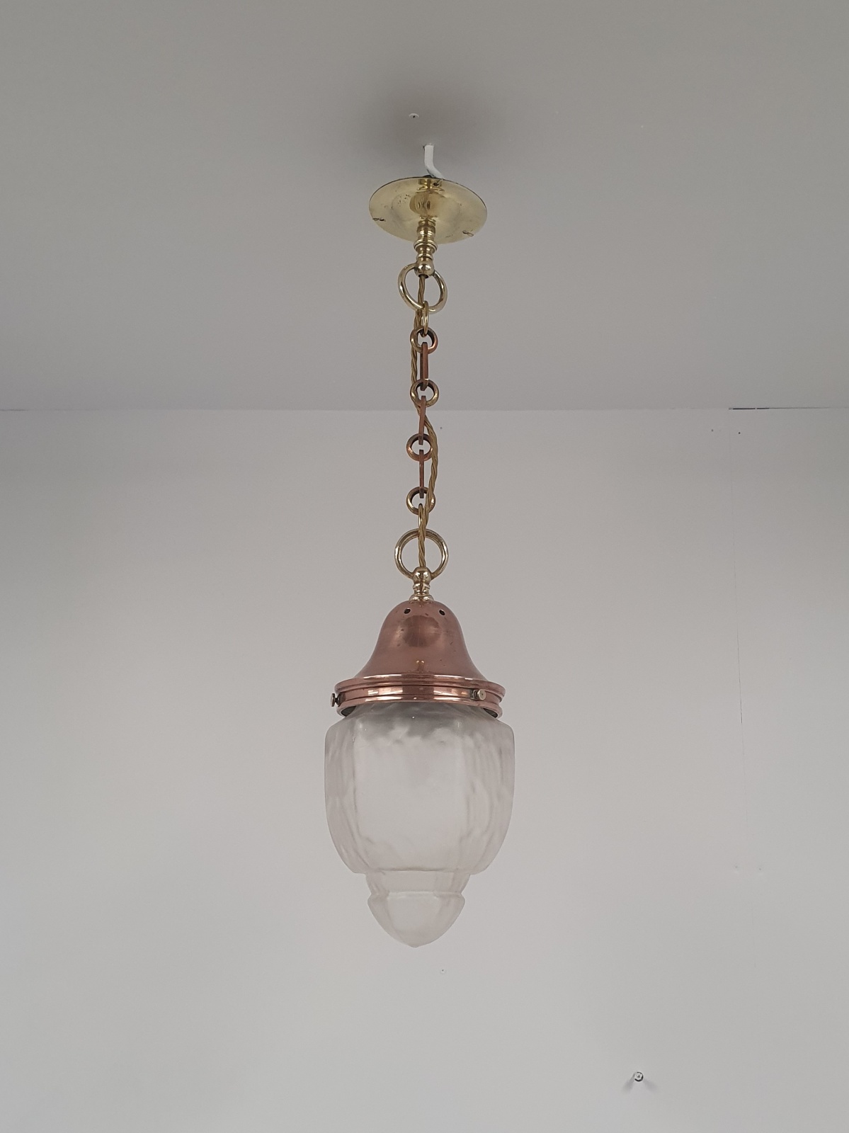 Product Code: JAL1107A copper and brass arts and crafts hall lantern. The stepped satin-glass globe-shade hangs pendant from its original period fitments. England c.1900
