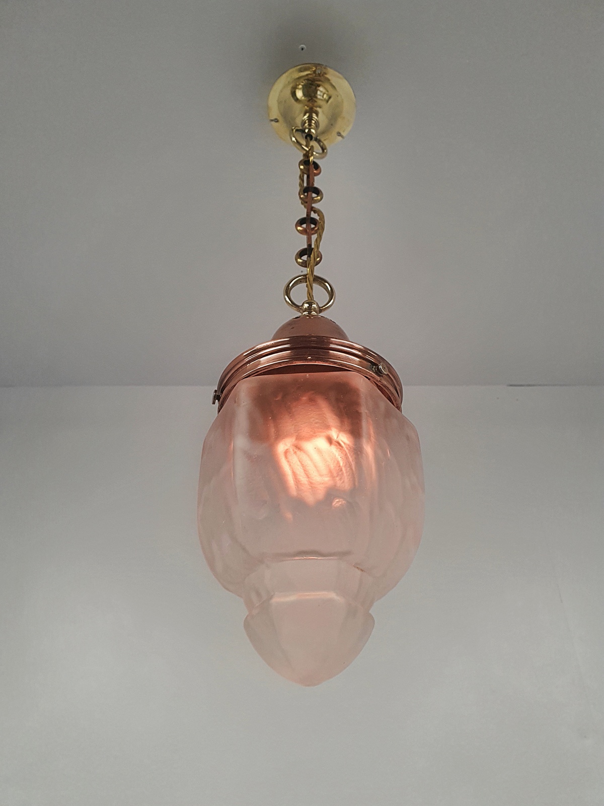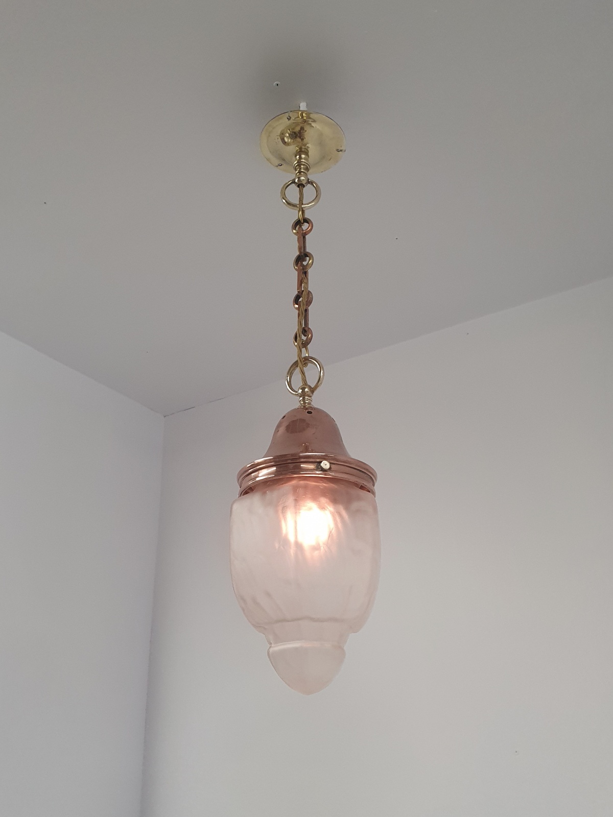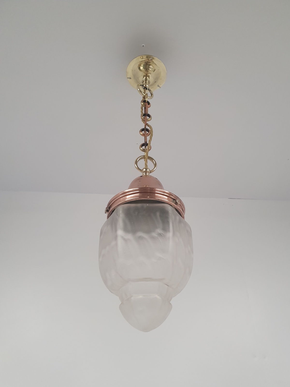Product Code: JAL1107A copper and brass arts and crafts hall lantern. The stepped satin-glass globe-shade hangs pendant from its original period fitments. England c.1900