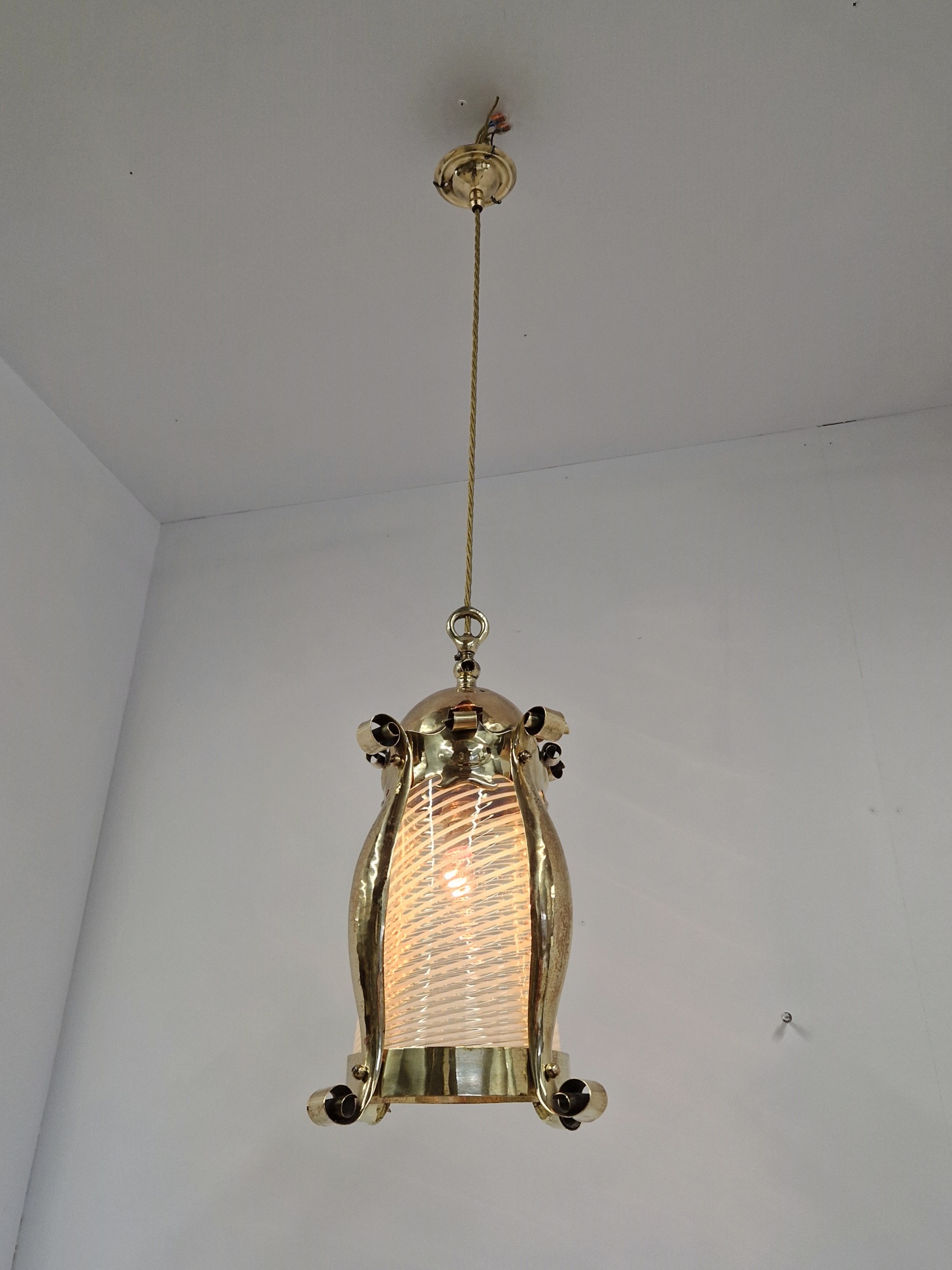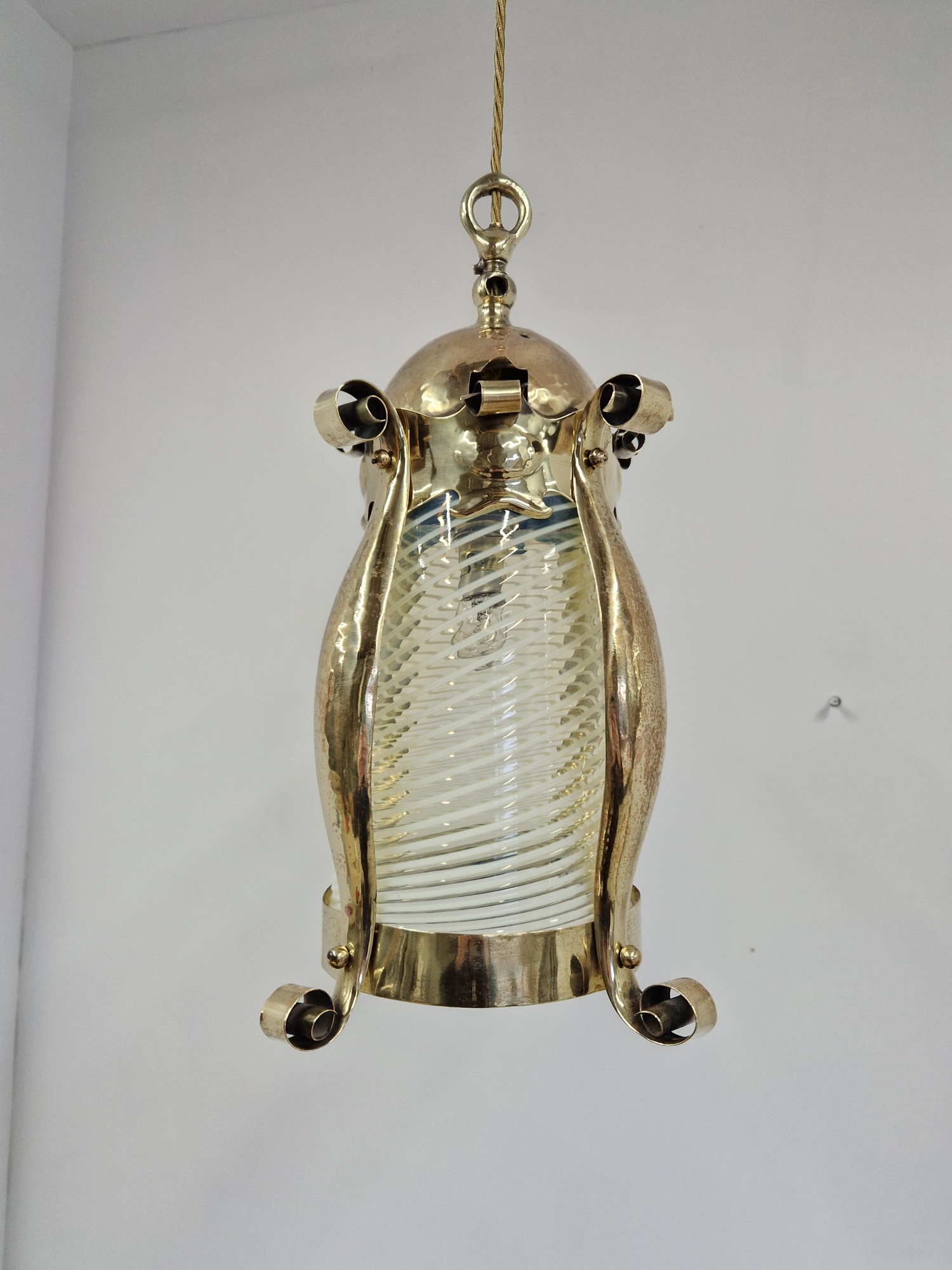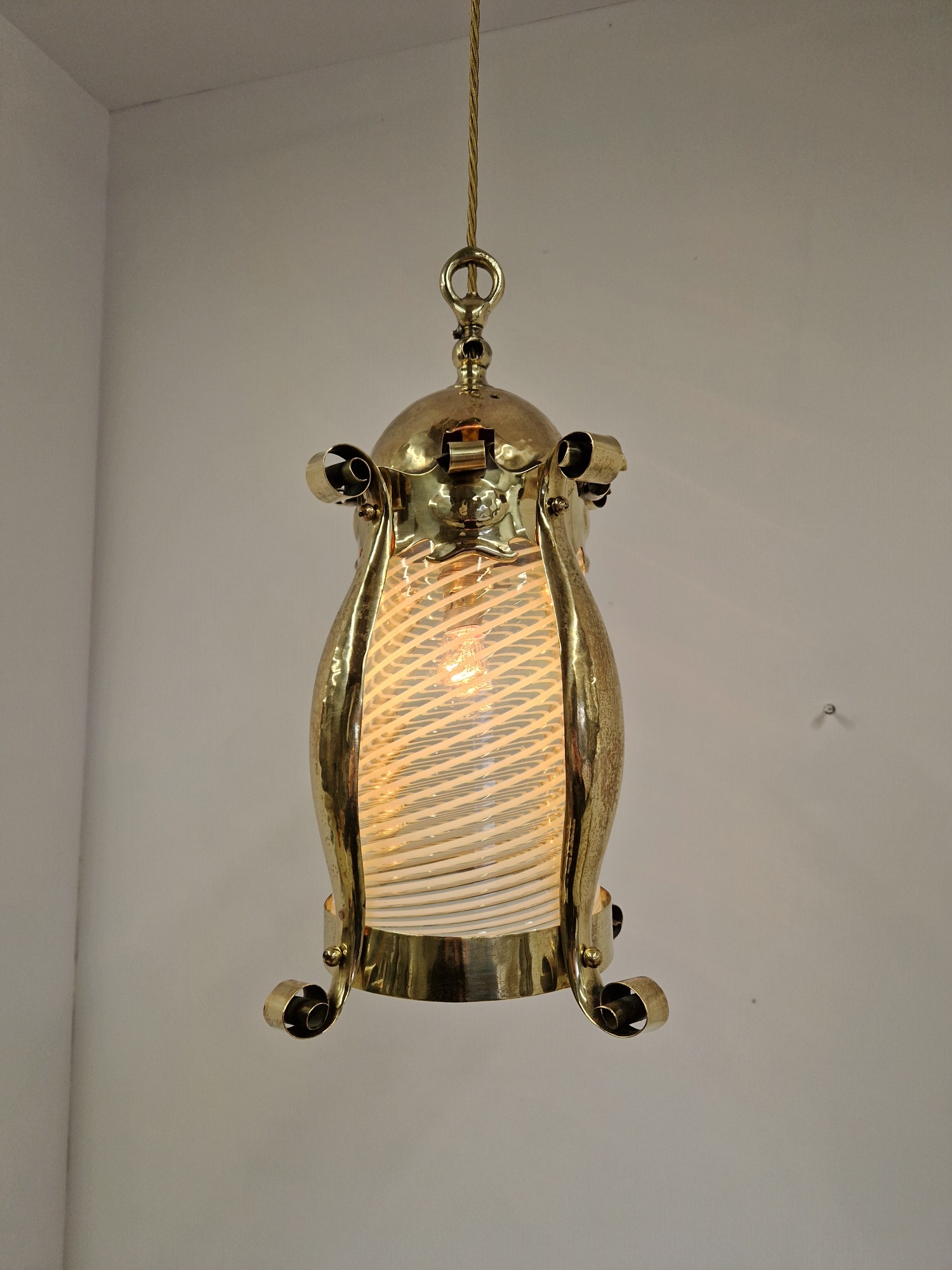 Product Code: JAL1122An arts and crafts lantern by an unknown designer possibly originally designed for gas, the lightly polished brass framework with a lightly-hammered finish and containing the original vaseline-glass cylinder insert possibly by James Powell & Sons of Whitefriars. The lantern now hangs pendant via cordgrip with a replacement ceiling rose for suspension. England,c.1900.
