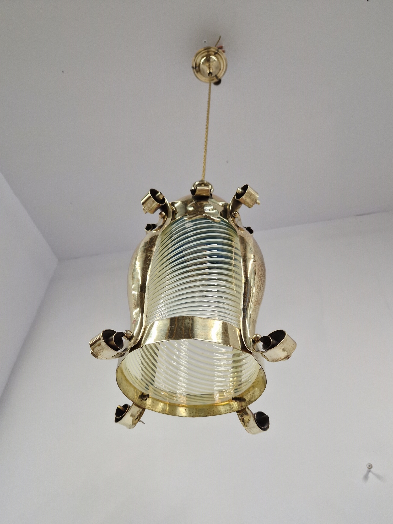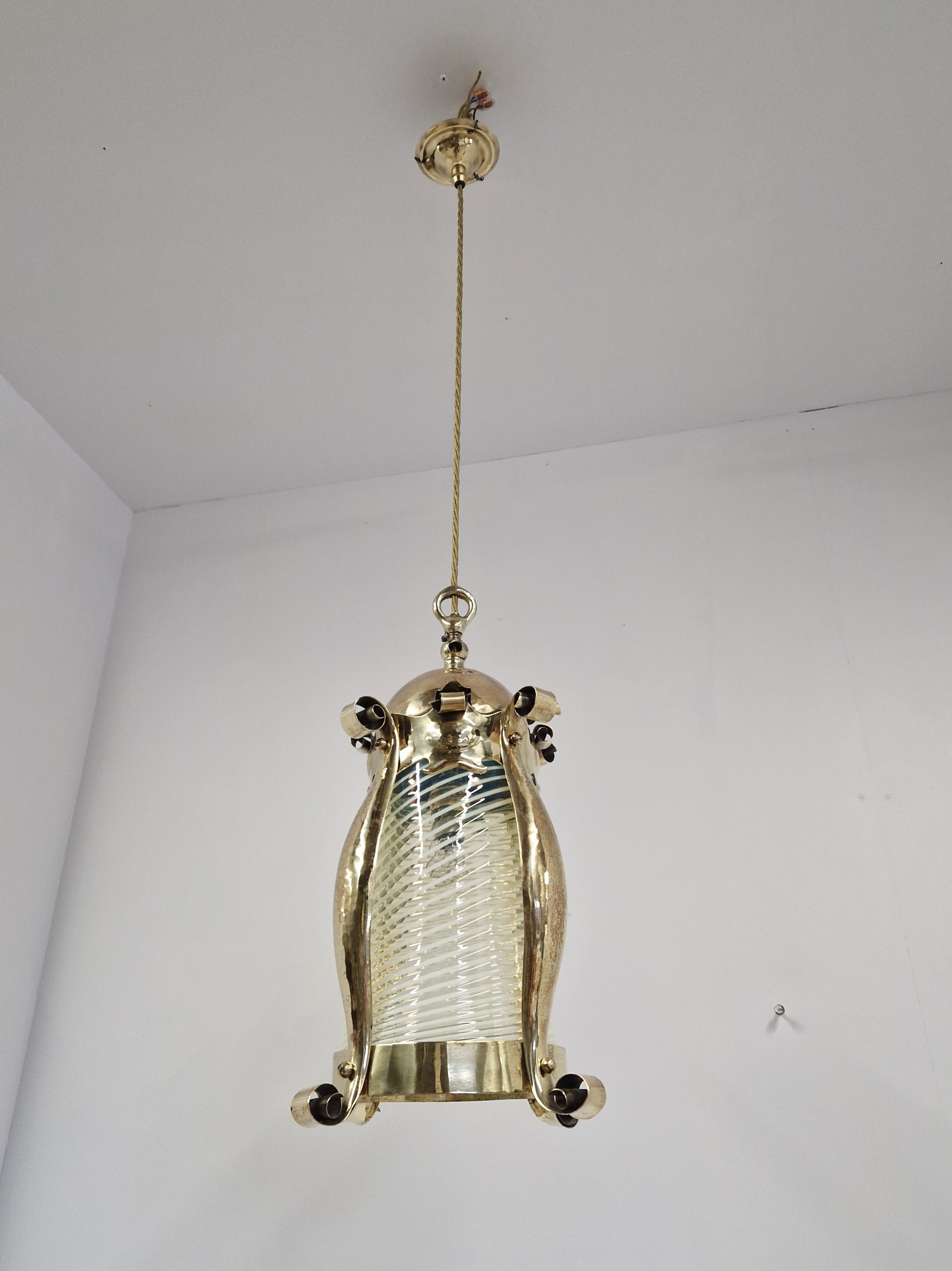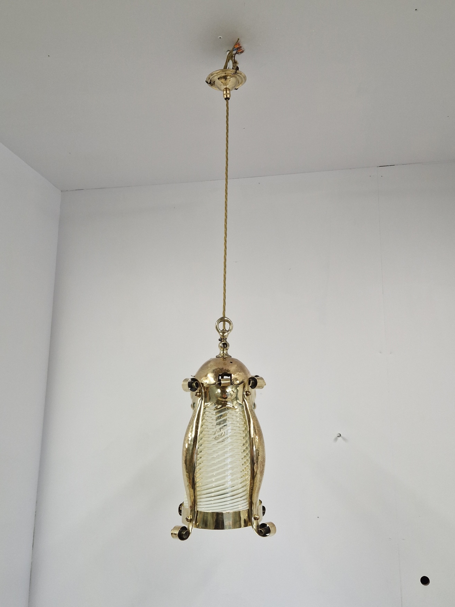 Product Code: JAL1122An arts and crafts lantern by an unknown designer possibly originally designed for gas, the lightly polished brass framework with a lightly-hammered finish and containing the original vaseline-glass cylinder insert possibly by James Powell & Sons of Whitefriars. The lantern now hangs pendant via cordgrip with a replacement ceiling rose for suspension. England,c.1900.