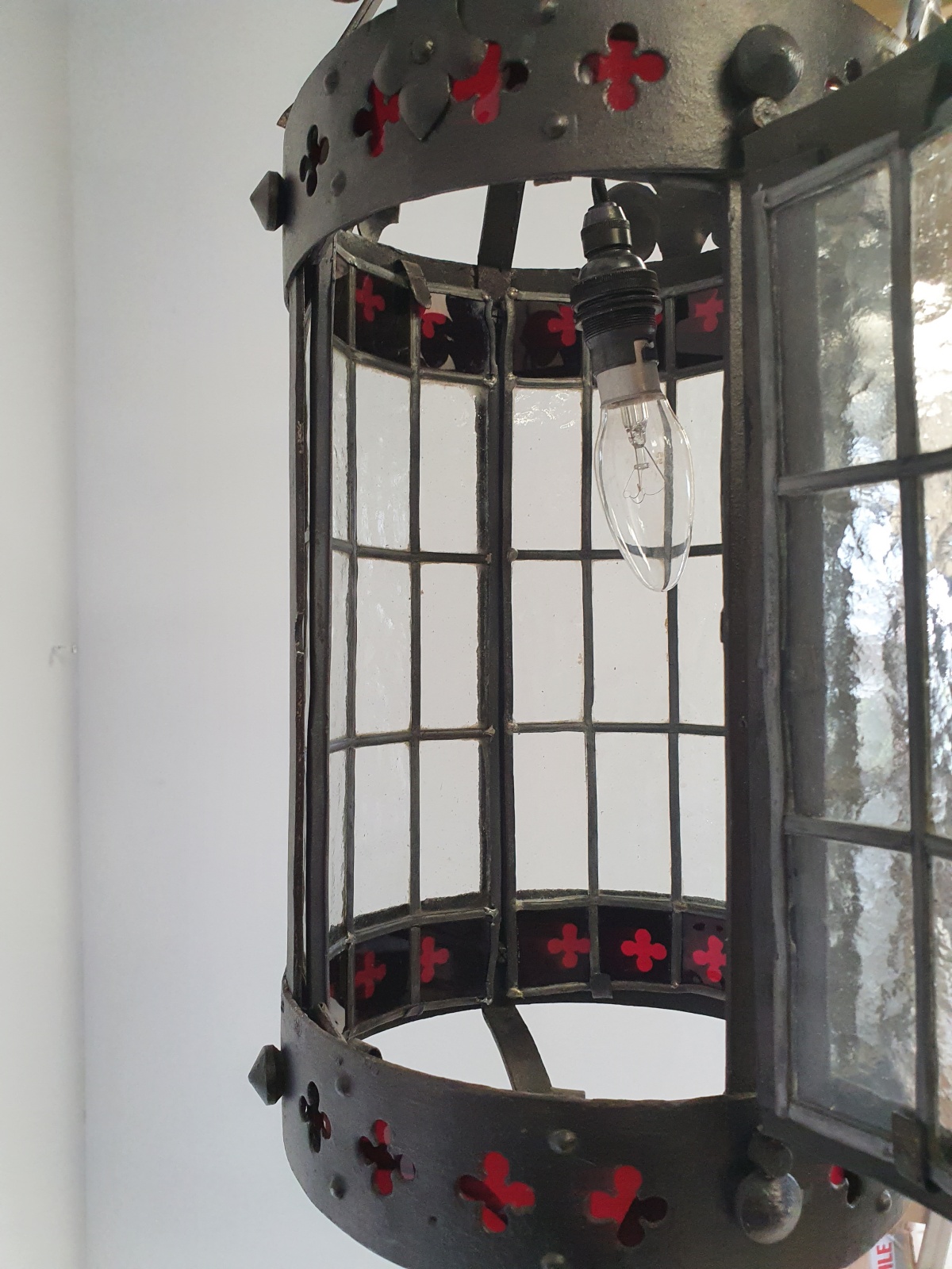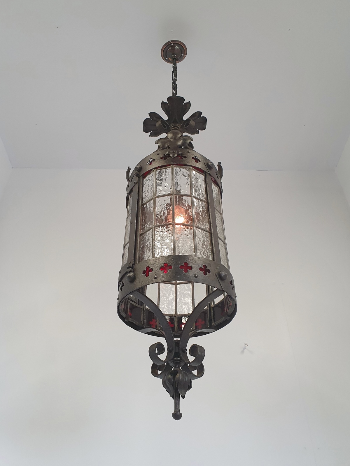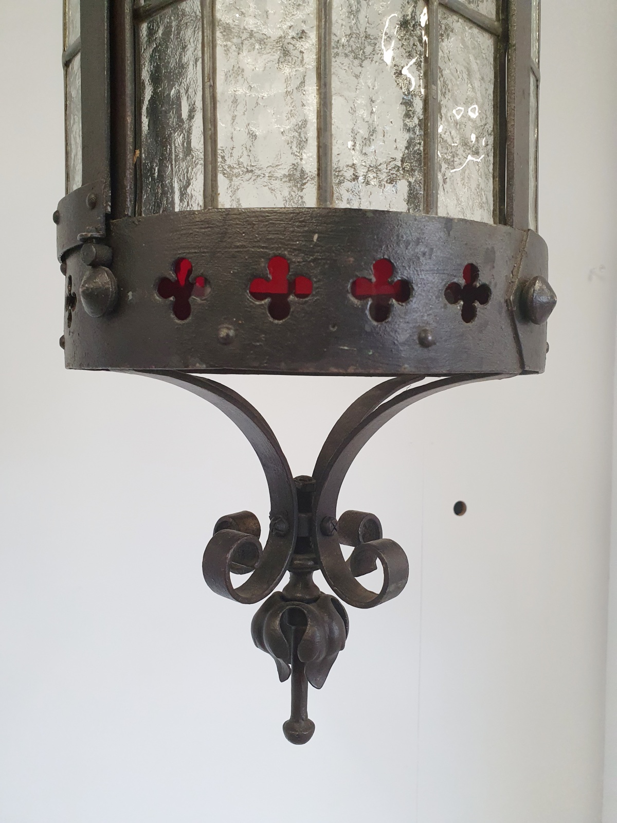 Product Code: JAL1082An excellent quality wrought-iron arts and crafts lantern originally designed for gas and now sympathetically converted to electricity produced by an unknown designer. This late Victorian lantern comes with the original lead-lined clear and red glass panels. England c.1870