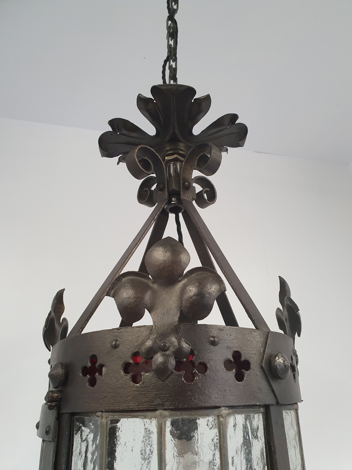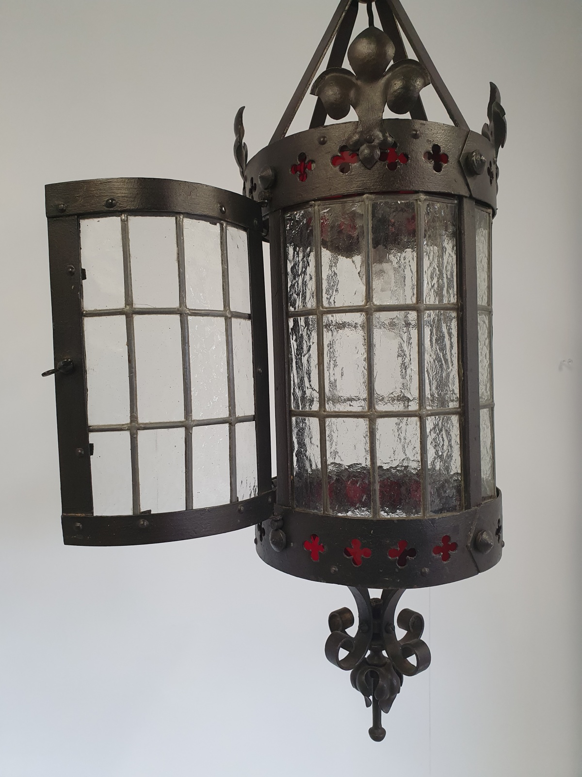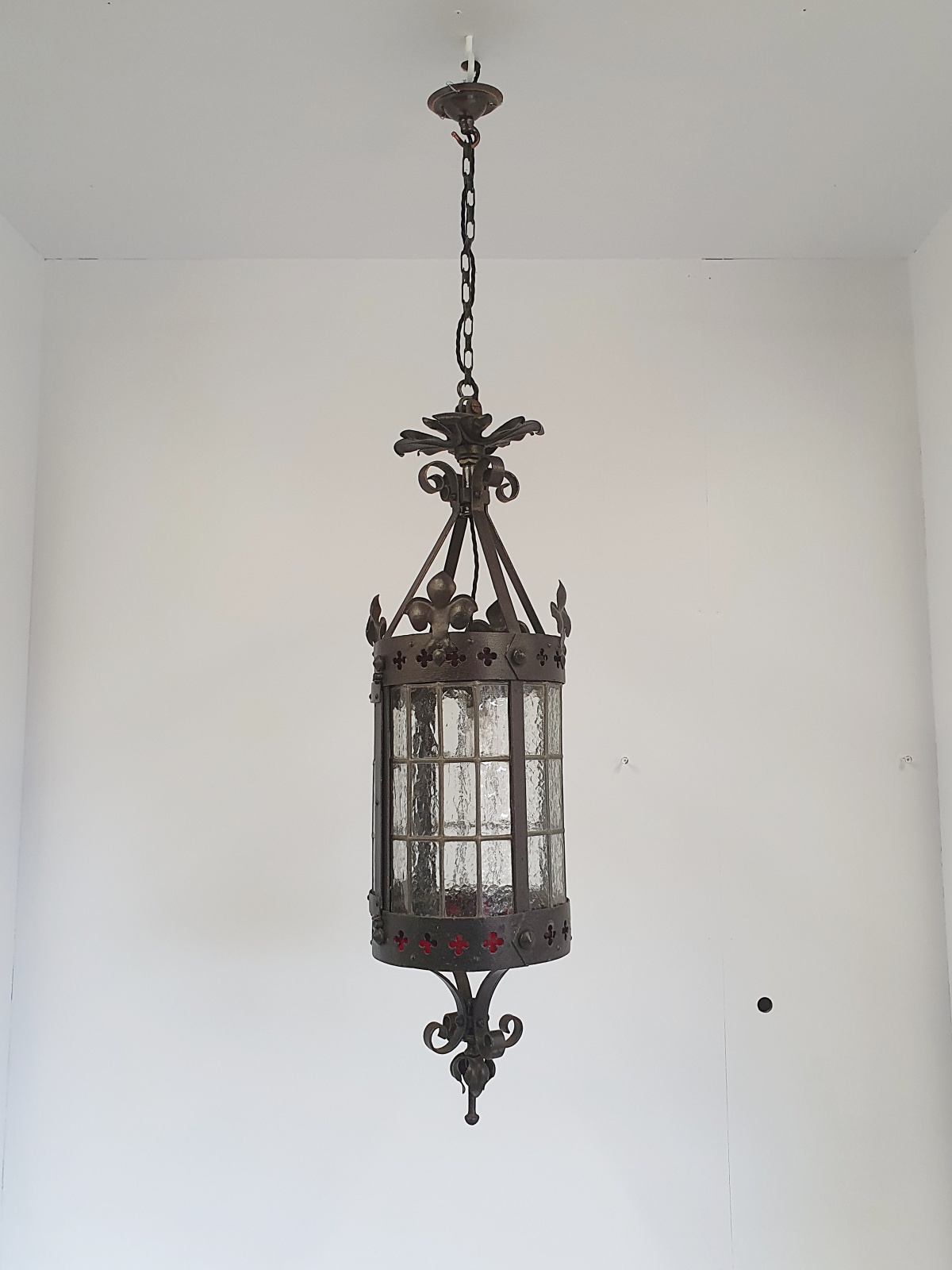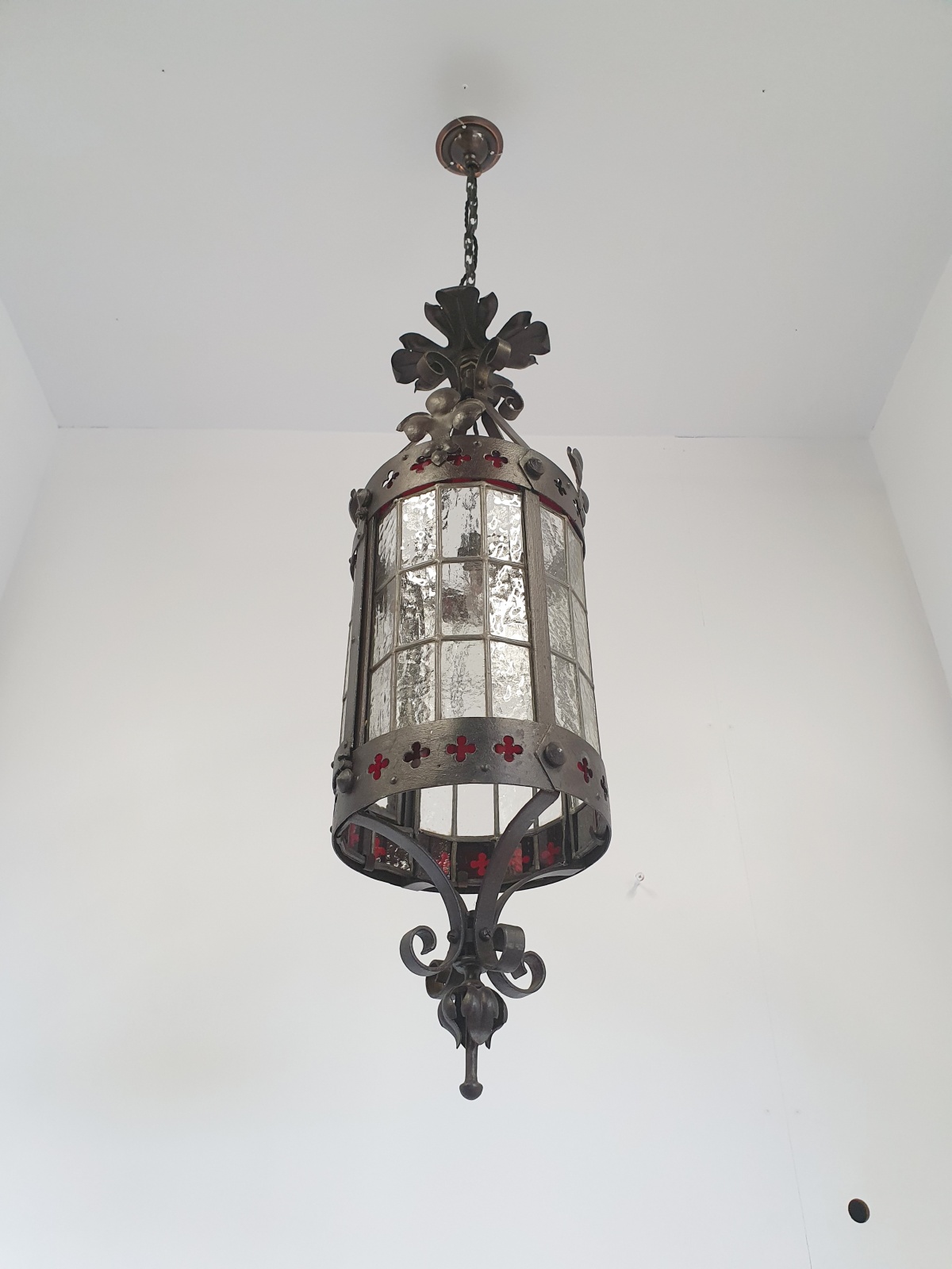 Product Code: JAL1082An excellent quality wrought-iron arts and crafts lantern originally designed for gas and now sympathetically converted to electricity produced by an unknown designer. This late Victorian lantern comes with the original lead-lined clear and red glass panels. England c.1870