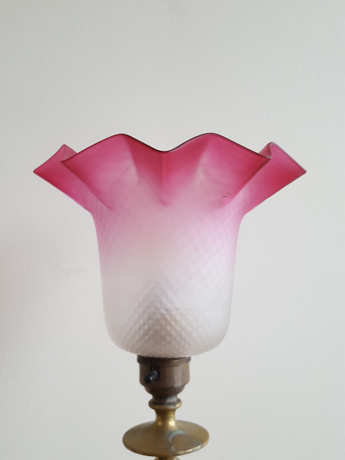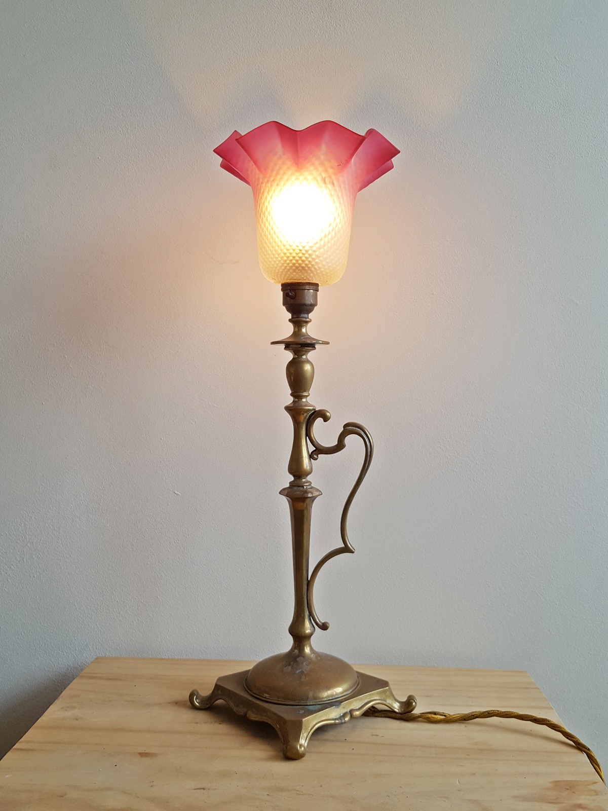 A cast brass Edwardian table lamp of chamberstick form, the base supports a satin-glass cranberry lampshade. England c1905