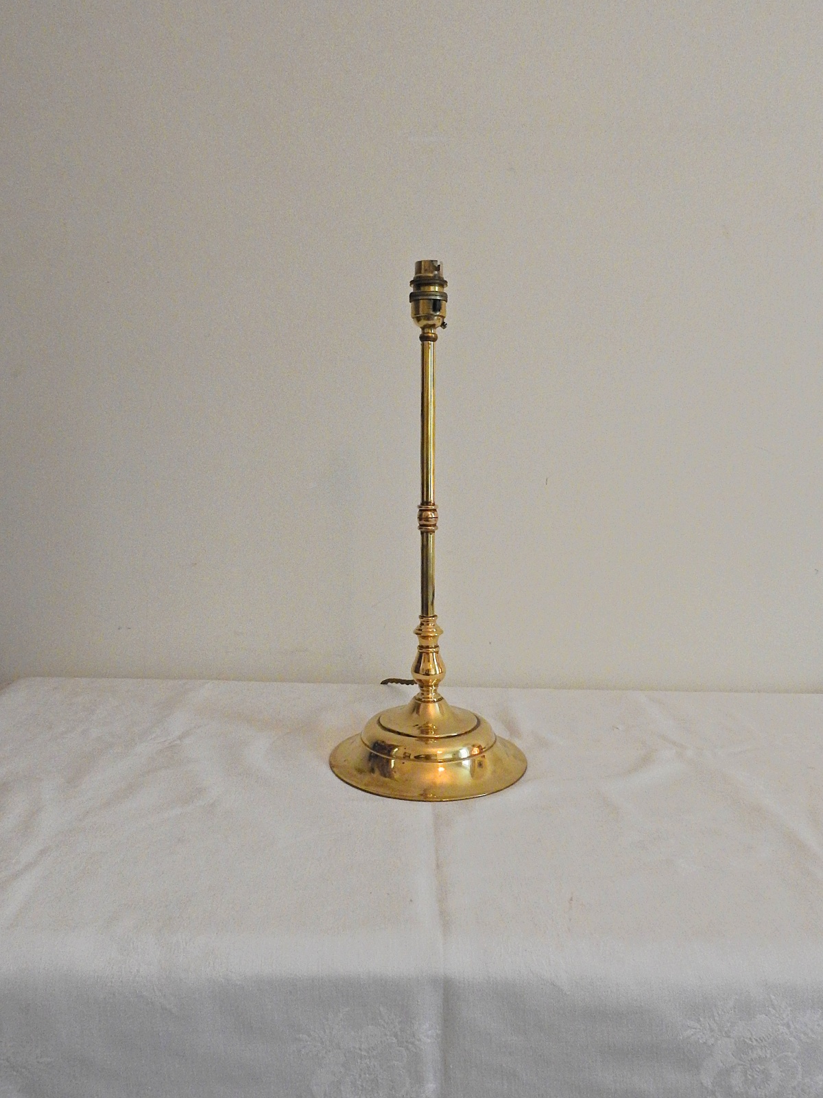 An early c.20th cast-brass table standard with impressive circular base and photographed with a fabric shade (not for sale). English c.1905