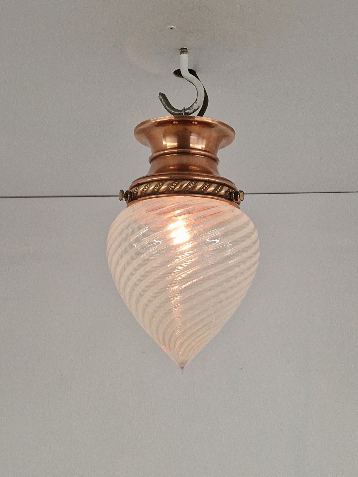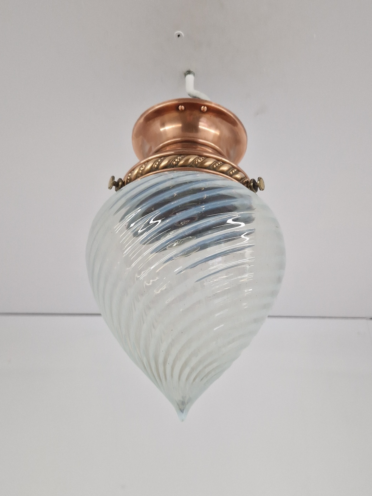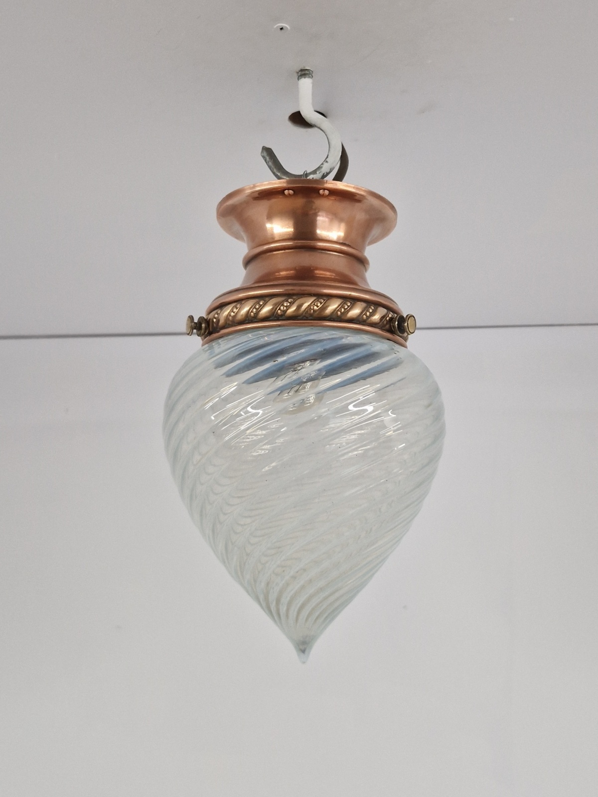 An arts & crafts copper flush mounting lantern, ideal for a low ceiling or small enclave. The original blue vaseline-glass globe shade with attractive swirl pattern. English c1900