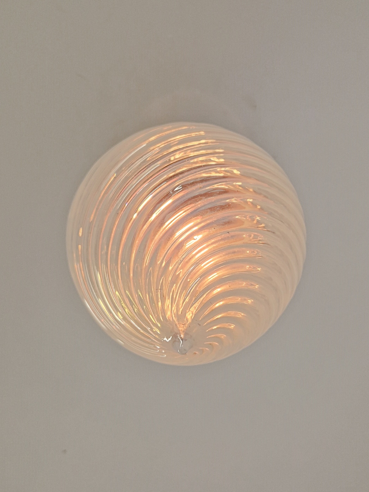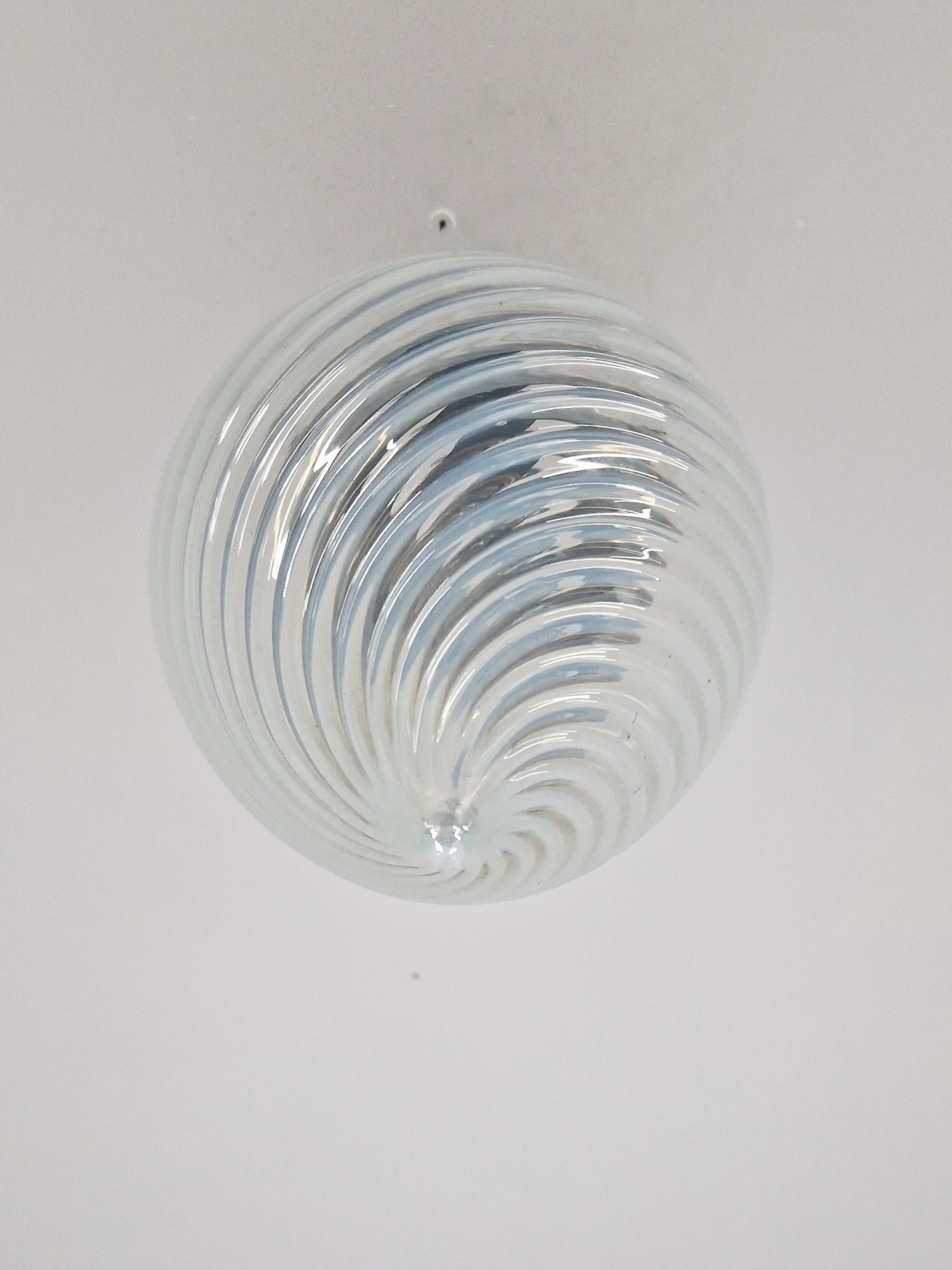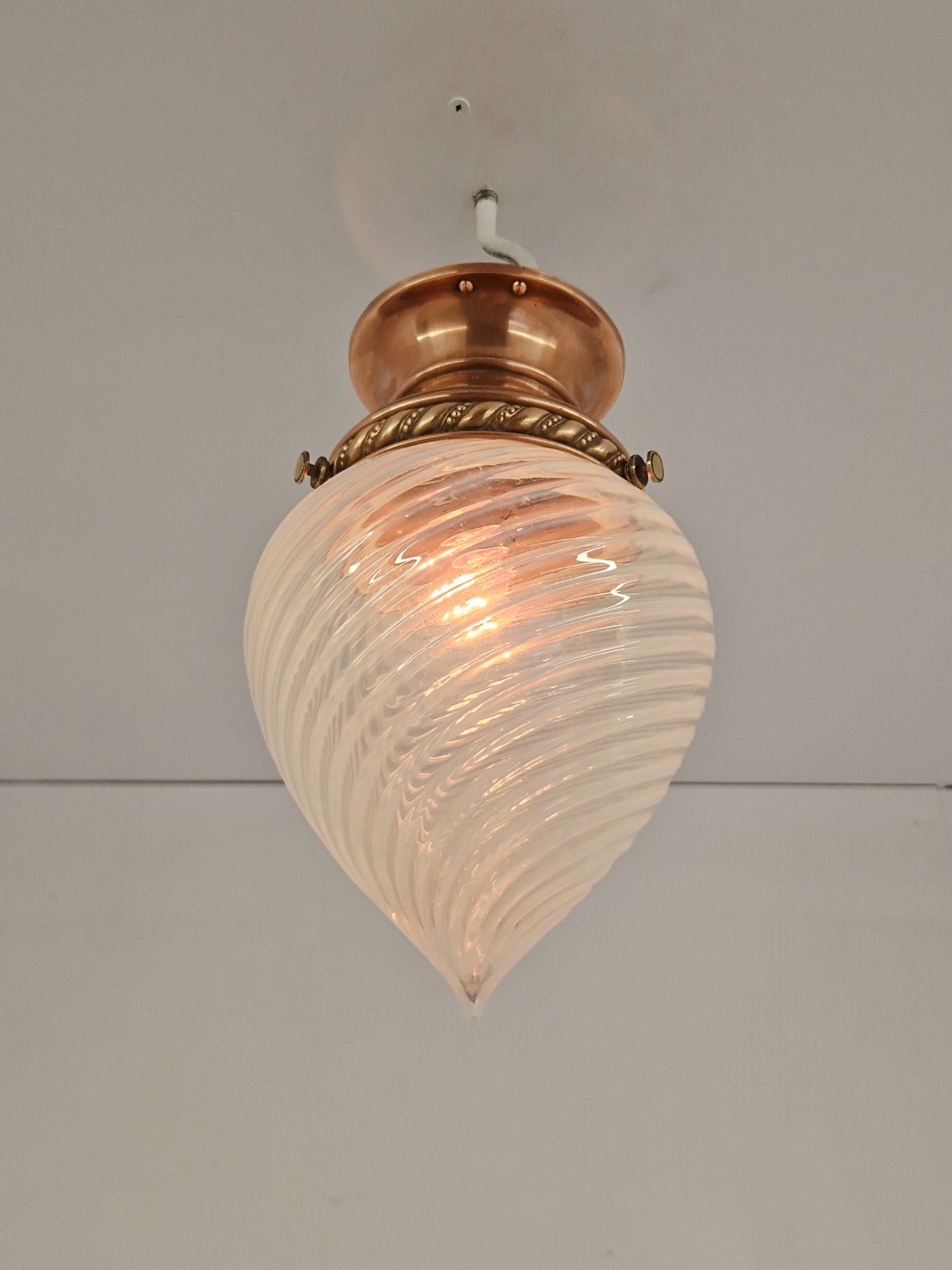 An arts & crafts copper flush mounting lantern, ideal for a low ceiling or small enclave. The original blue vaseline-glass globe shade with attractive swirl pattern. English c1900