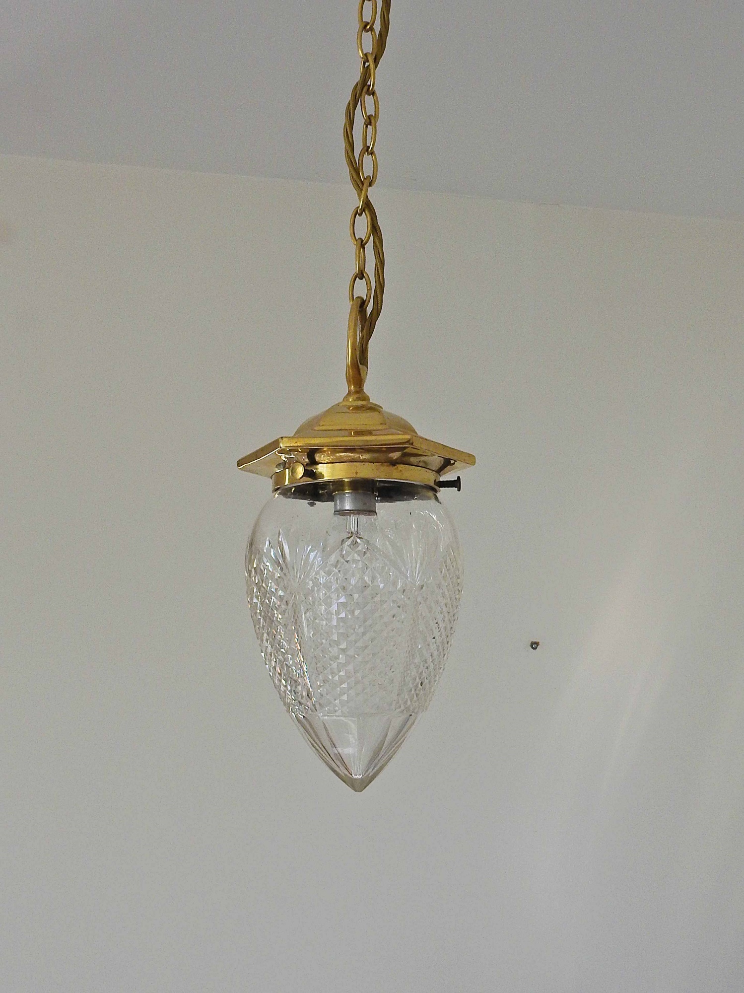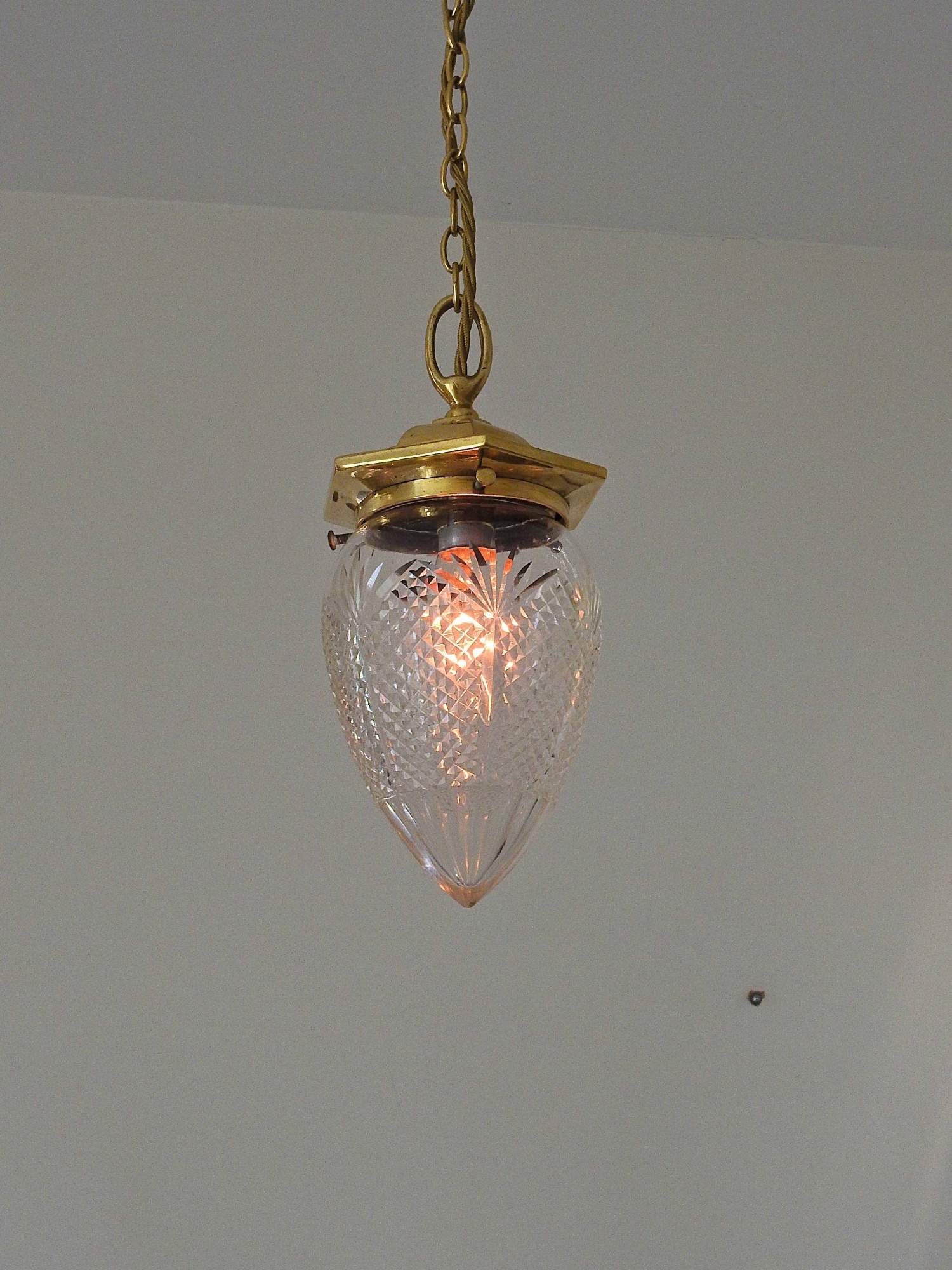 Product Code: LG508A stylish cut-glass “pineapple” lampshade with good brass gallery of hexagonal section and replacement chain and ceiling rose for suspension. England early c.20th