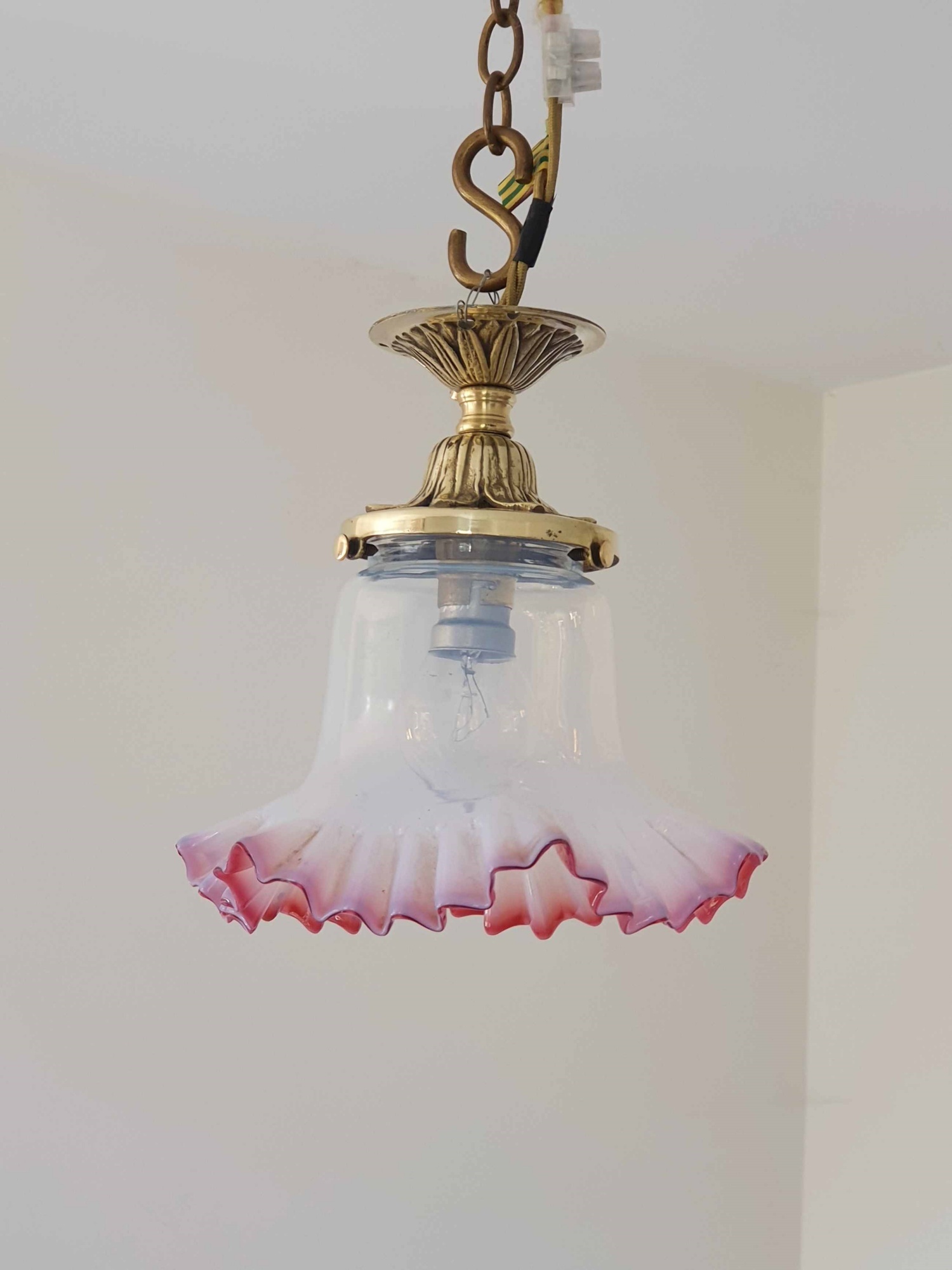 A small hall or corridor flush mounting light. The Edwardian brass fitment with an attractive opalescent and cranberry glass lampshade. England c.1910
