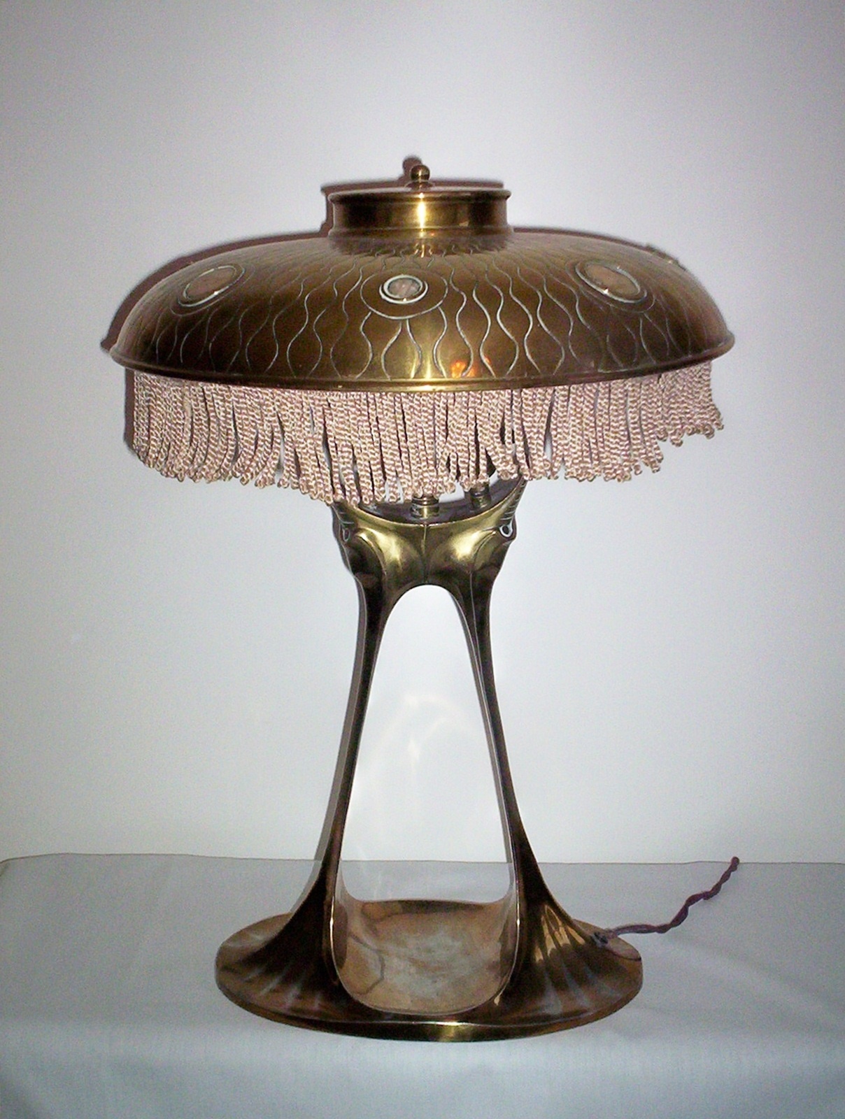 Product Code: JAL0228A large and important brass Jugendstil desk lamp by an unknown designer. The exceptional handcrafted base, created as one piece, with the legs representing 2 abstract mythological carp rising from below. The large shade inset with mother-of-pearl shell cabochons and maintaining it’s original decorative fringe; Germany, c1900