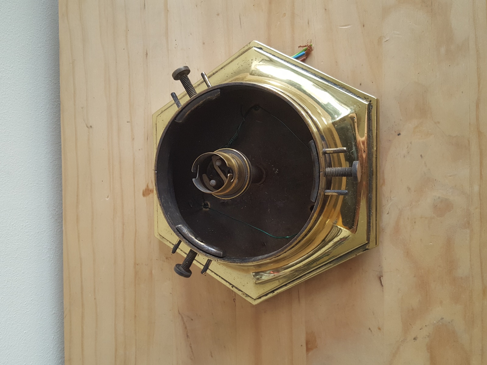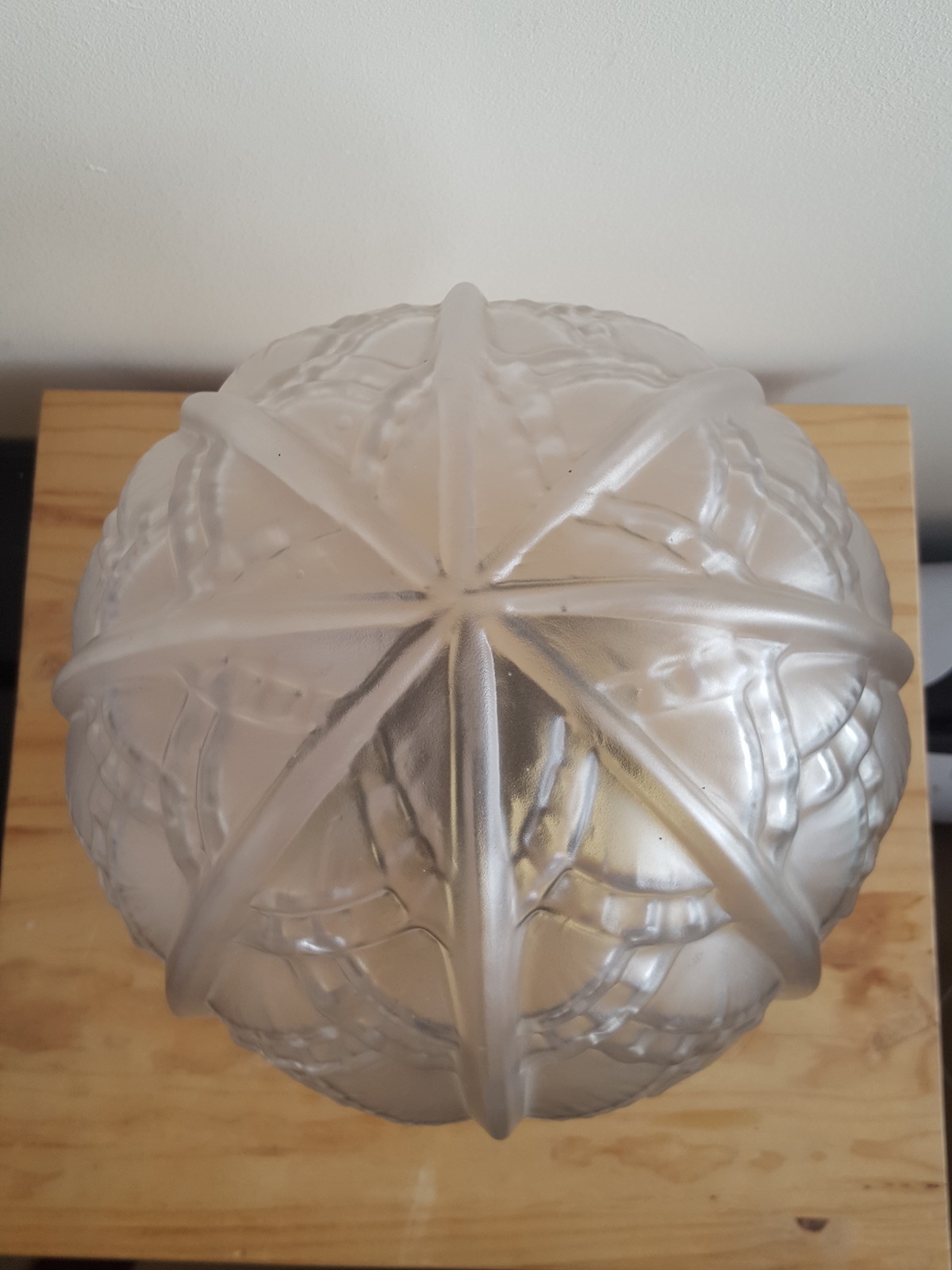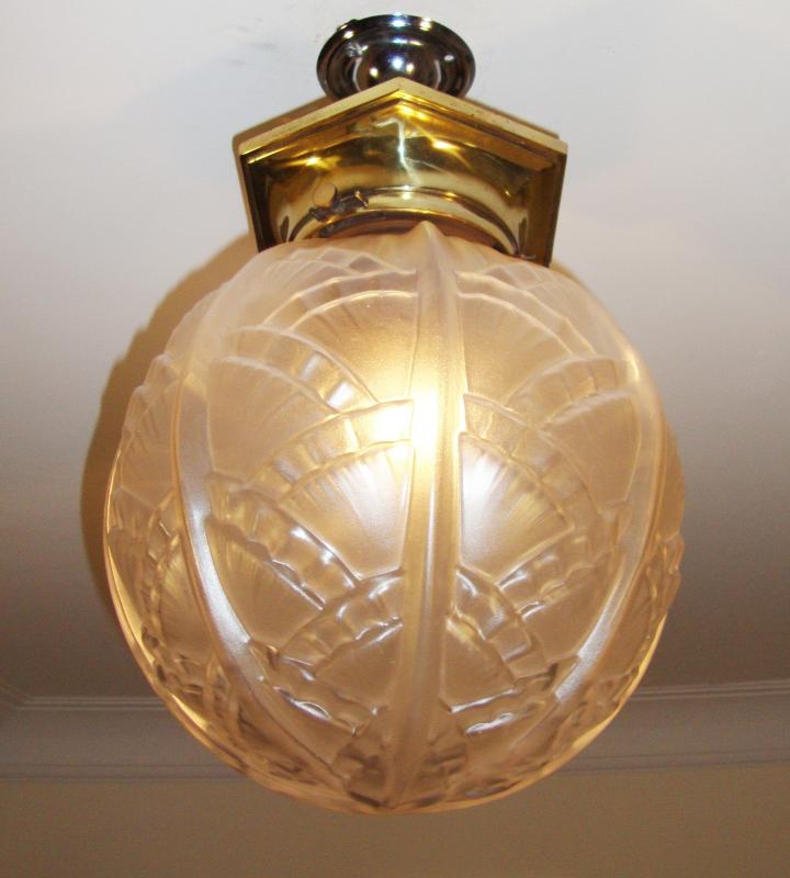 A large art deco moulded glass globe shade with heavy cast-brass flush ceiling fitment, the glass globe lampshade with an abstract geometric design. France c1930