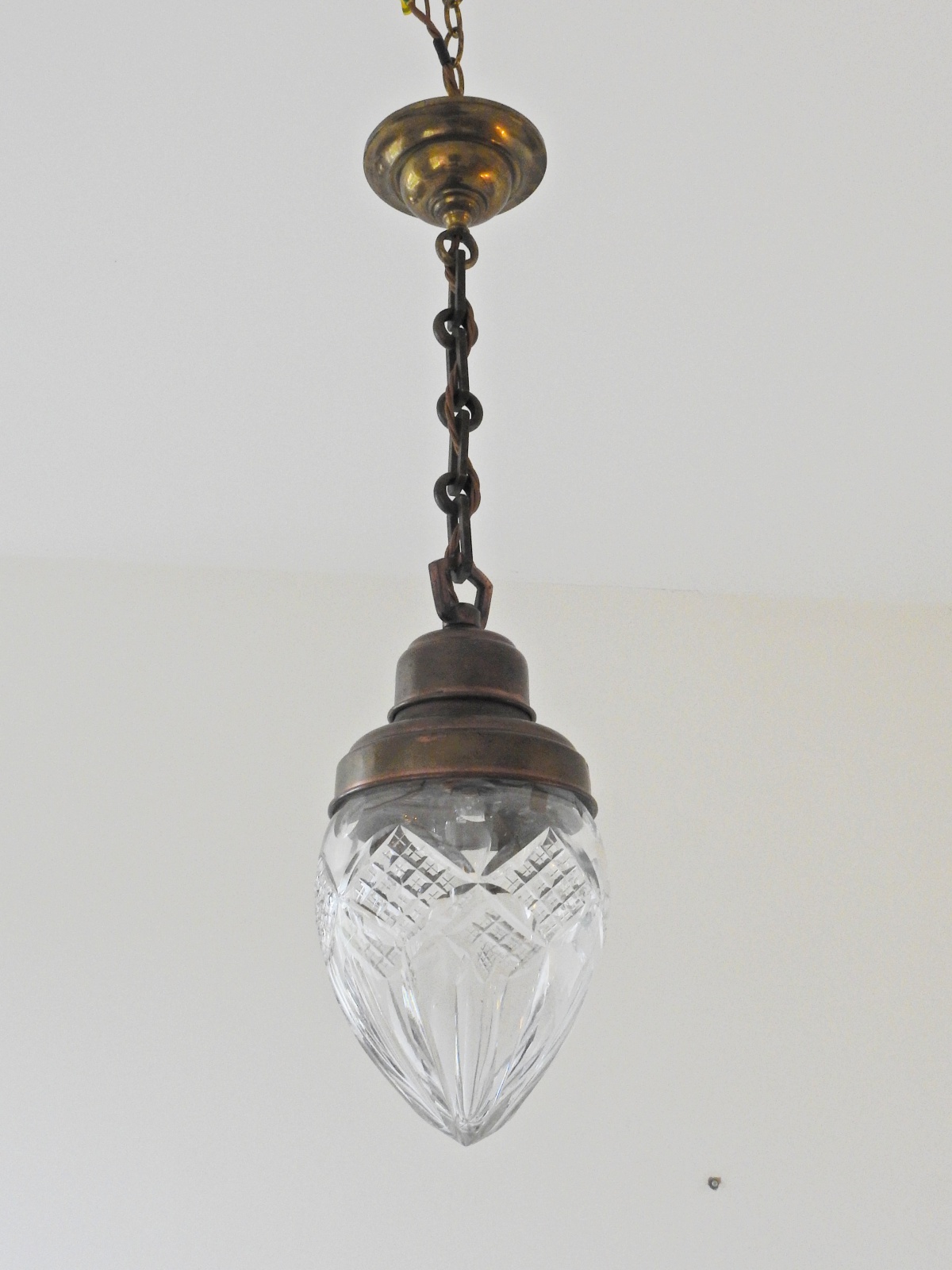 A large cut-glass “pineapple” lantern, with original oxidised brass shade carrier, chain and hook plate for suspension. England c.1905