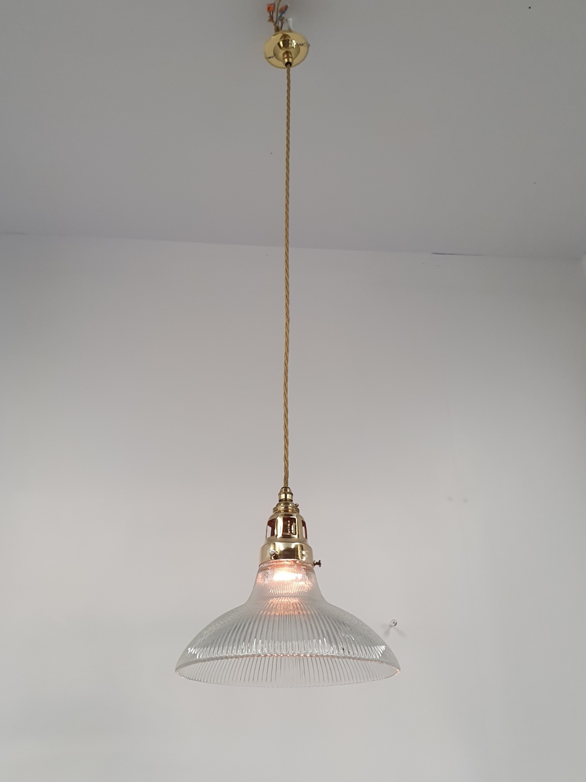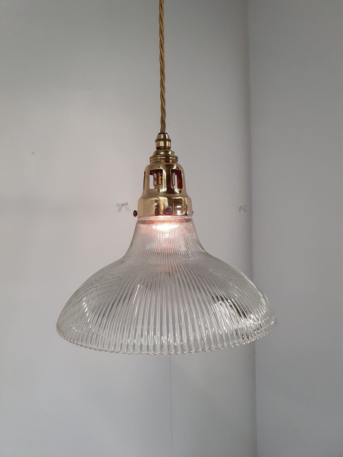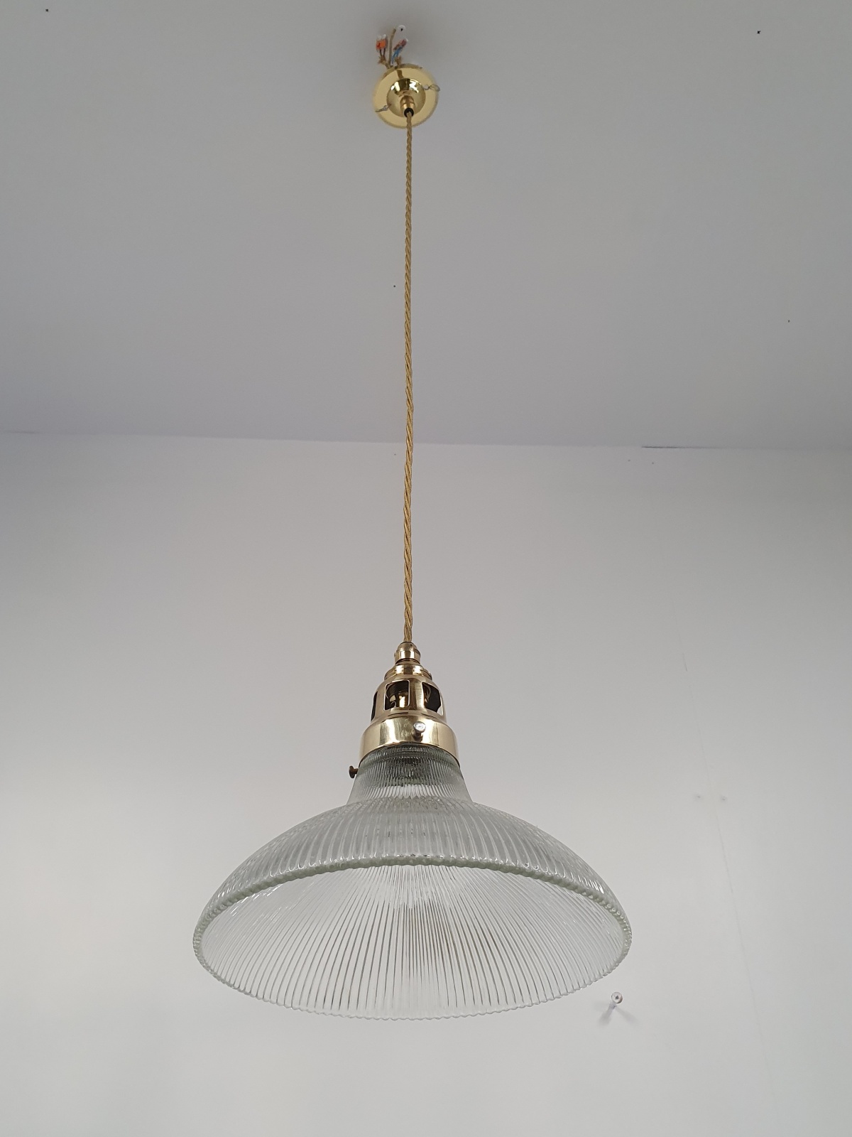 Product Code: JAL1072A Holophane (“Stiletto” prism) reflector in a rarer and larger shape, apparently unsigned, with its original period brass gallery and hung pendant from a replacement brass ceiling rose. England c.1900
