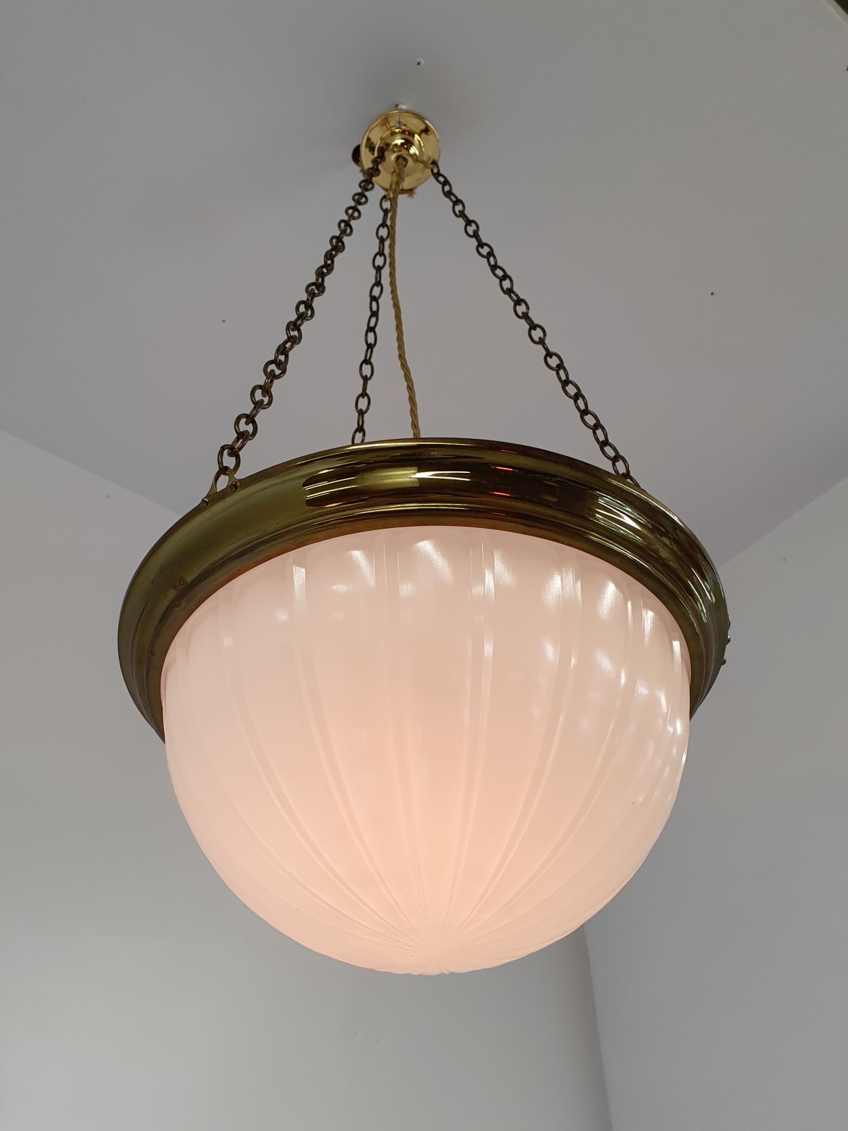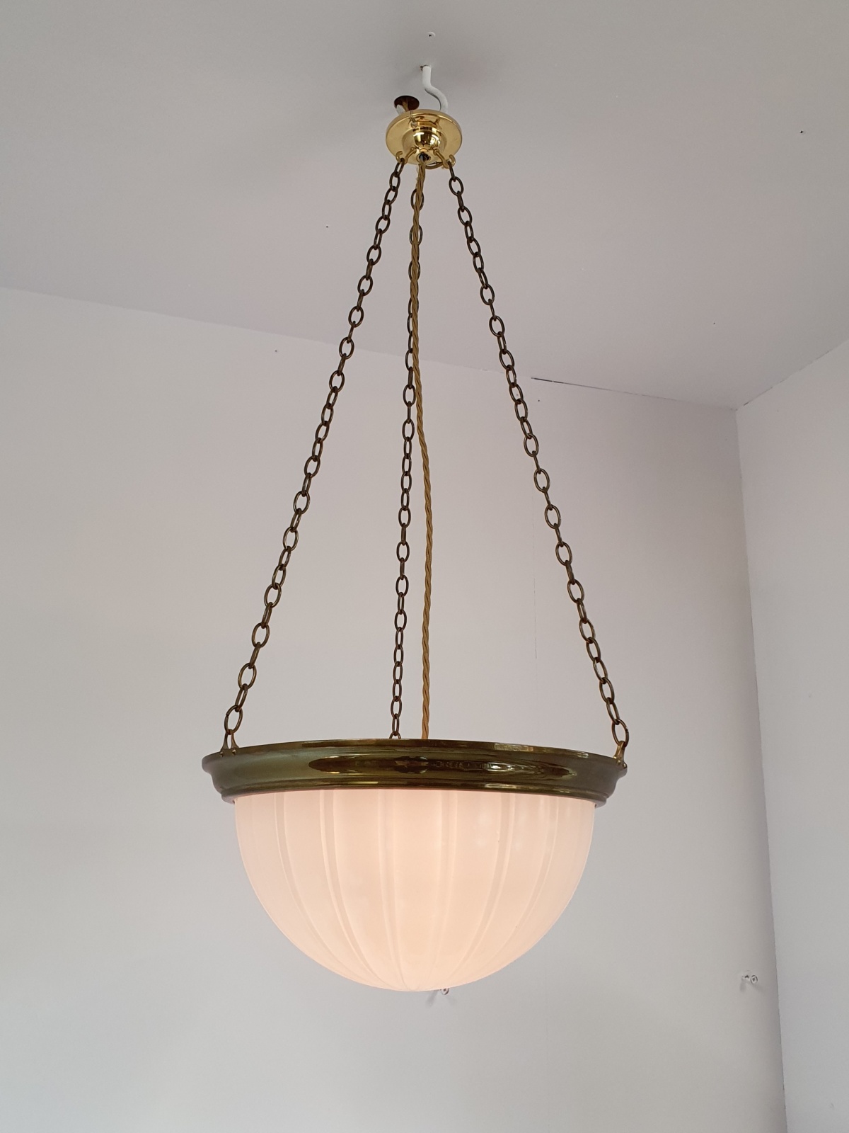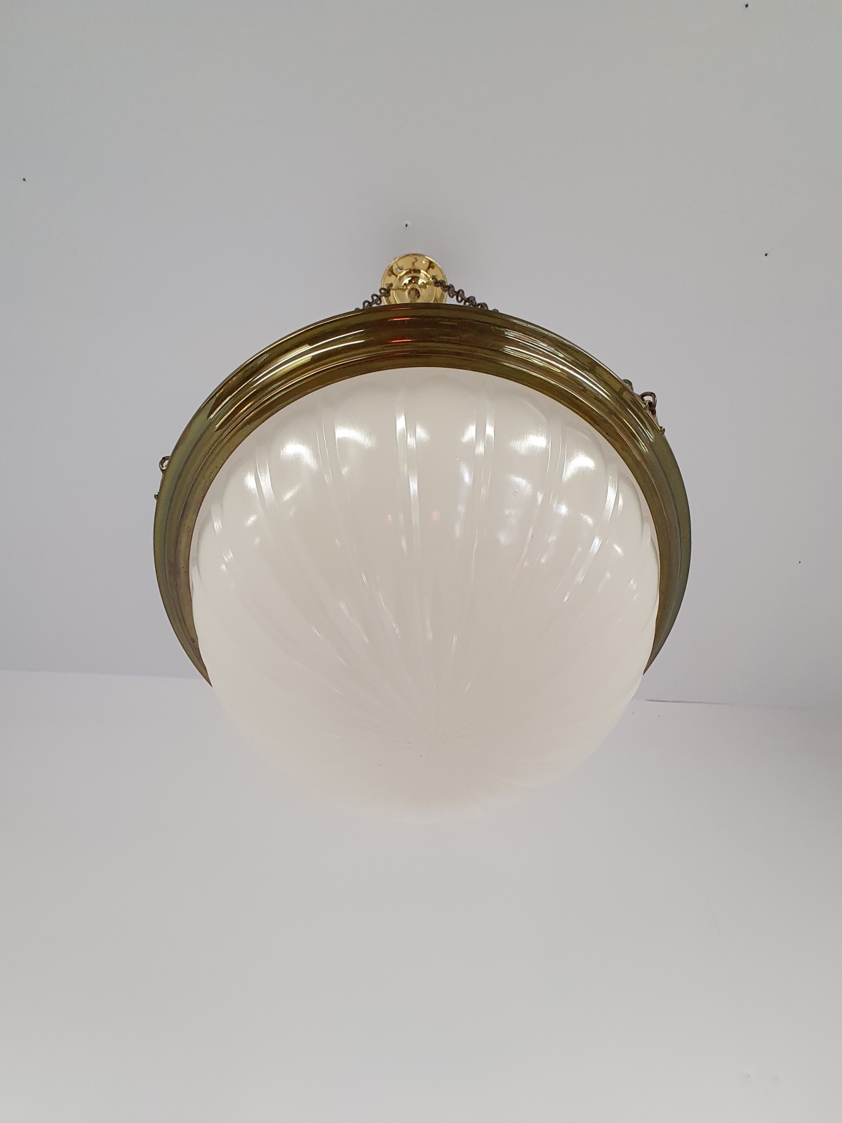 A medium size “moonstone” plafonnier set into its original brass ring. Brass chain and replacement brass ceiling rose for suspension. England c.1925