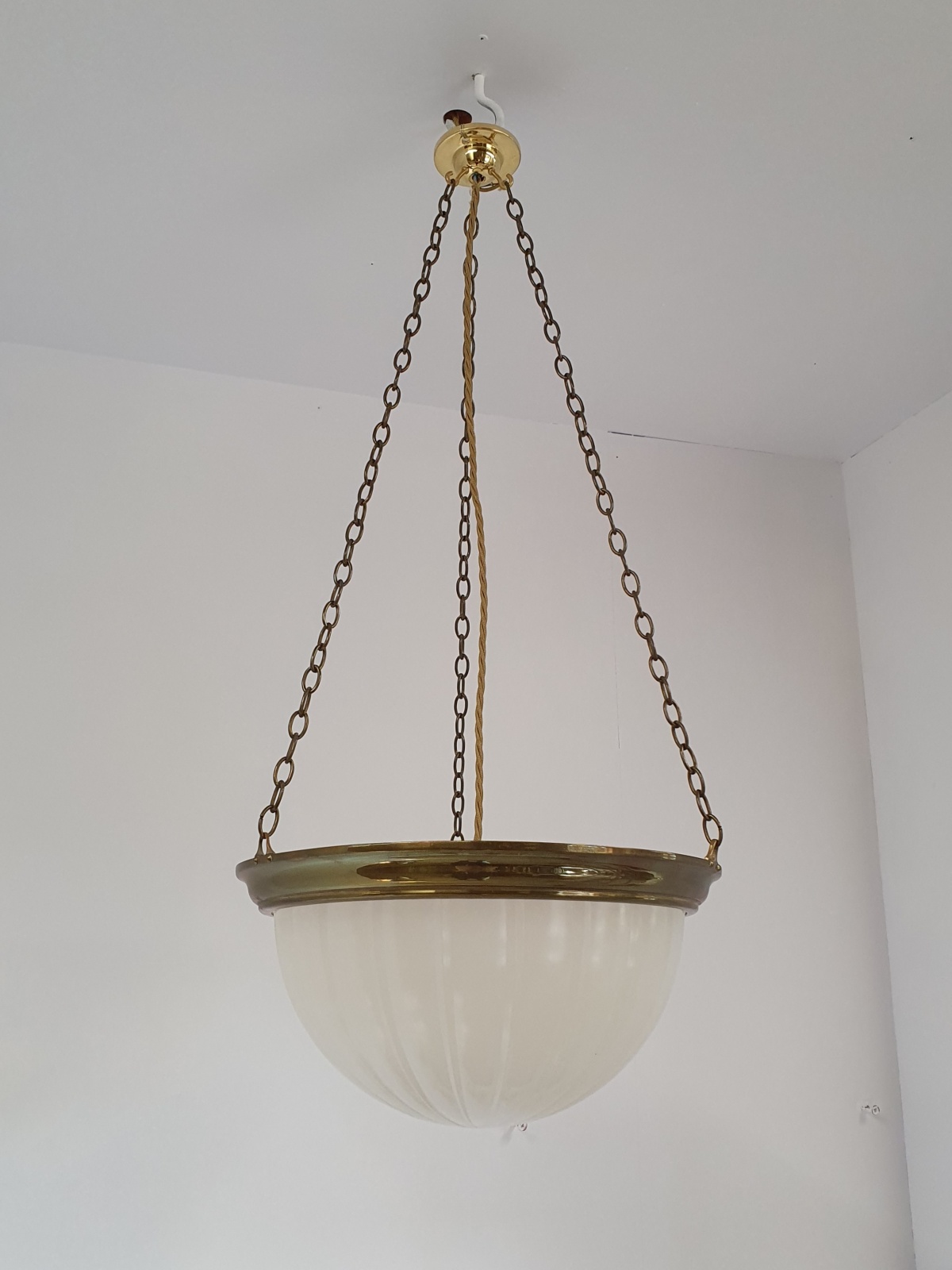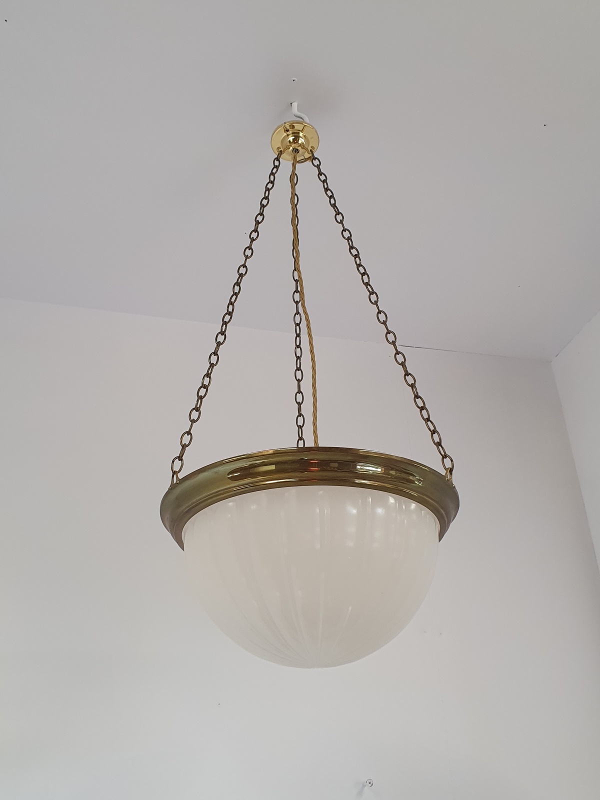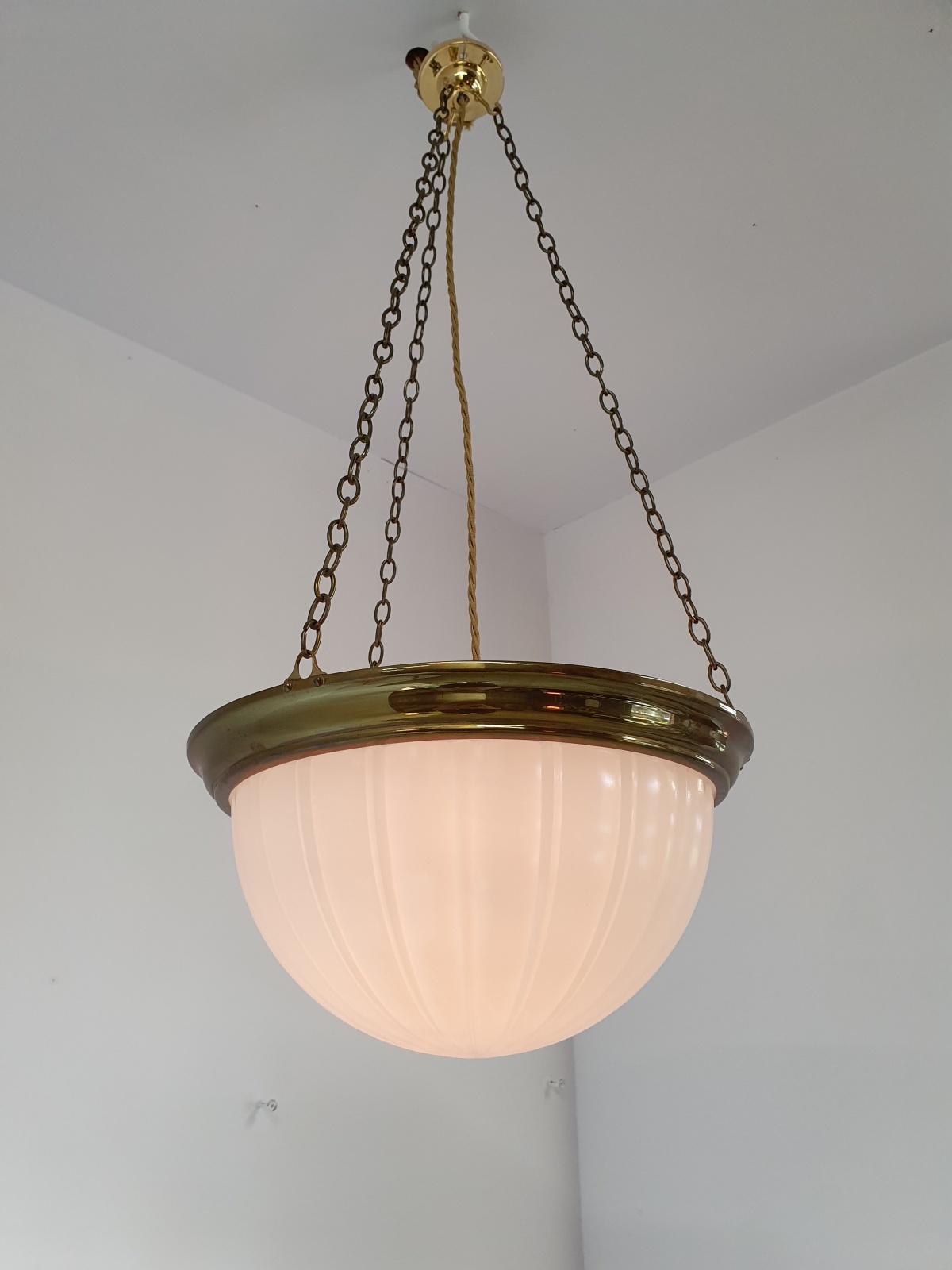 A medium size “moonstone” plafonnier set into its original brass ring. Brass chain and replacement brass ceiling rose for suspension. England c.1925