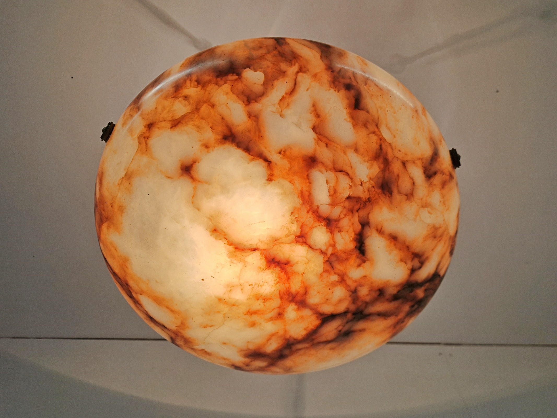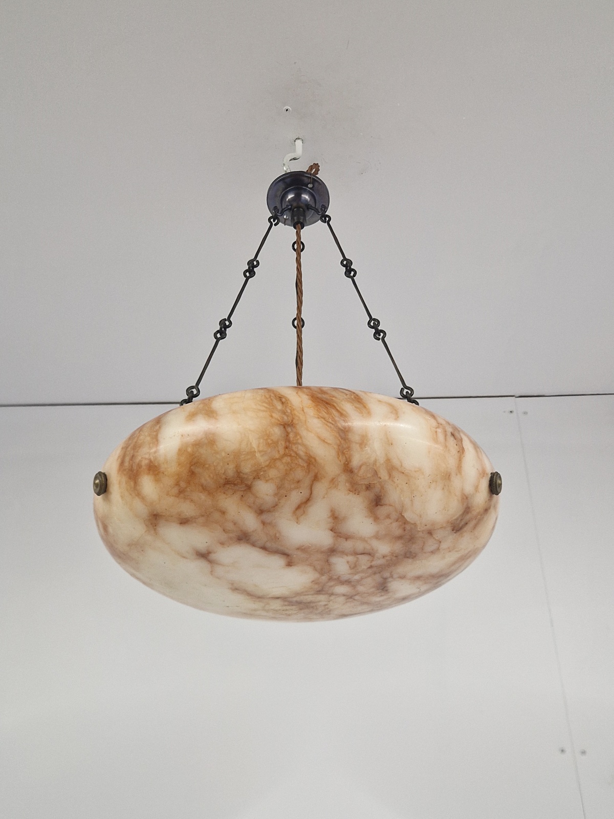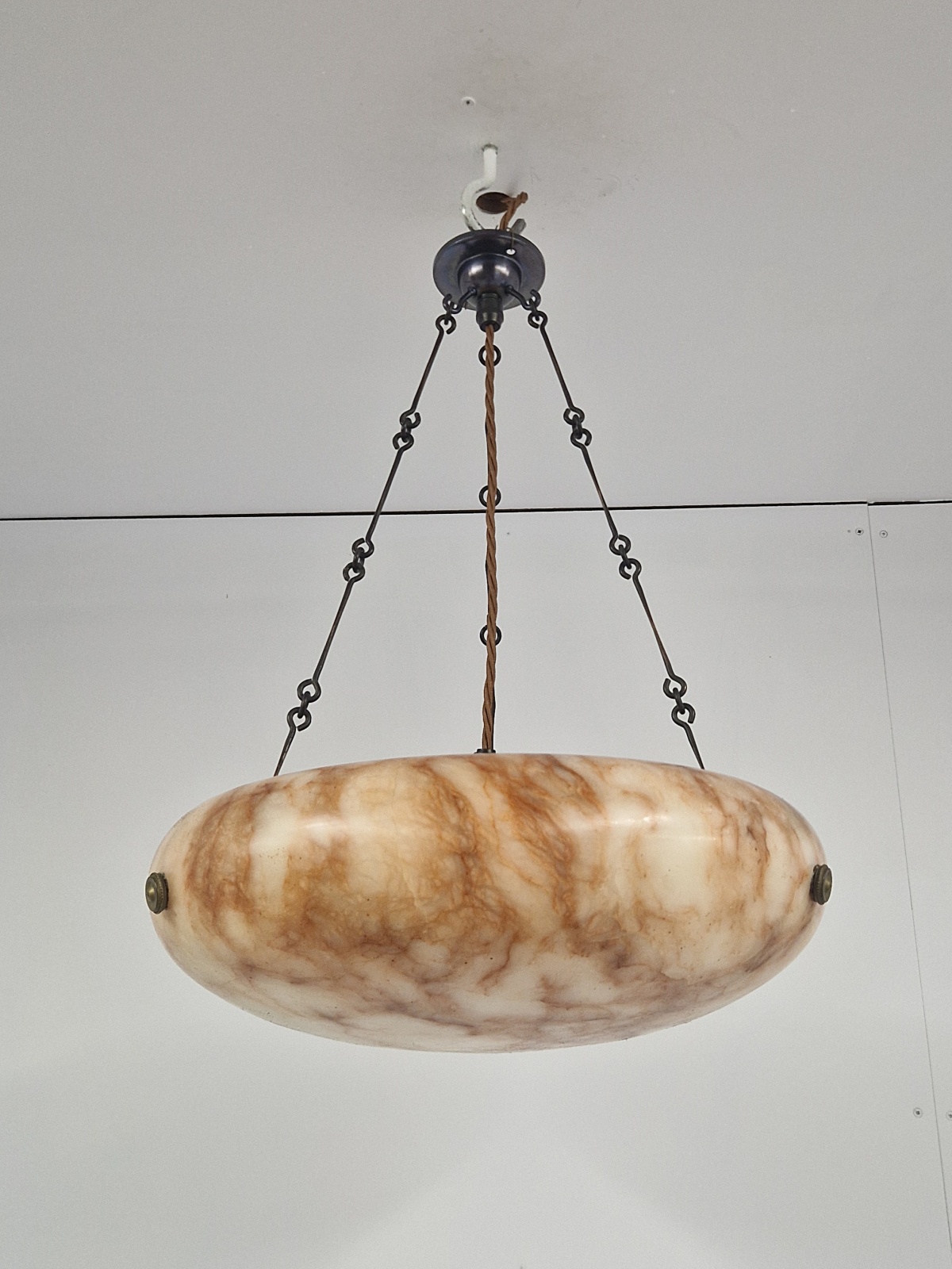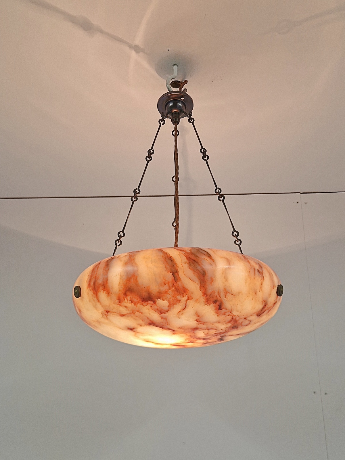 A good quality alabaster plafonnier in warm tones or cream, brown and orange, with original bronze finials, period chain and ceiling rose for suspension. France, c1920