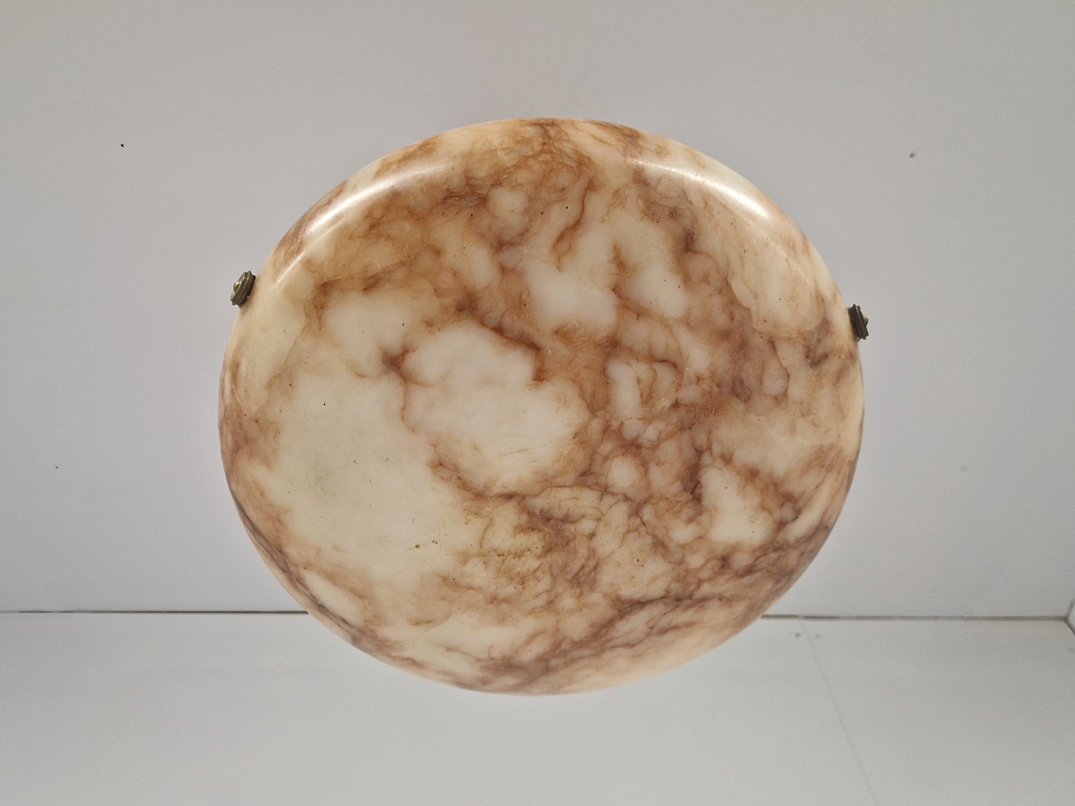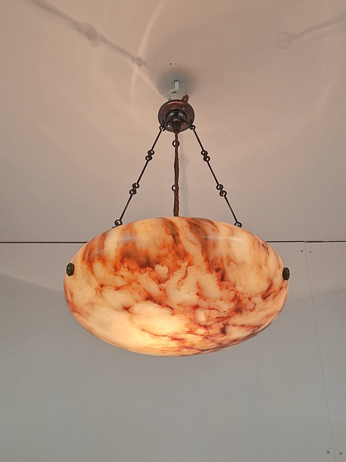 A good quality alabaster plafonnier in warm tones or cream, brown and orange, with original bronze finials, period chain and ceiling rose for suspension. France, c1920
