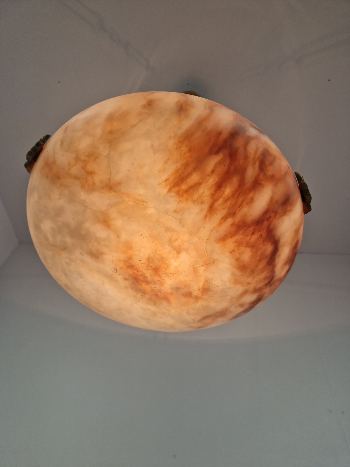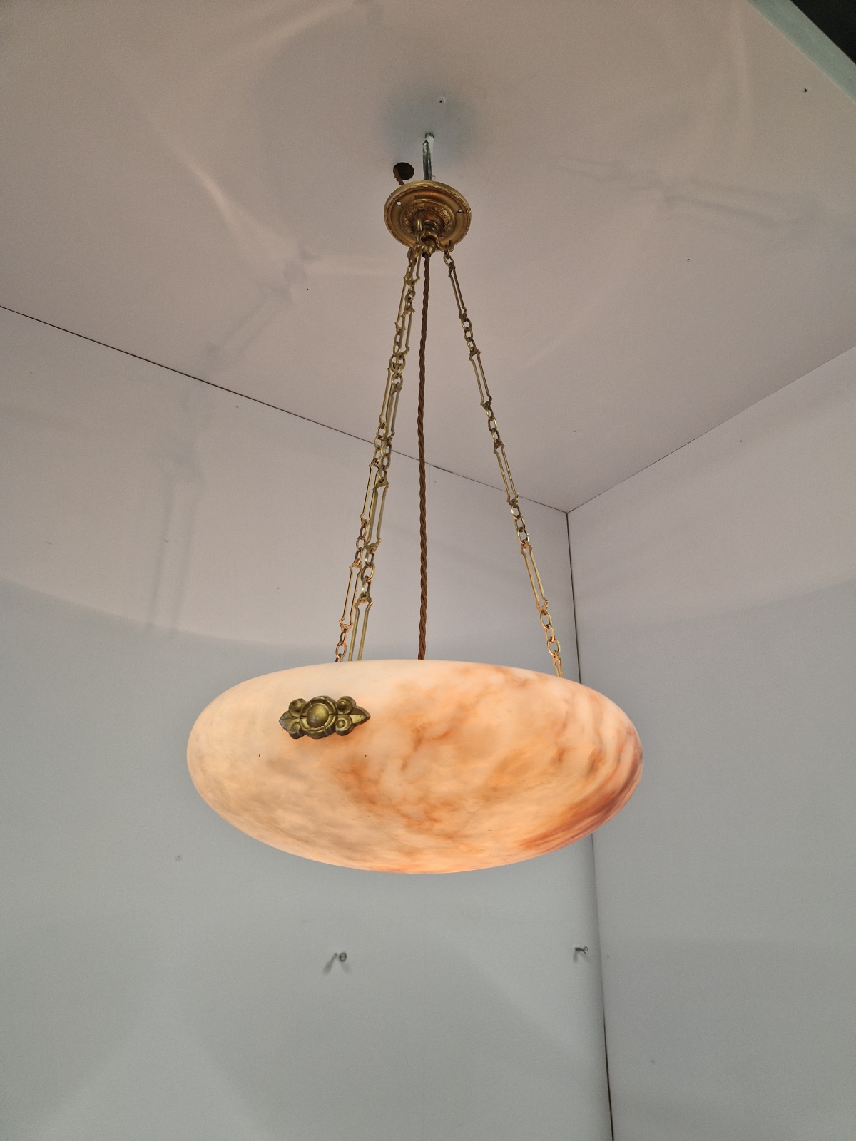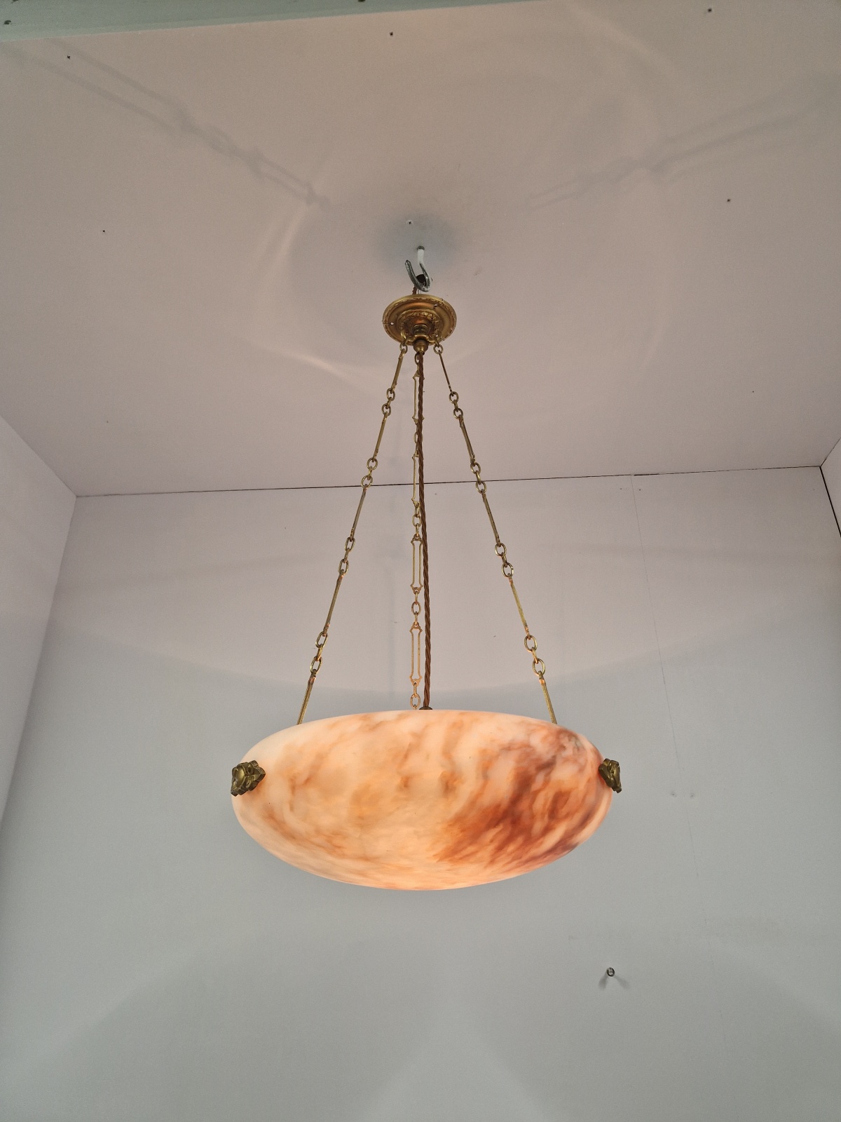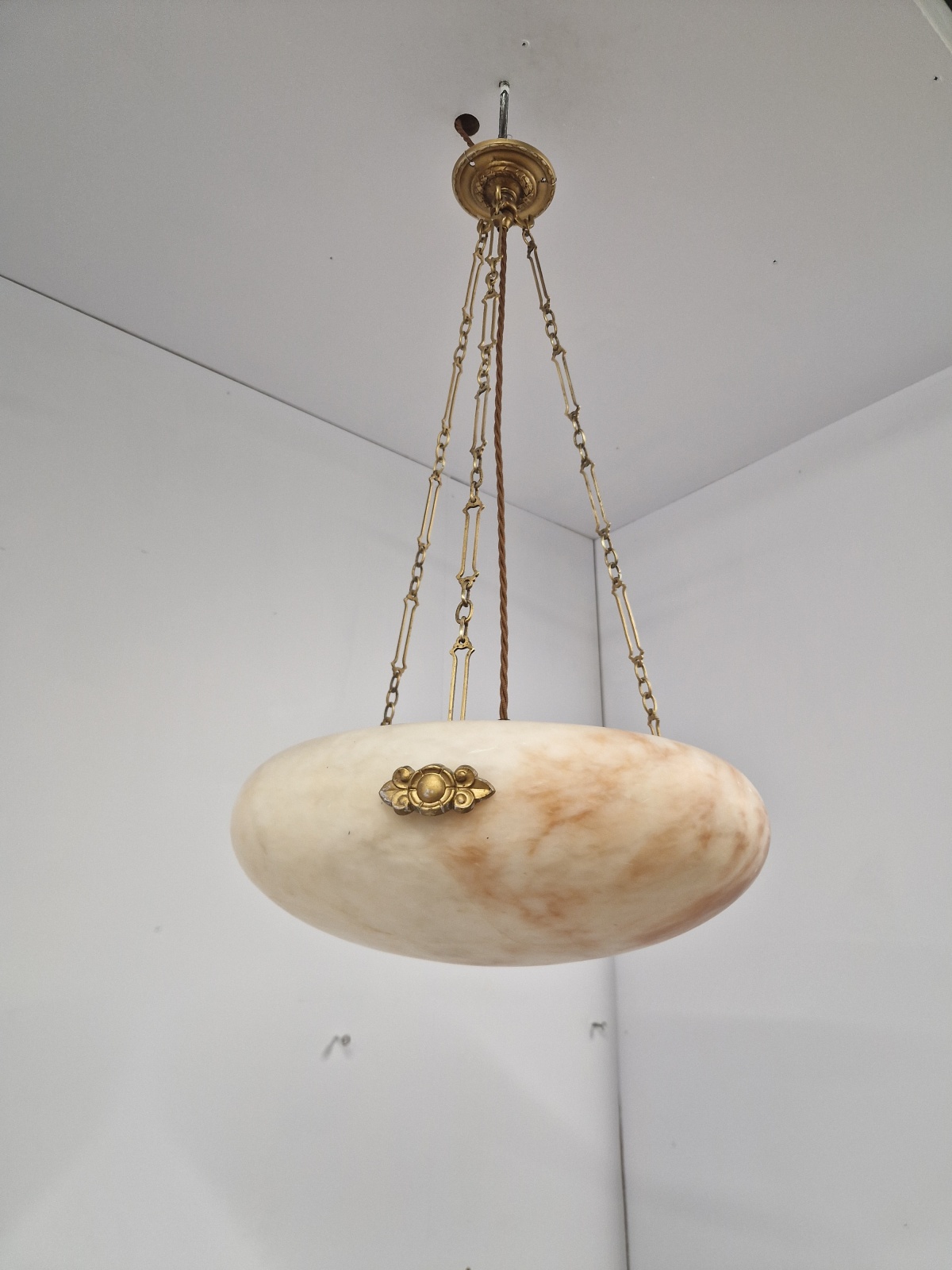 A good quality alabaster plafonnier in warm tones or cream and orange, with original neo-classical guilded finials, period chain and ceiling rose for suspension. France, c1920