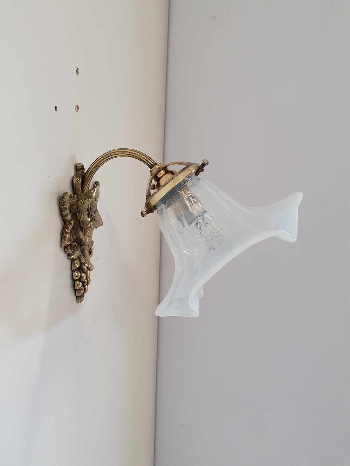 Product Code: LG571An attractive neo-classical wall light designed with grape and vine leaves and supporting a delicate French vaseline-glass lampshade. France c.1920