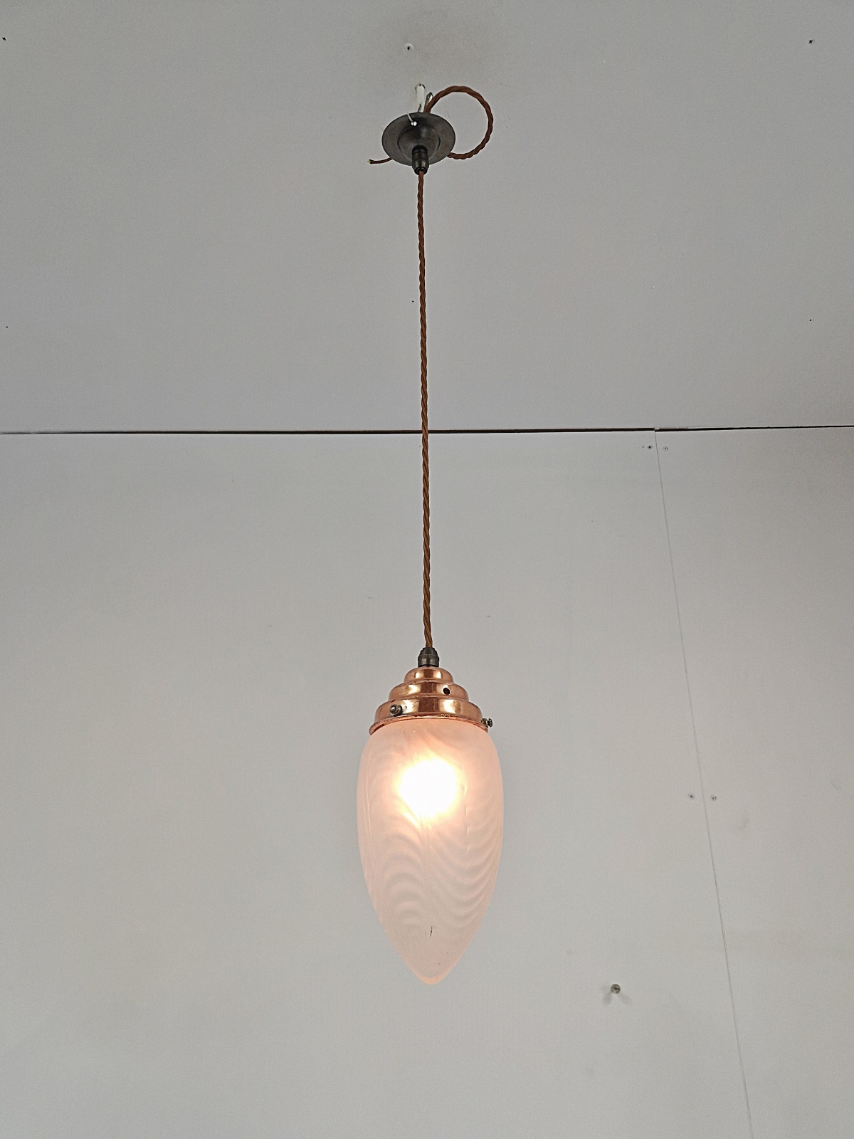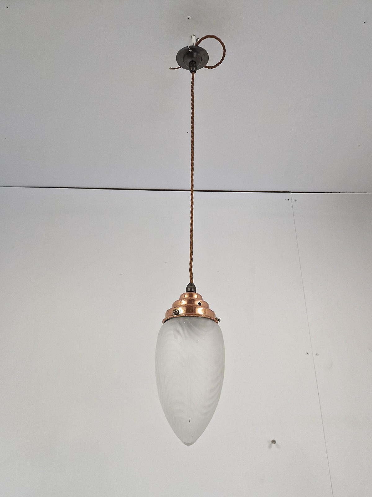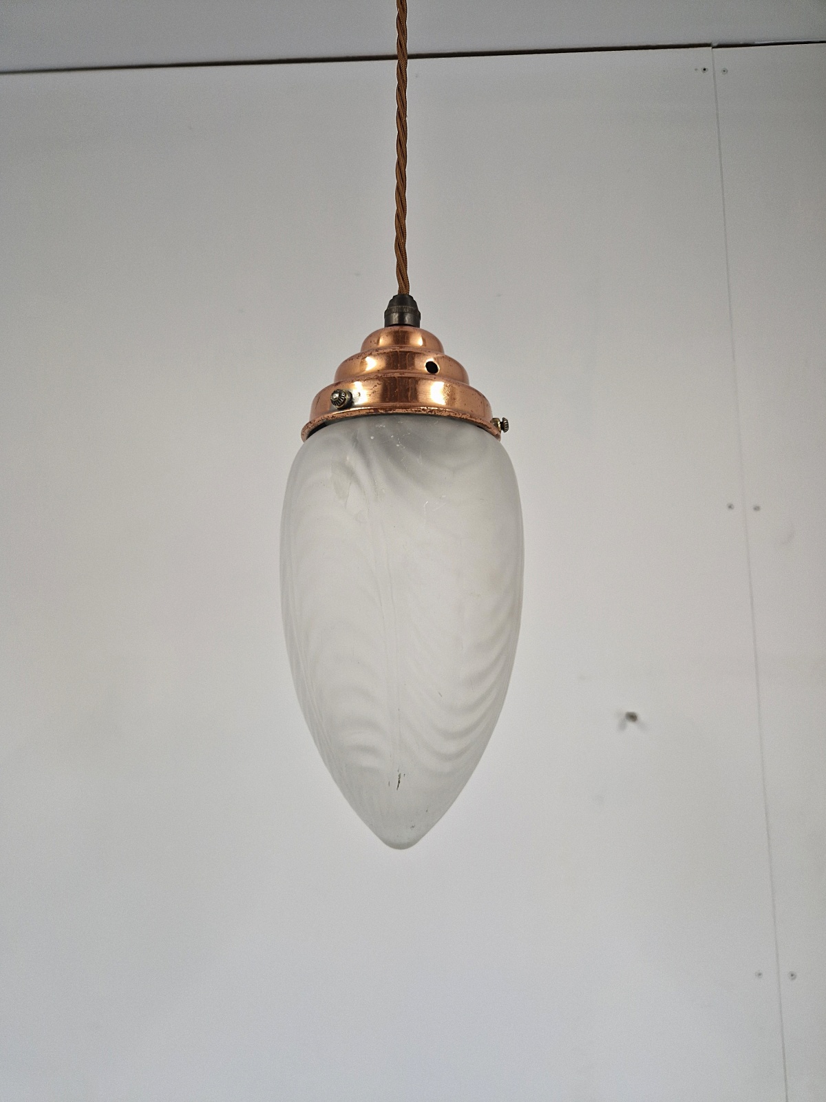 Product Code: JAL1276A satin-glass arts and crafts lampshade with original copper gallery and replacement ceiling rose for suspension. English, c.1900