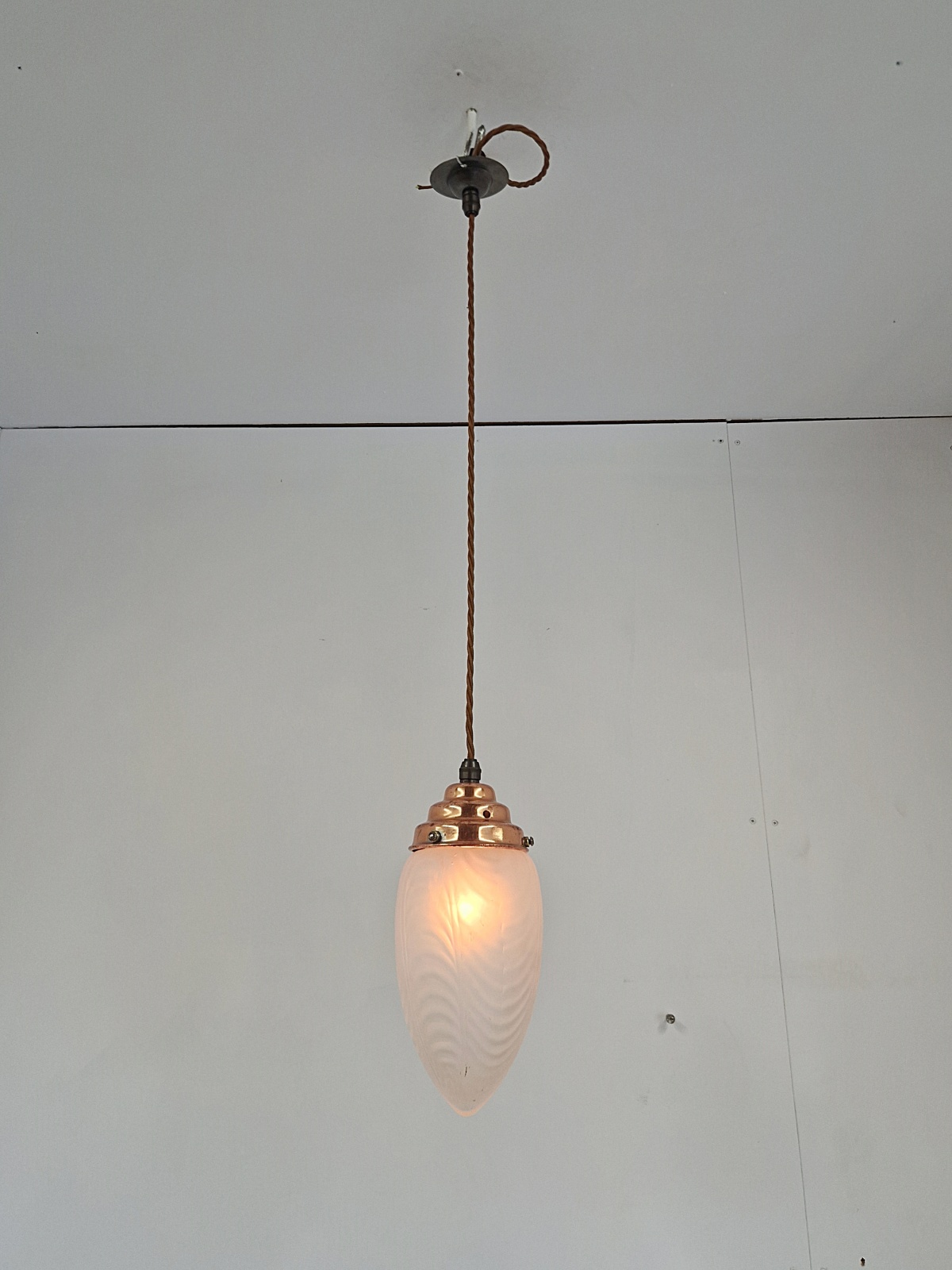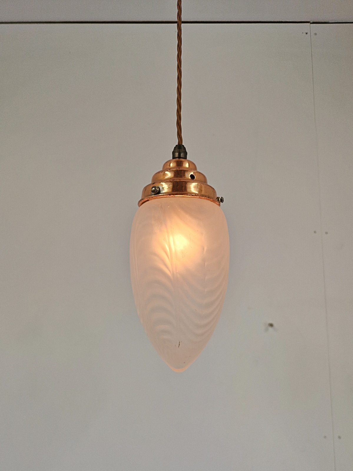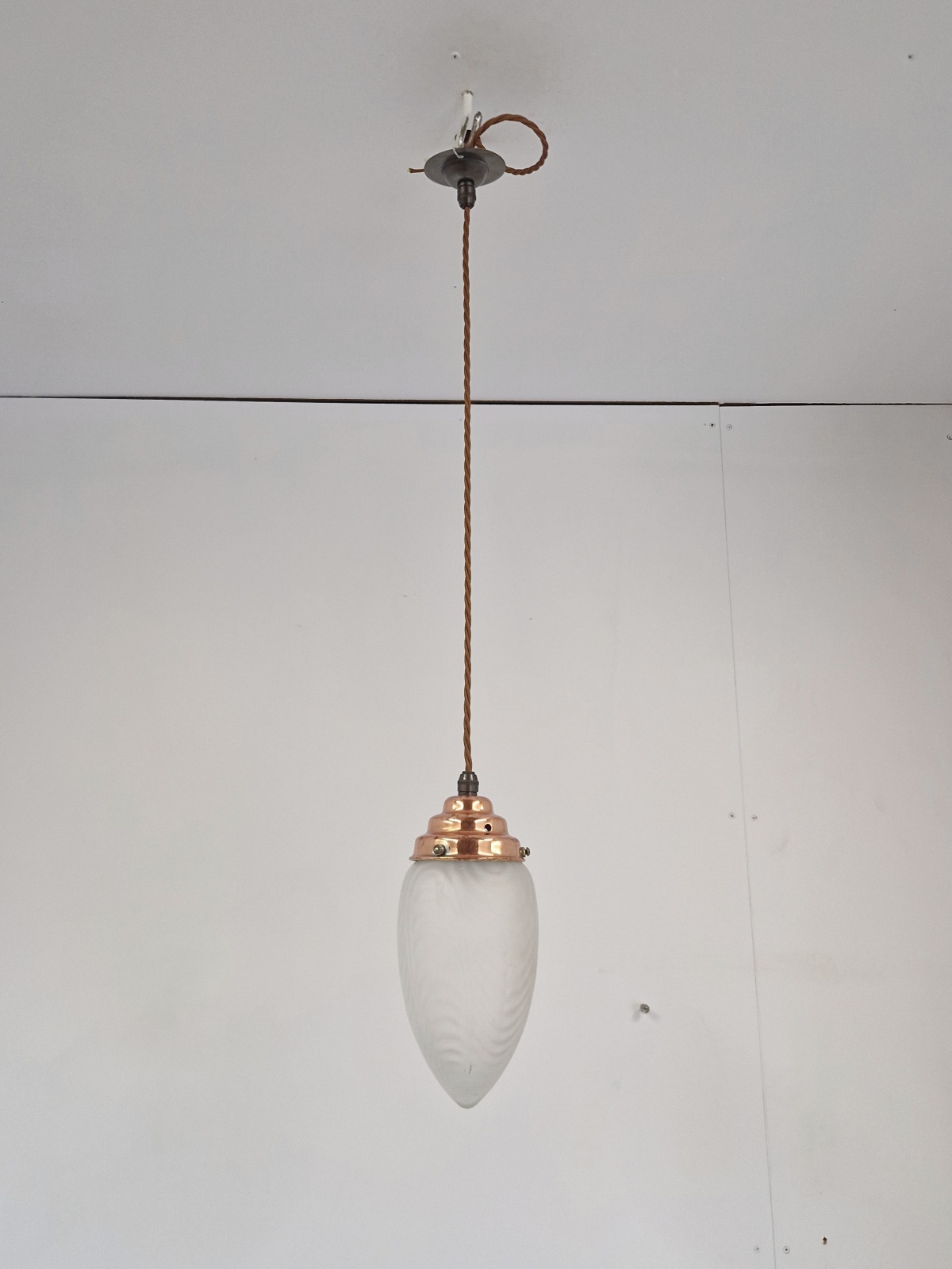 Product Code: JAL1276A satin-glass arts and crafts lampshade with original copper gallery and replacement ceiling rose for suspension. English, c.1900