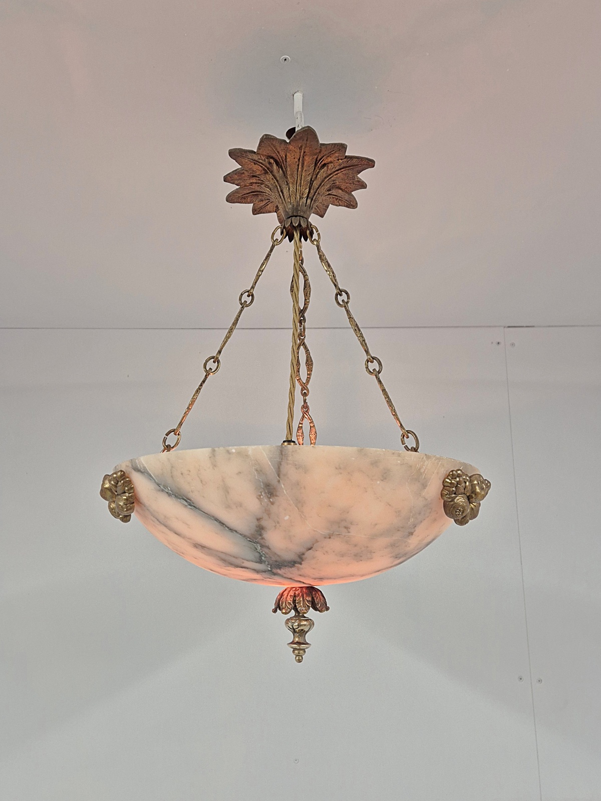 Product Code: LG252A small decorative neoclassical alabaster plafonnier with central finial. Orignal period bowl hooks chain and ceiling rose for suspension. France early c20th
