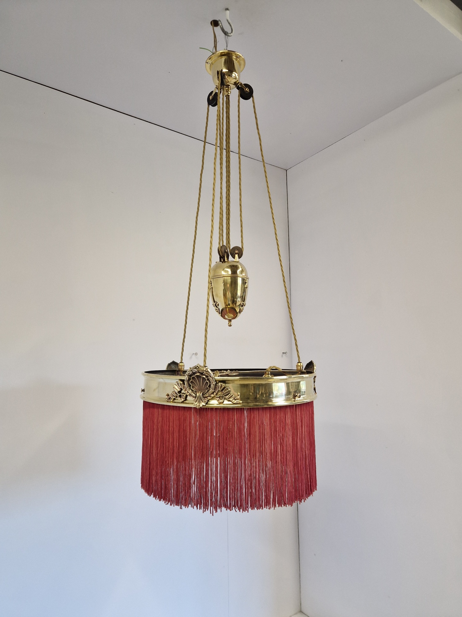 Product Code: JAL1169A fine example of a circular brass rise & fall chandelier designed in soft neo-classical style displayed with original red-tassled fringe. England c.1915