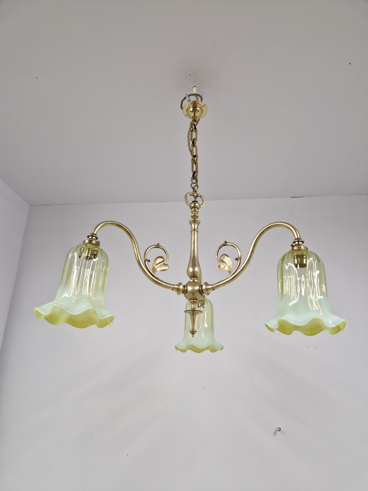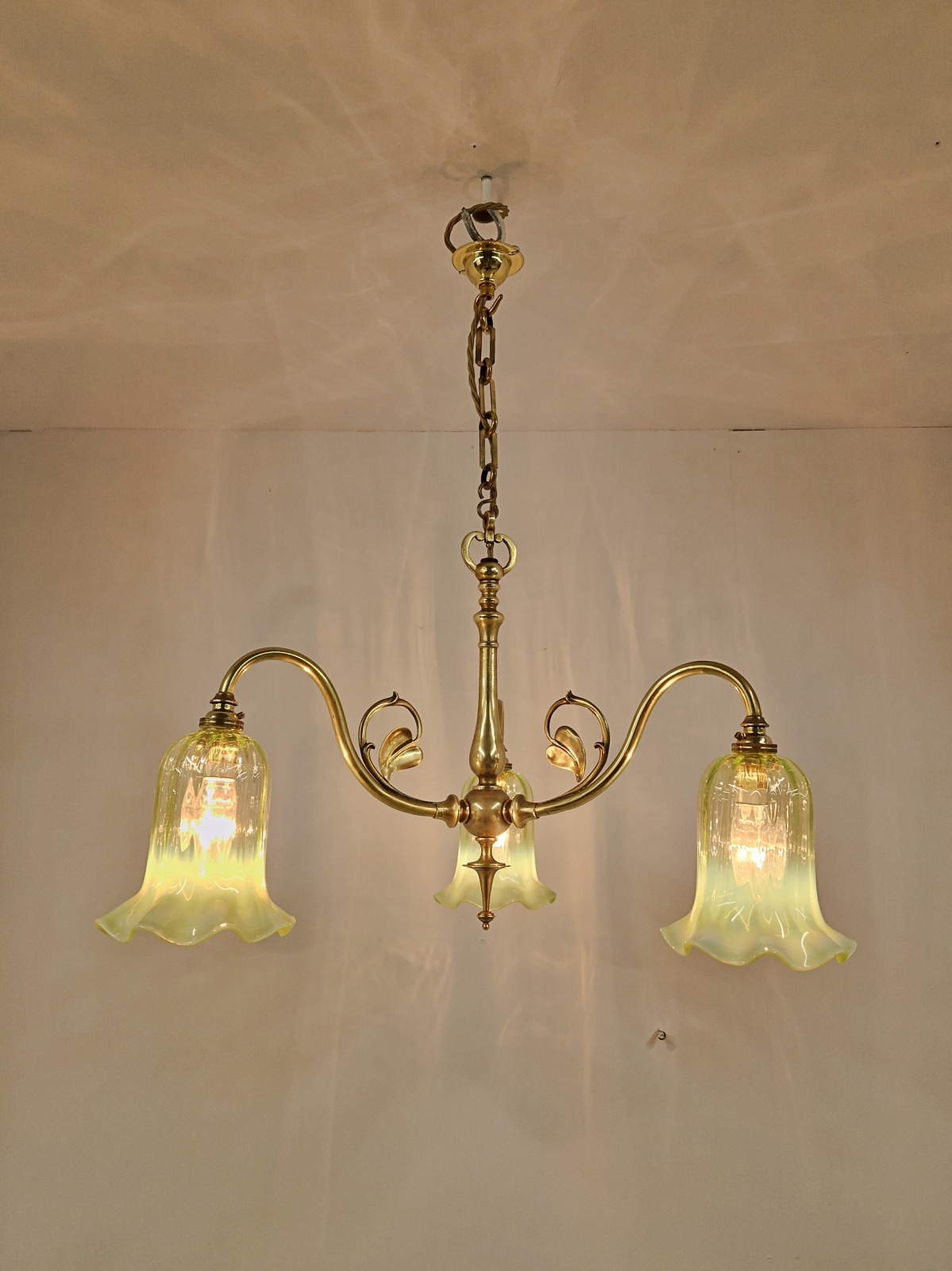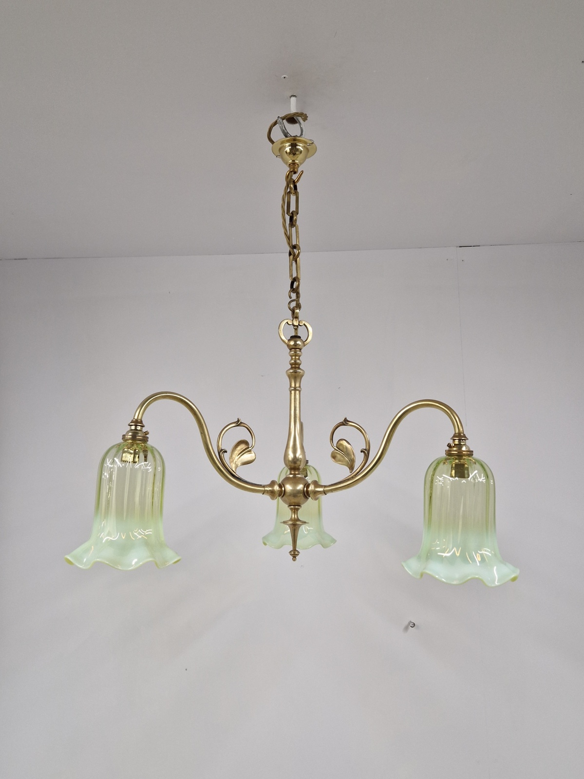 Product Code: JAL1136NS009A traditional brass three-arm ceiling fitting designed in a simple art nouveau style by an unknown designer complimented with reproduction vaseline-glass lampshade. Original period chain and replacement ceiling hook for suspension. England c.1920